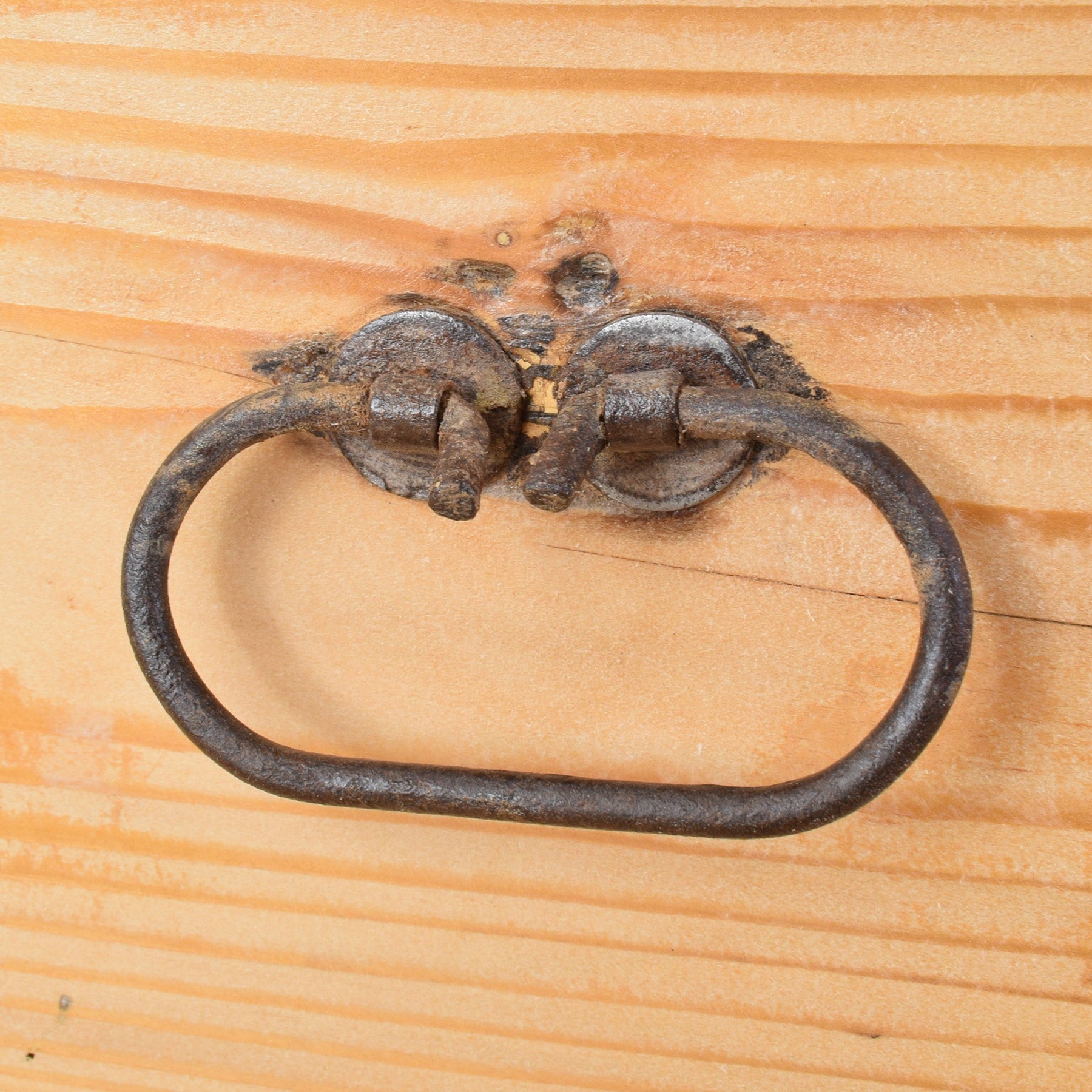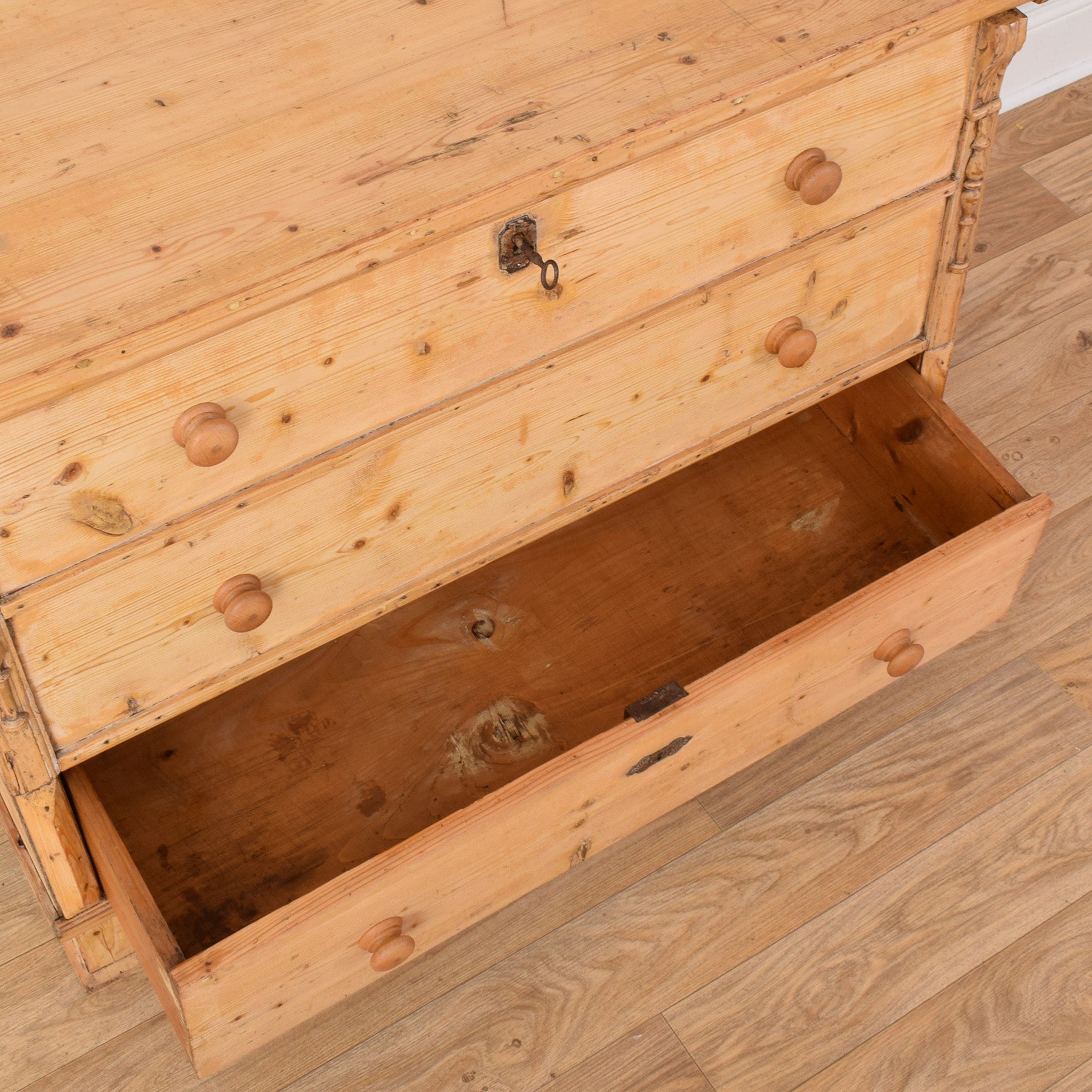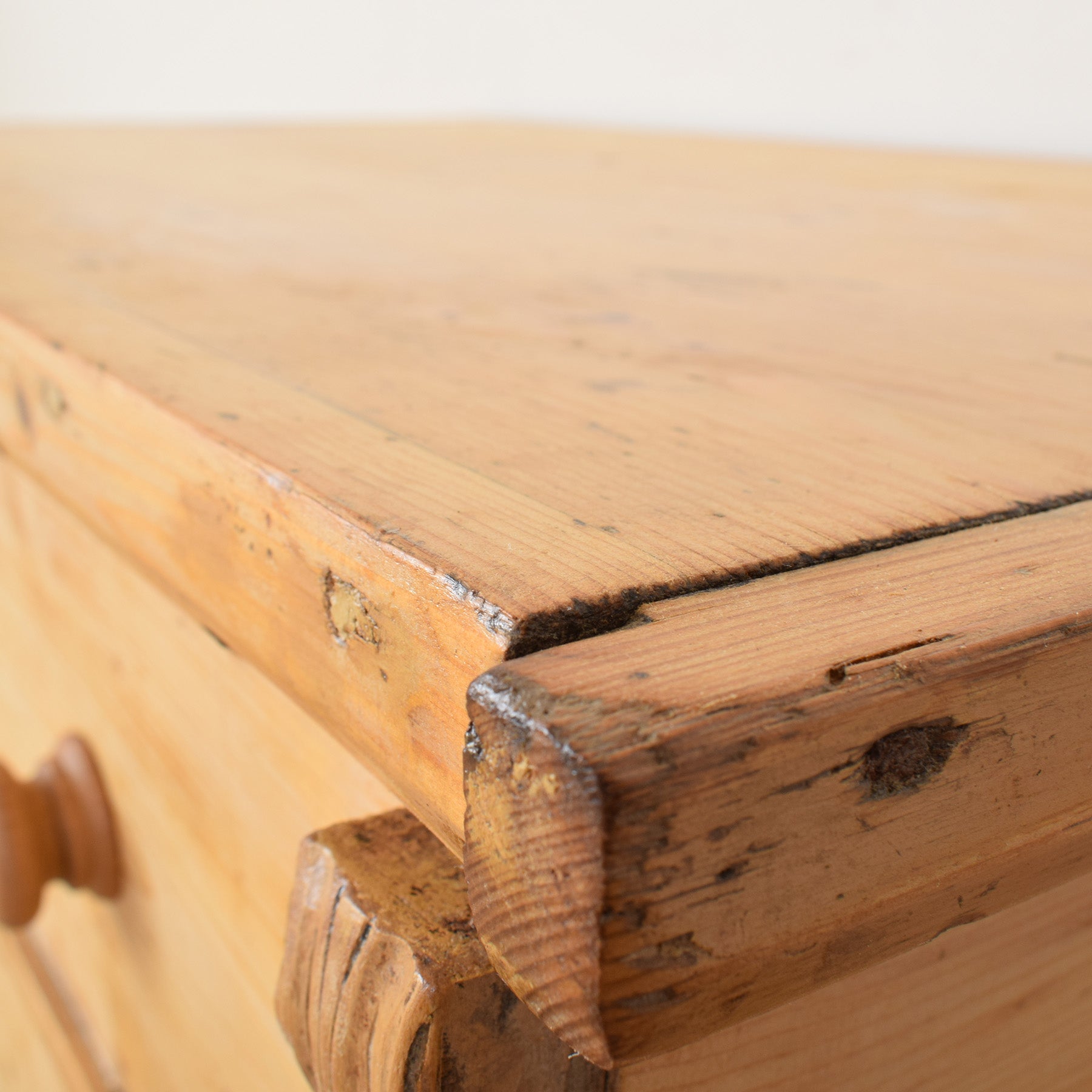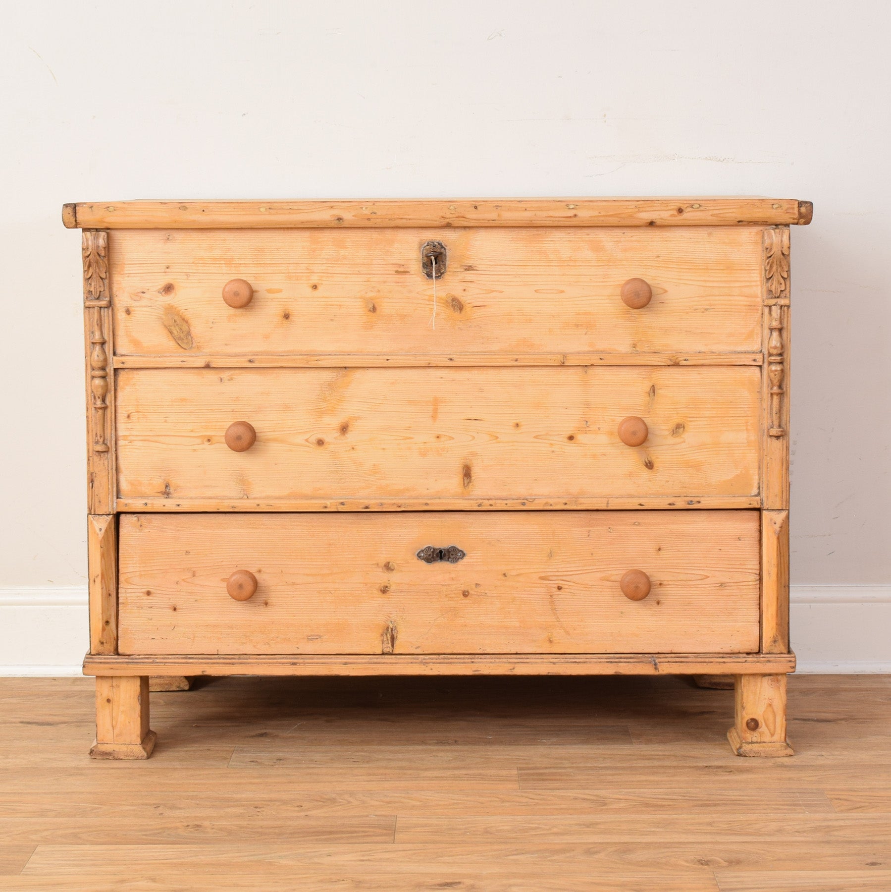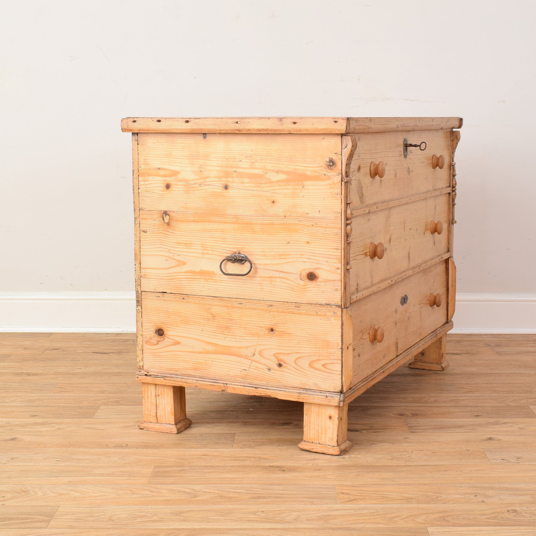 The previous darker finish has been stripped back, and the chest has been carefully sanded before multiple coats of hard-wearing matte lacquer were applied. This provides a durable, long-lasting finish while highlighting the natural grain of the pine. There are age-related marks and small dents throughout, which are consistent with the piece’s history and add to its overall character. This item is made entirely from solid pine.