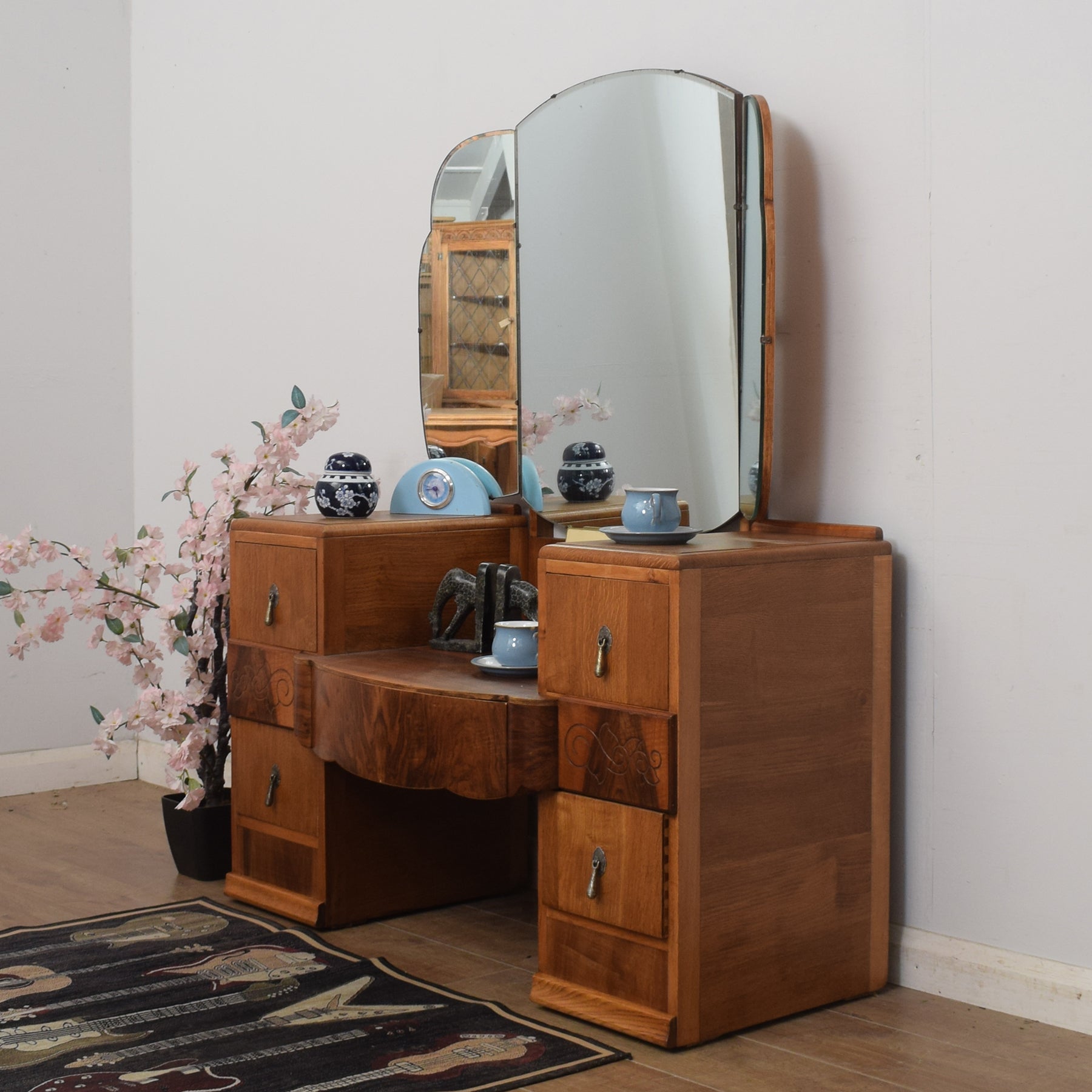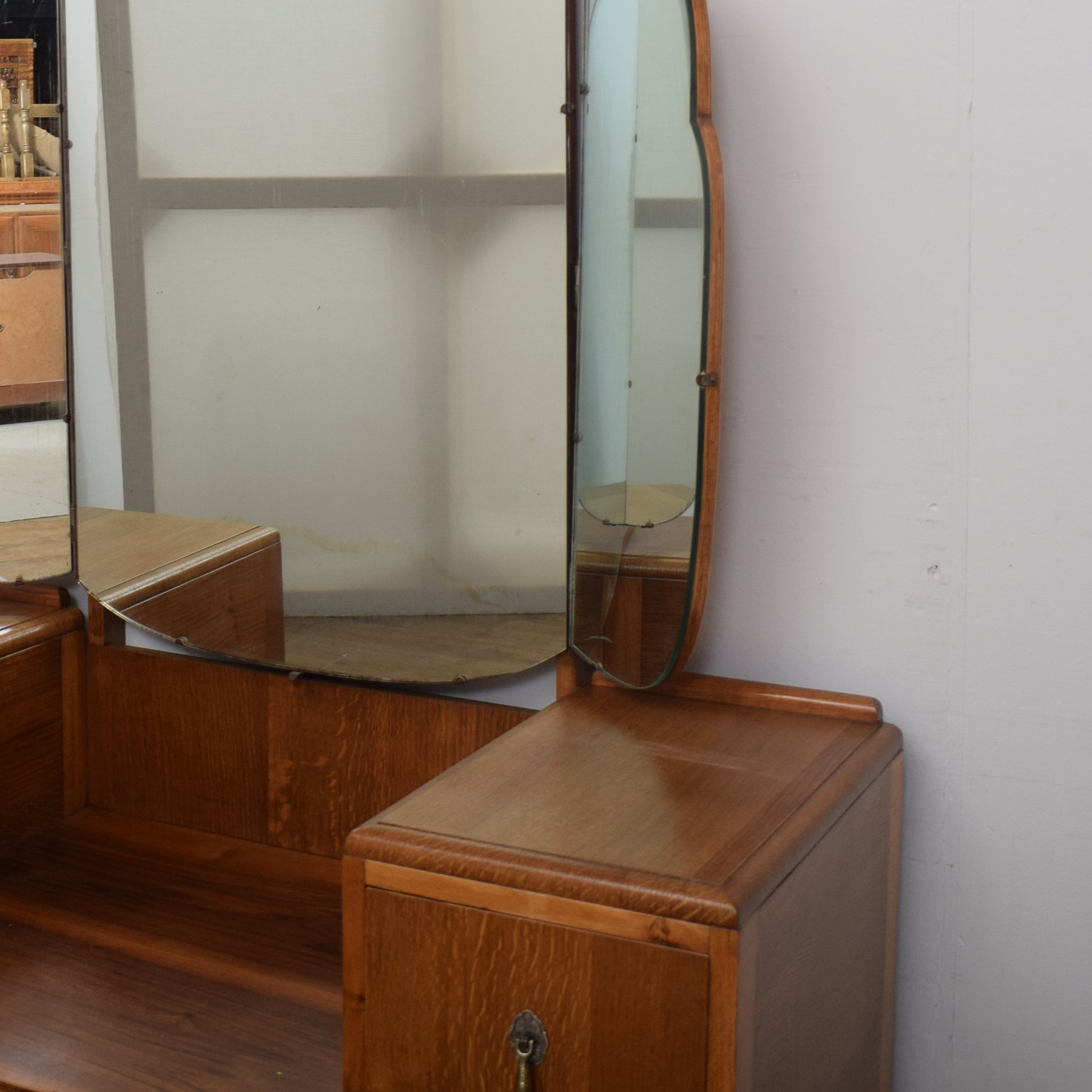 This vintage dressing table features a large central mirror, flanked by folding mirrors on either side, to ensure every angle is covered. The base of this dressing table has a stepped top with a central storage drawer that is fronted by attractive walnut veneer. The pedestals on either side have two storage drawers, with attractive drop handles and a carved central panel adding to the visual appeal. The height of the pedestals is 71cm and the central table surface is 48cm.