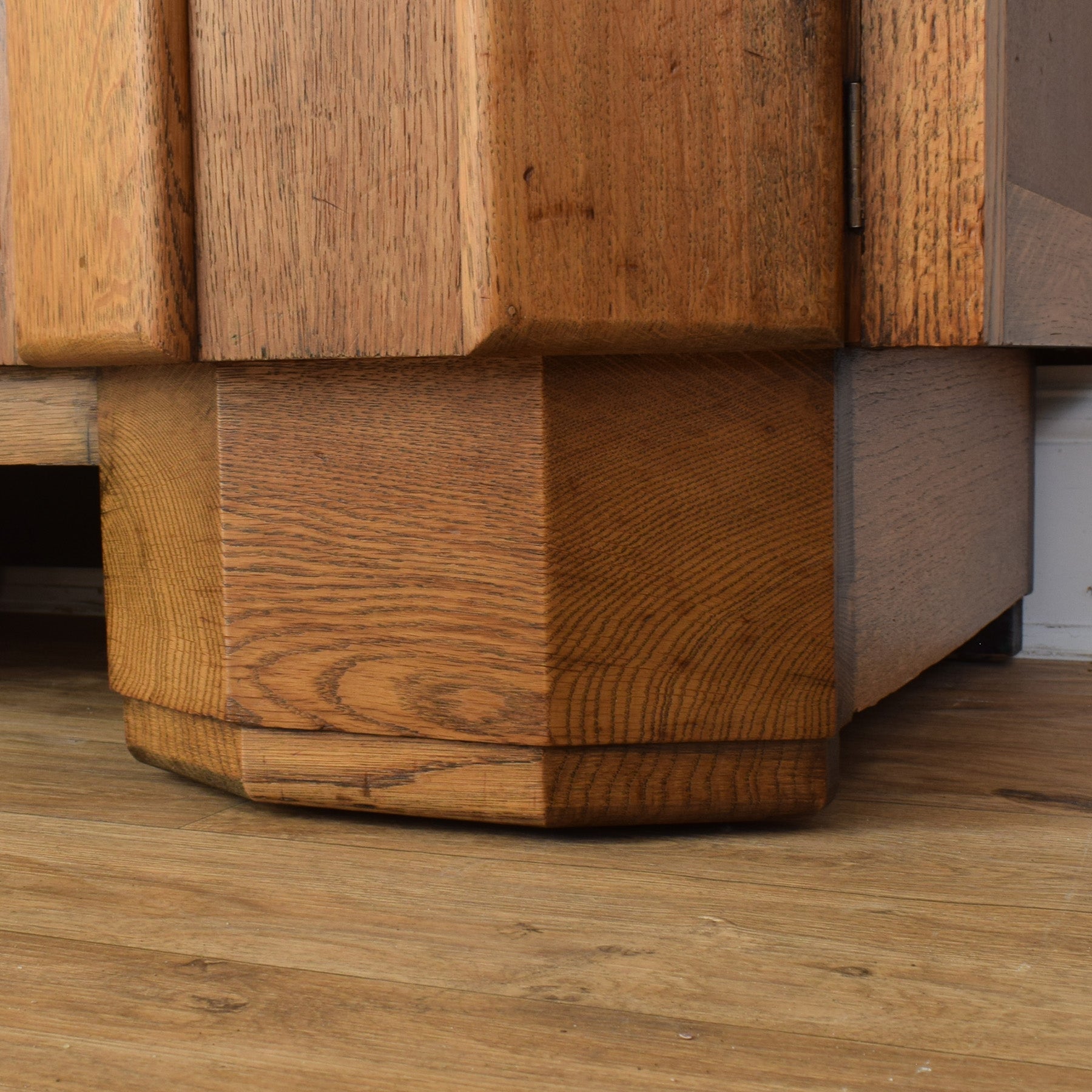 This Art Deco sideboard is a striking example of that design style, with its strong geometric form and distinctive stepped edges. The central section features two drawers above a cupboard, offering convenient storage for smaller household items, while the shaped side cupboards add further concealed space. The faceted panels, rounded corner supports, and subtle carved detailing across the door fronts highlight the craftsmanship of the piece. The solid wooden handles complement the clean lines of the design, while the broad top surface provides plenty of space for display pieces, lighting, or decorative items.