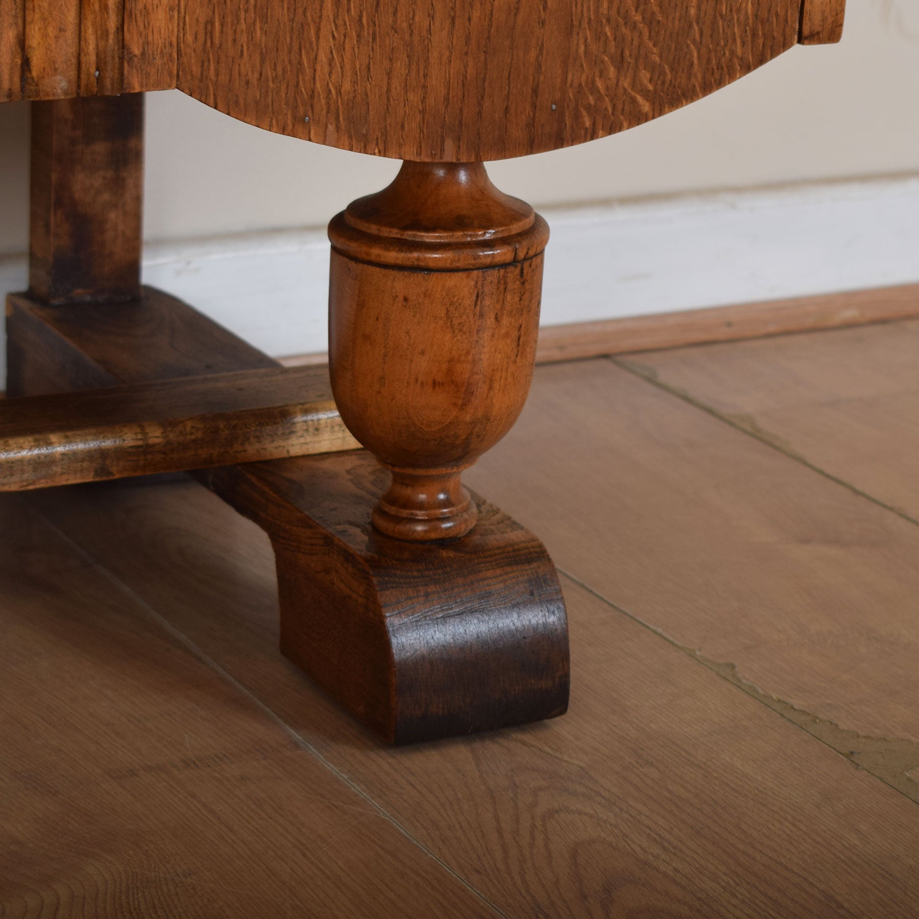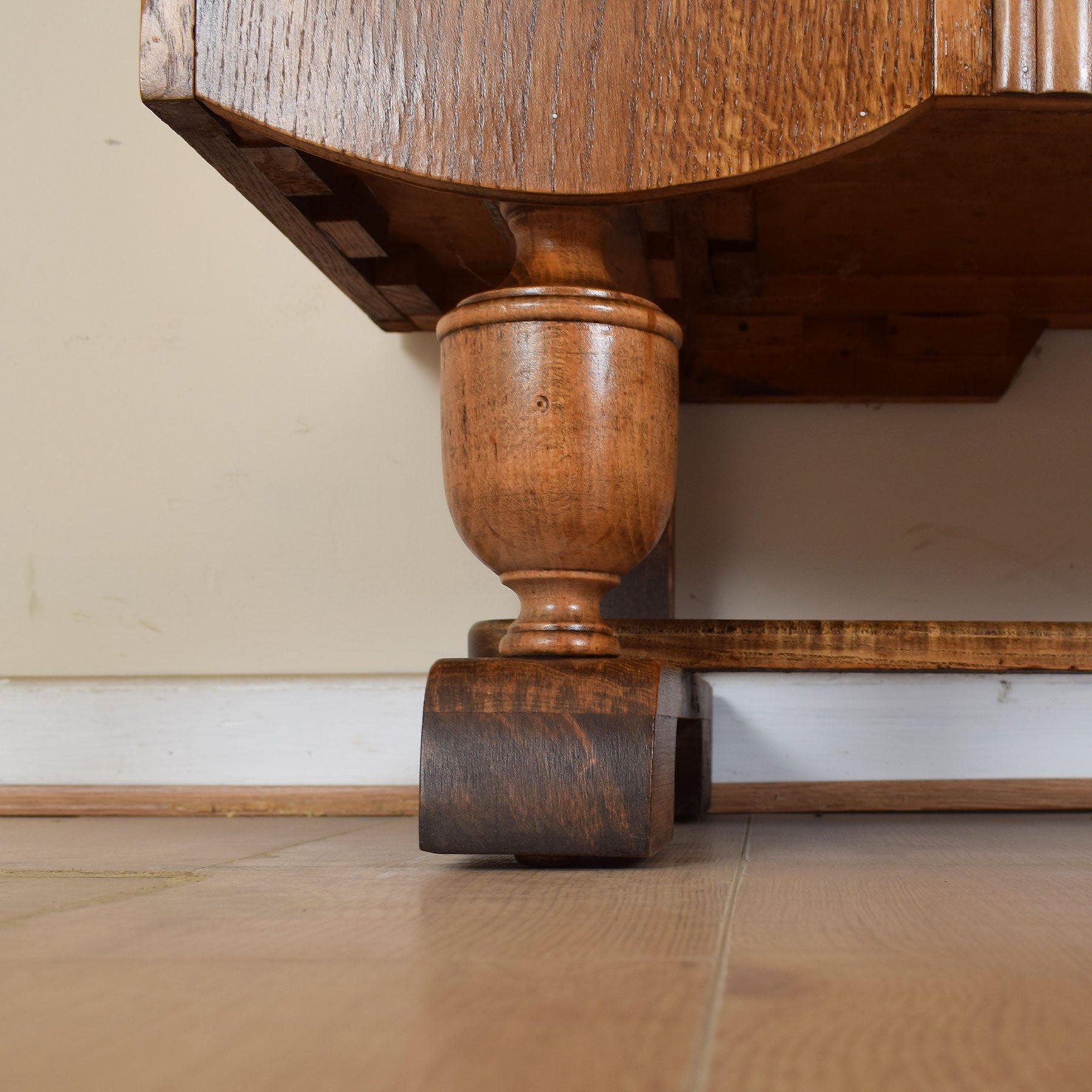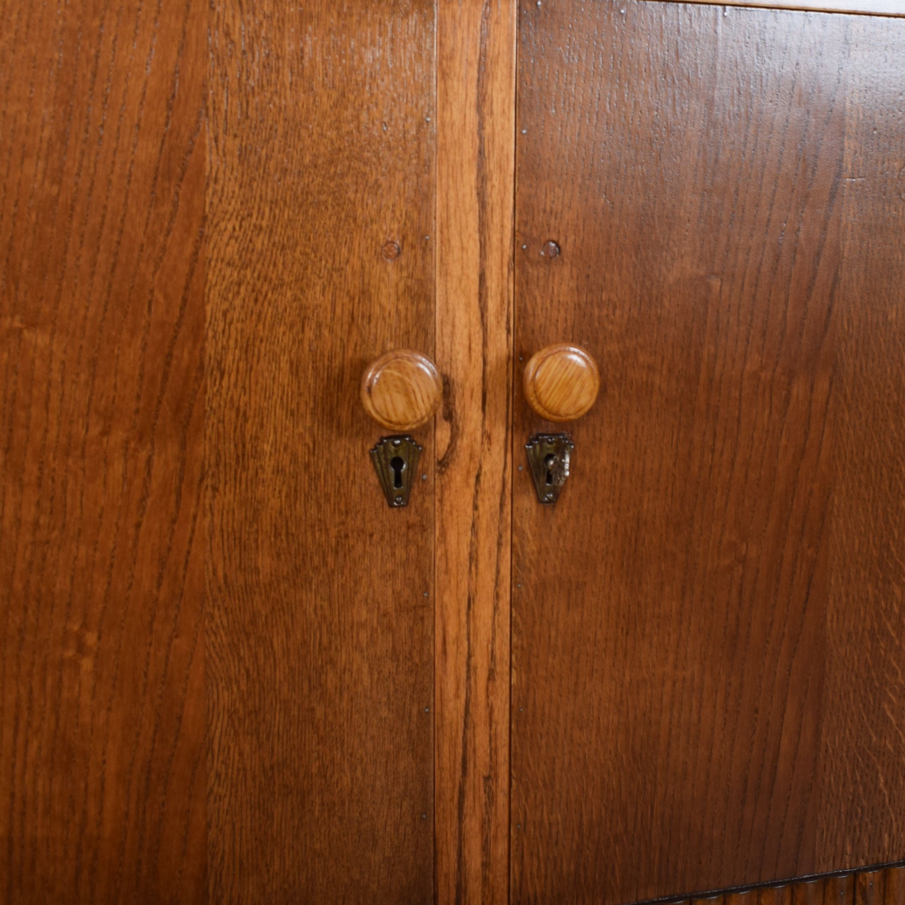 Our restoration workshop has stripped the original varnish from this sideboard before applying a professional matt lacquer that enhances the lovely oak-grain and colour, as well as providing a level of protection in careful everyday use. This sideboard is made from a combination of oak and oak veneer, while plywood is utilised for the interior, back, and base of the shelves.