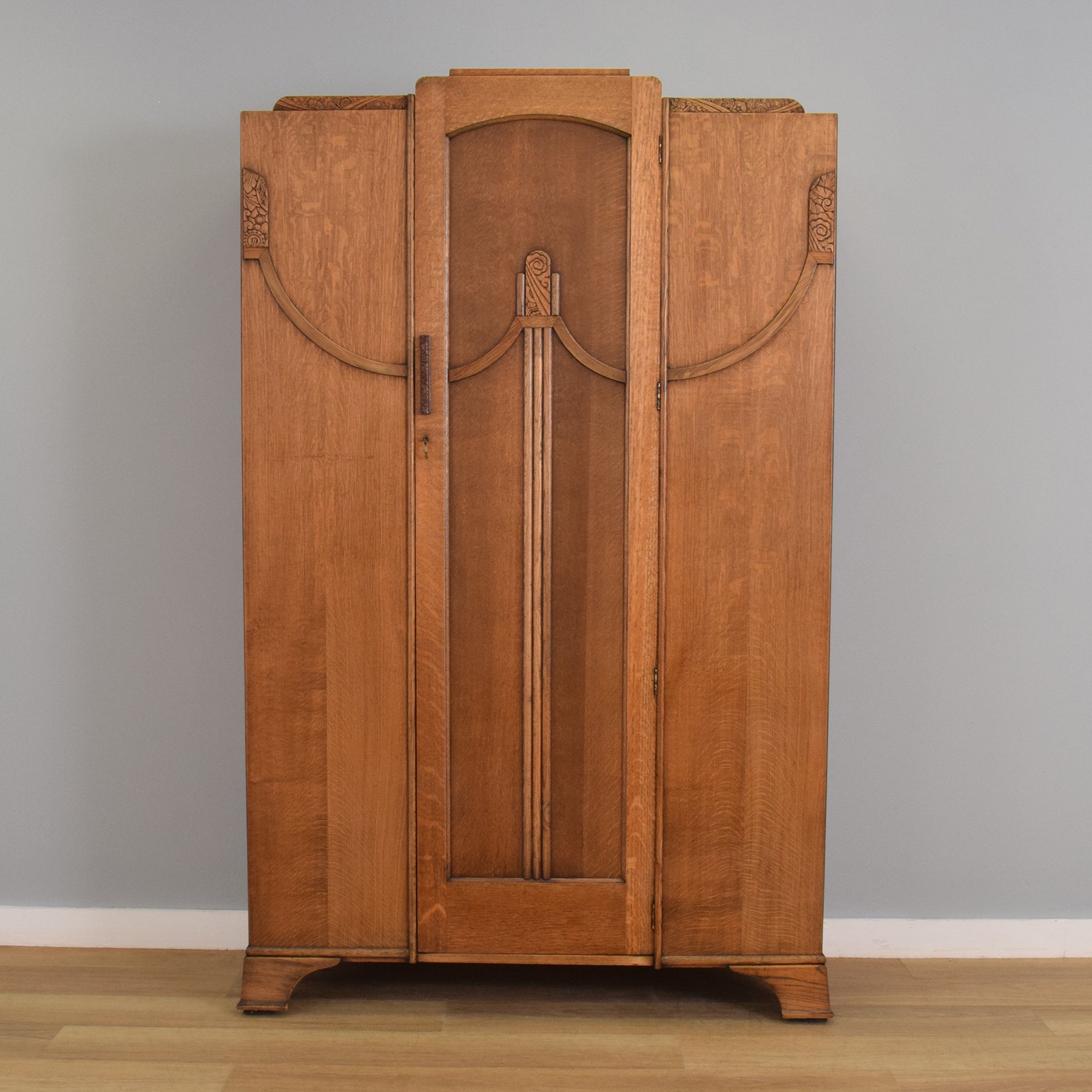 This tall oak-veneered wardrobe features a striking Art Deco design, with finely carved floral motifs, sweeping curved mouldings, and a raised central panel. Inside, the layout is carefully considered: four fixed coat hooks are positioned along the back panel, with a shelf to either side. Below each shelf is a front-to-back hanging rail fitted with three sliding hooks. In addition, a central front-to-back sliding hanging rail provides further versatile storage for coats or bags, making the interior particularly well-suited to family use or busy entryways. The wardrobe stands on shaped bracket feet and has a softly curved silhouette that enhances its vintage character.
