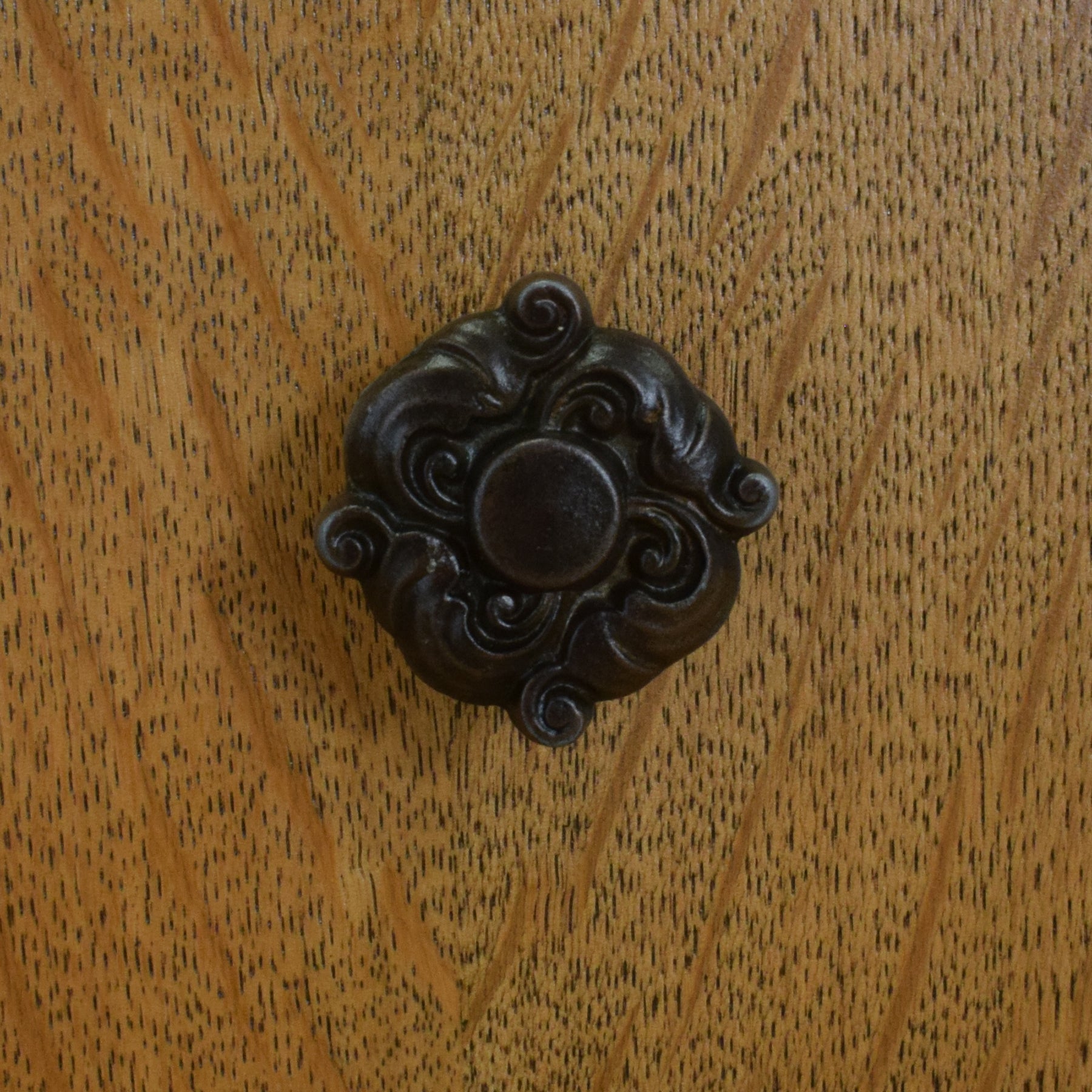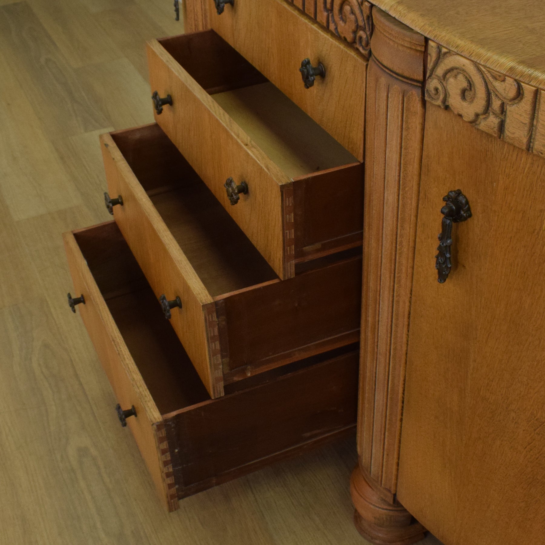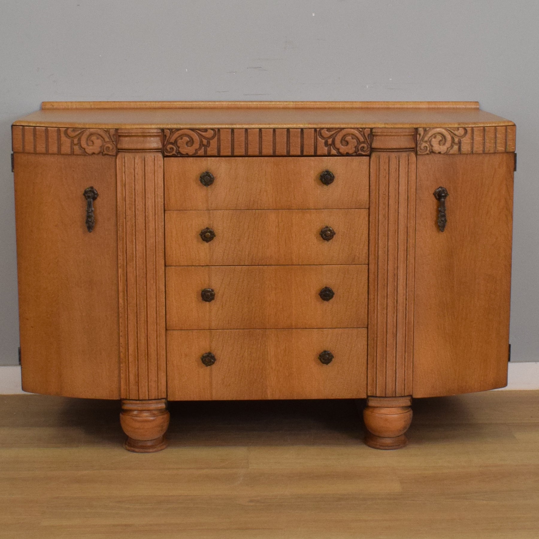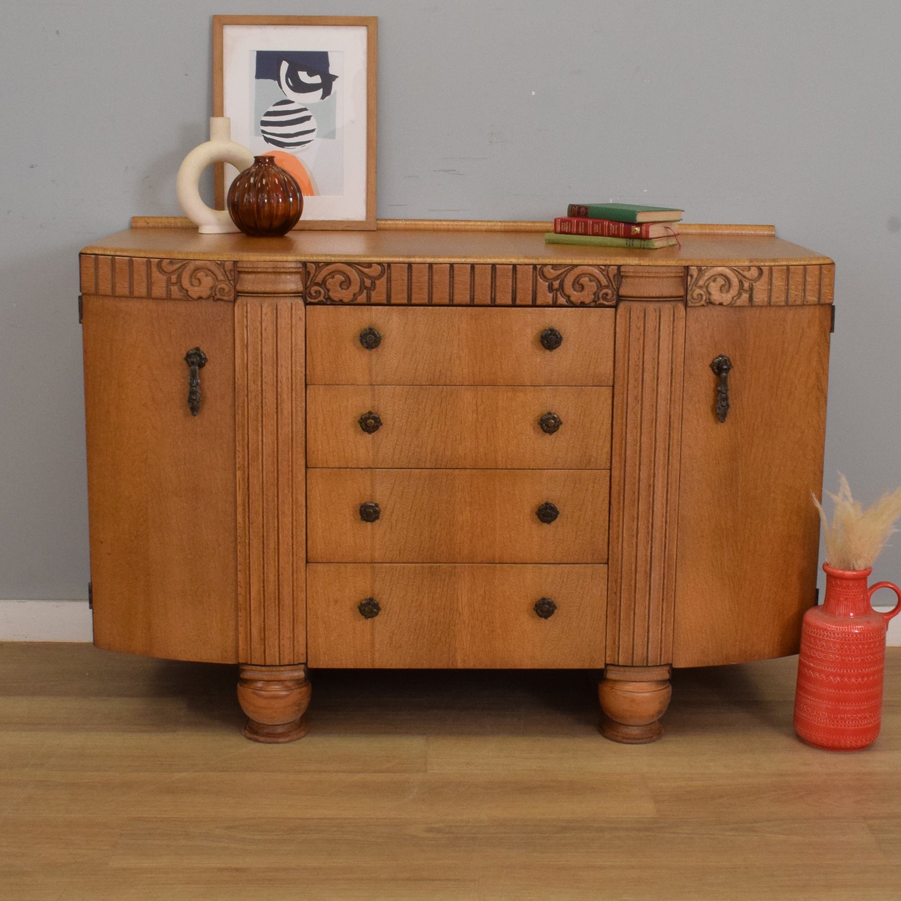 This piece has a distinctive Art Deco-inspired look, with rounded end cupboards, fluted front pilasters, and carved detailing running along the top edge. The central section offers four drawers, complemented by two side cupboards, giving a good mix of concealed storage for tableware, paperwork, or household items. Decorative dark metal handles and knobs add contrast against the lighter oak tone.