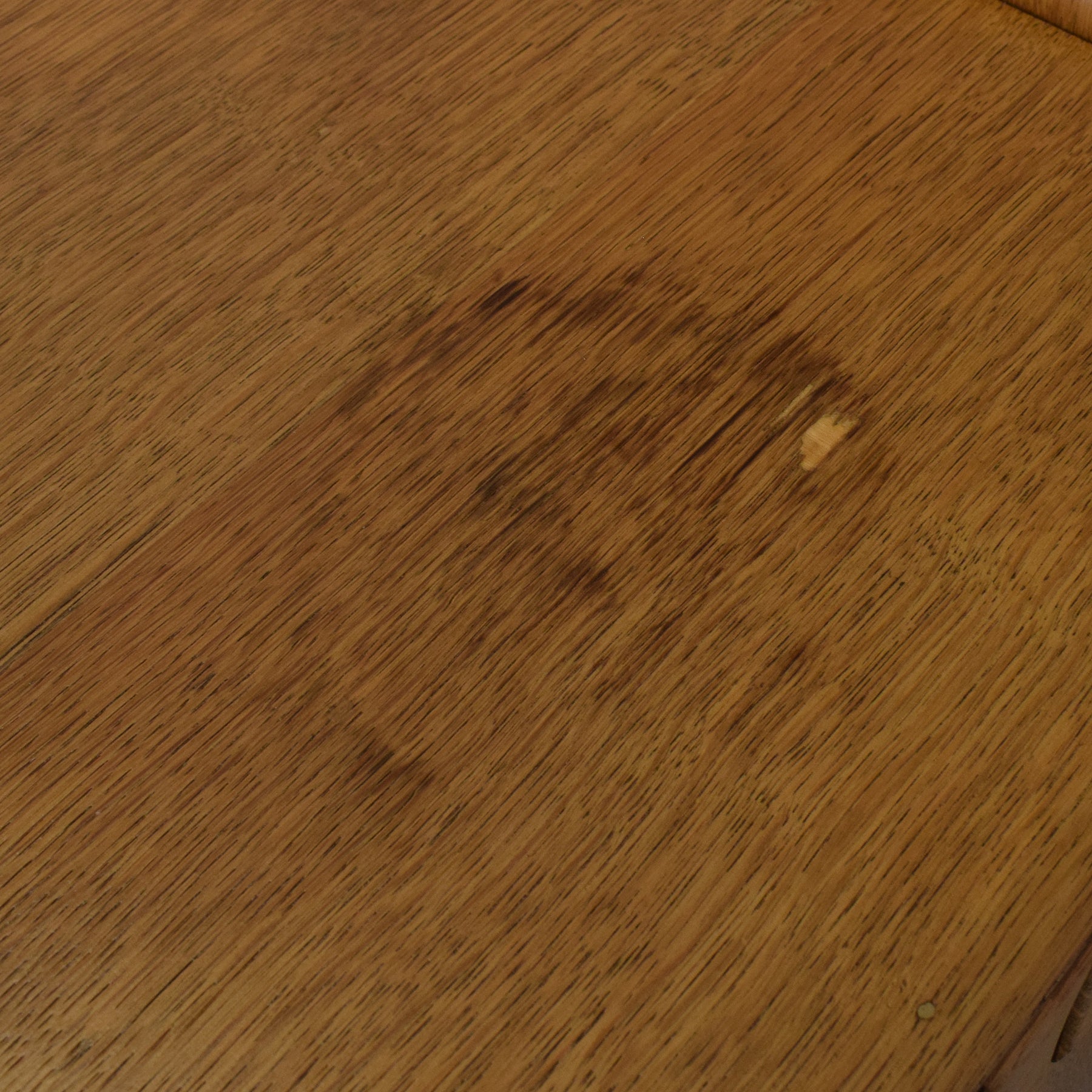 The previous finish has been stripped, and then multiple coats of hard-wearing matte lacquer have been applied, providing a durable, long-lasting finish while also accentuating the oak grain. As shown in the photographs, there is a heavy stain to the worktop, along with a small area where the veneer has worn down. This item is made from compressed material, covered with an oak veneer. The back of the item is made from plywood, and plywood has also been used for the drawer bases.