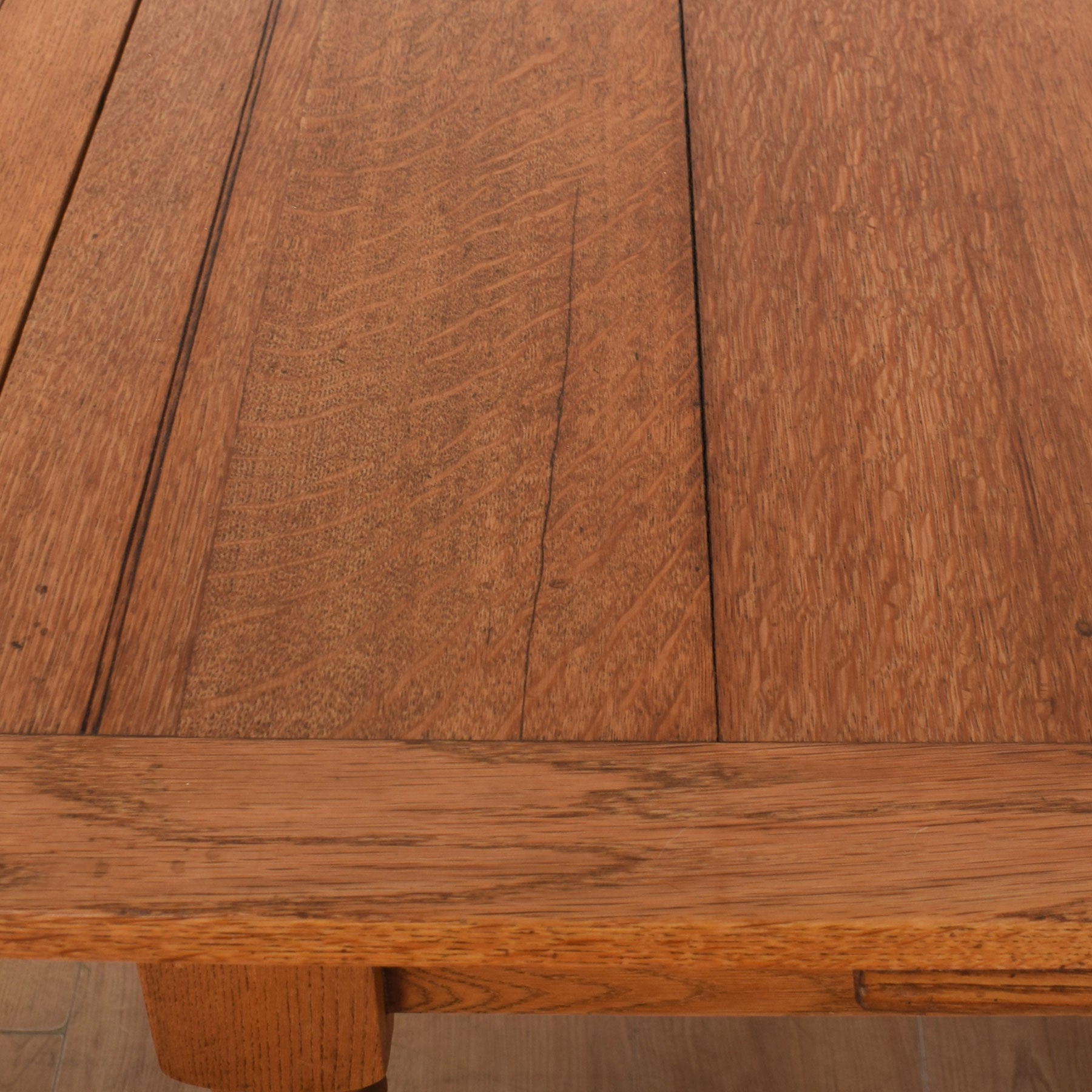 We have lovingly restored this table and four by stripping back the previous darker finish to reveal the natural tones of the oak grain, and applied a clear matt lacquer, giving a hard-wearing and attractive finish. The chair seats have been re-padded and freshly covered in a contemporary fabric. This dining suite is solid oak.