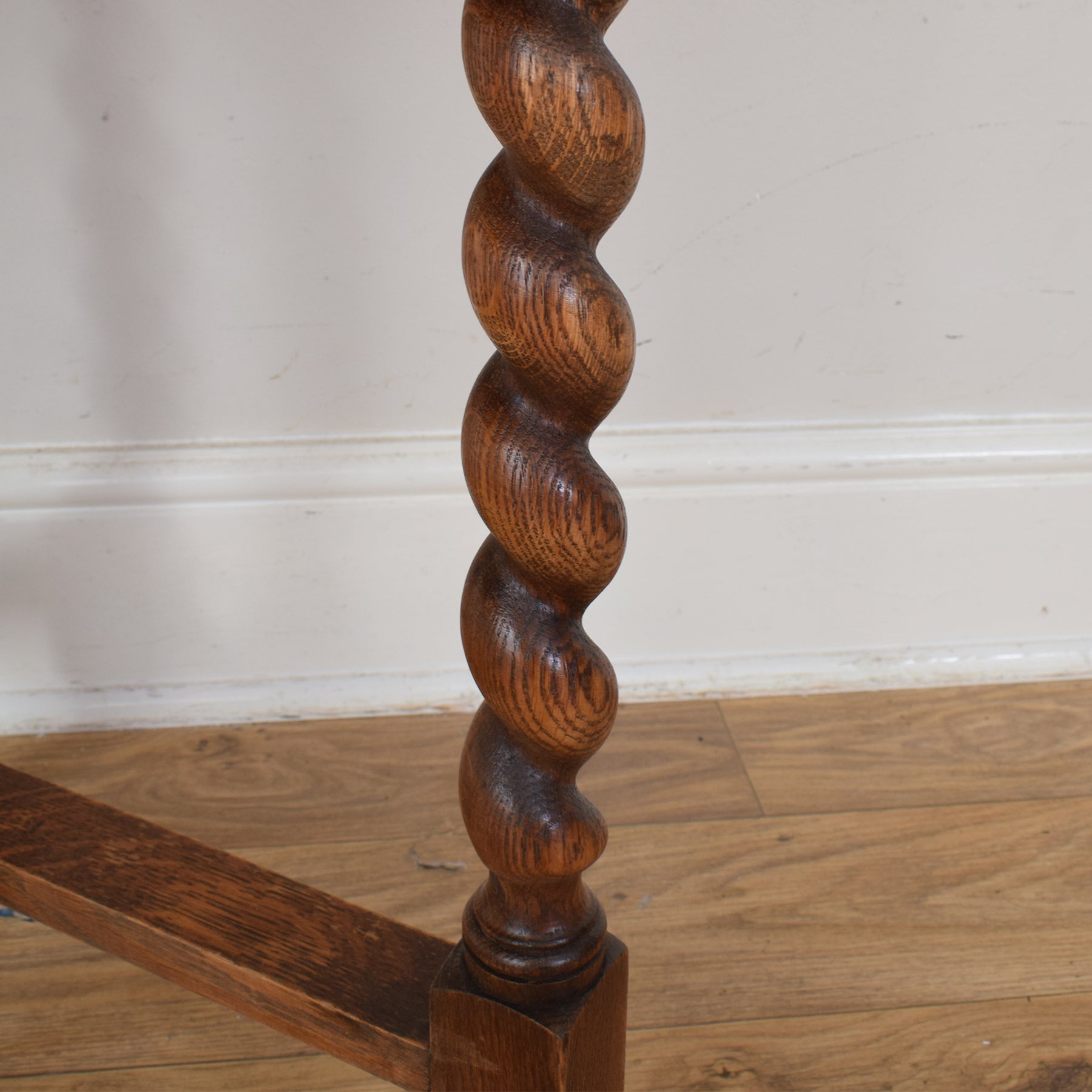 The previous darker stain has been fully stripped away, and multiple coats of hard-wearing matte lacquer have been applied. This provides a durable, long-lasting finish while highlighting the natural oak grain and the intricate barley-twist detailing. This item is made entirely from solid oak.