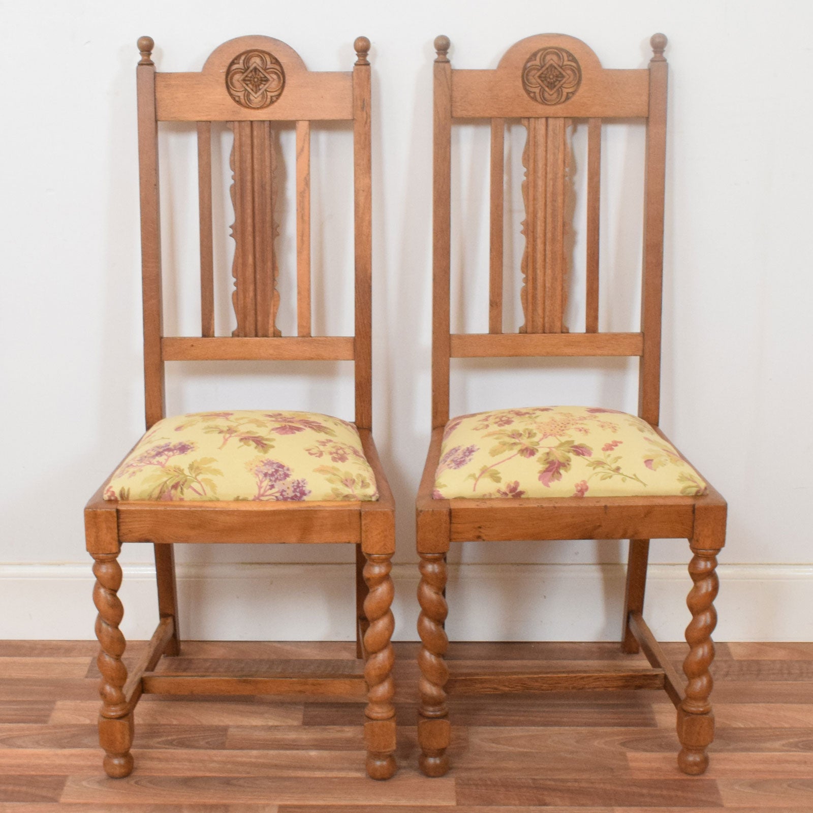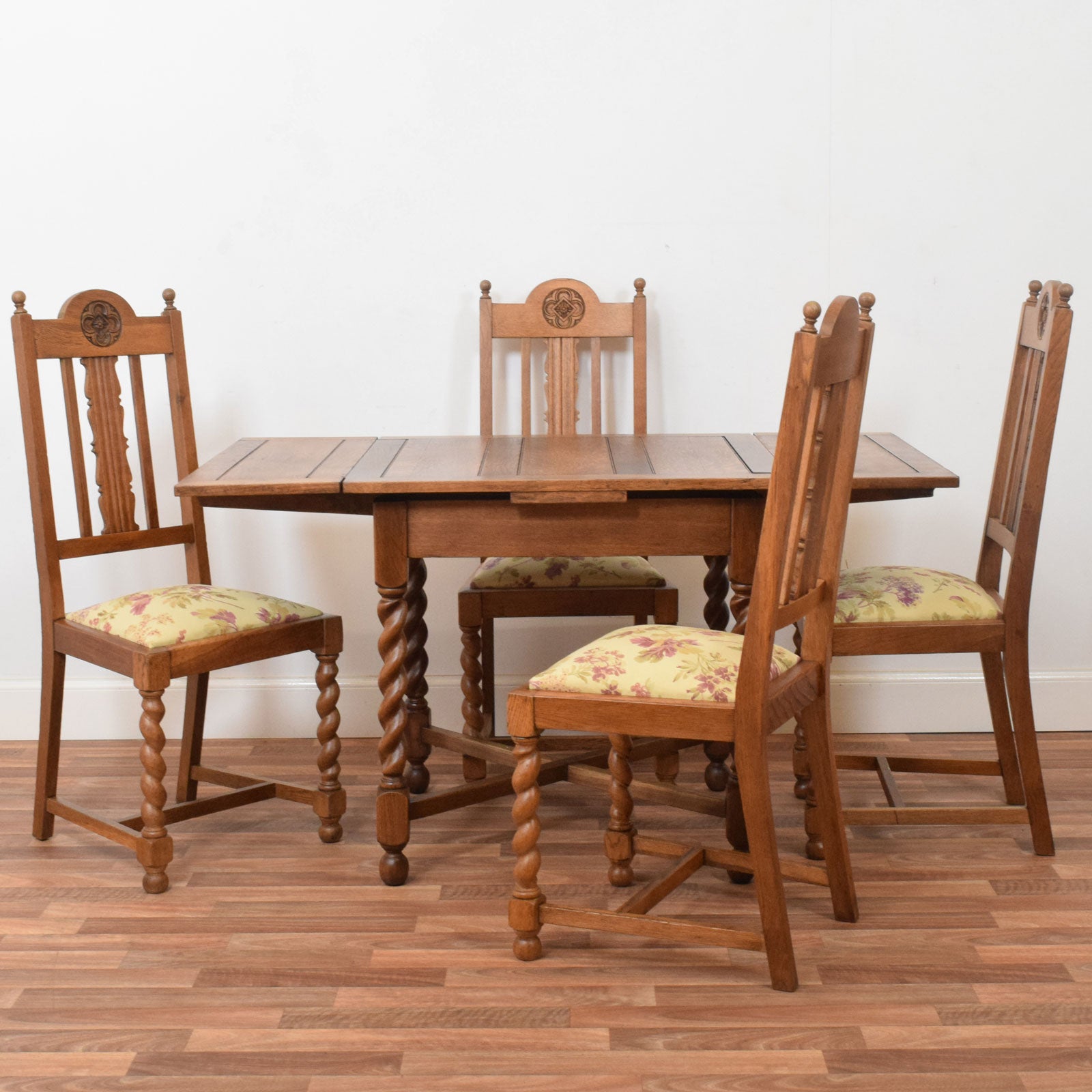 The set comprises a rectangular barley twist table and four matching high-back chairs. The table features beautifully turned legs and a plank-style top with extending leaves, ideal for adapting to different occasions. Each chair is adorned with carved floral medallions on the backrests and finished with elegant barley twist front legs, while the seats have been newly upholstered in a floral fabric with soft yellow tones and muted pinks and purples, lending a subtle decorative charm.