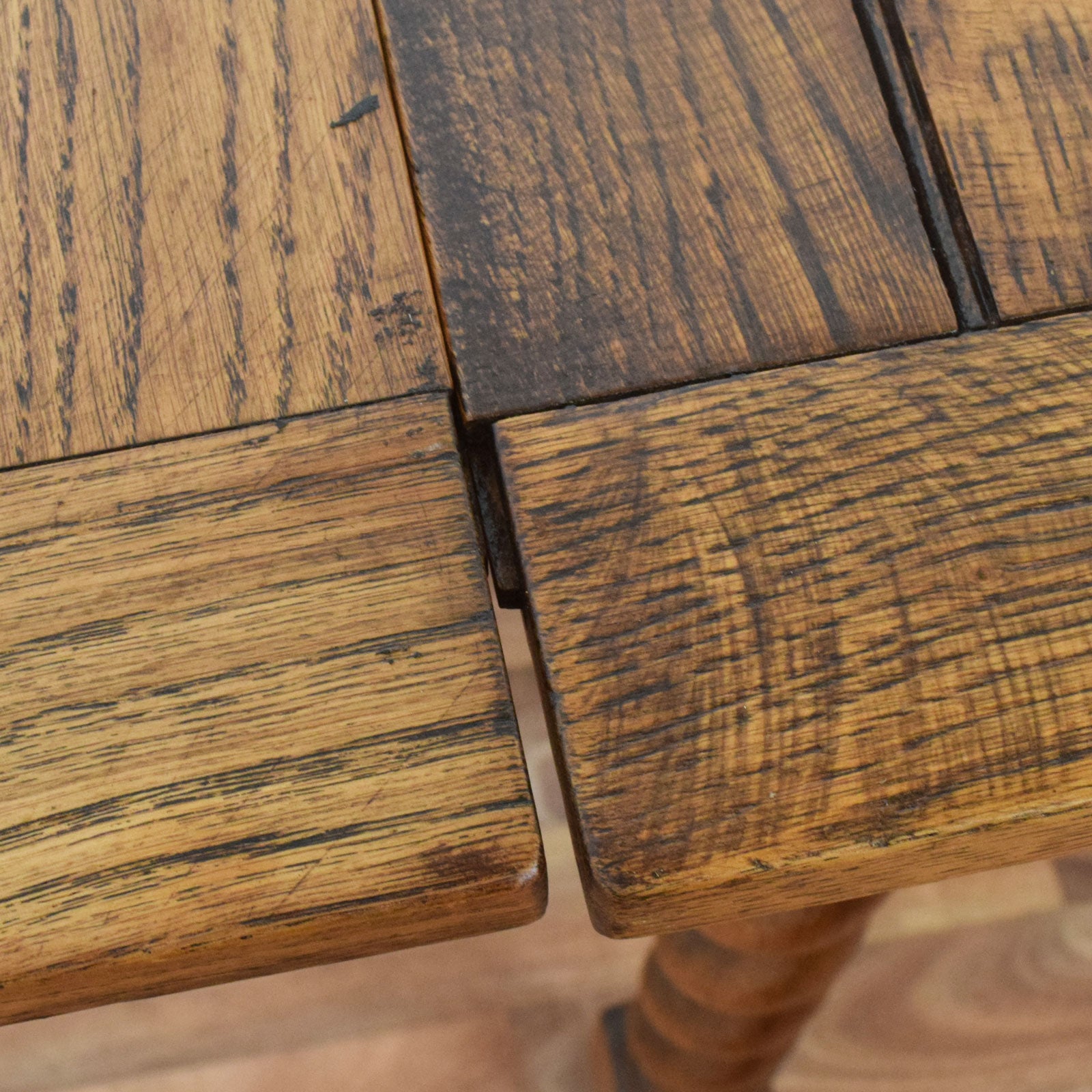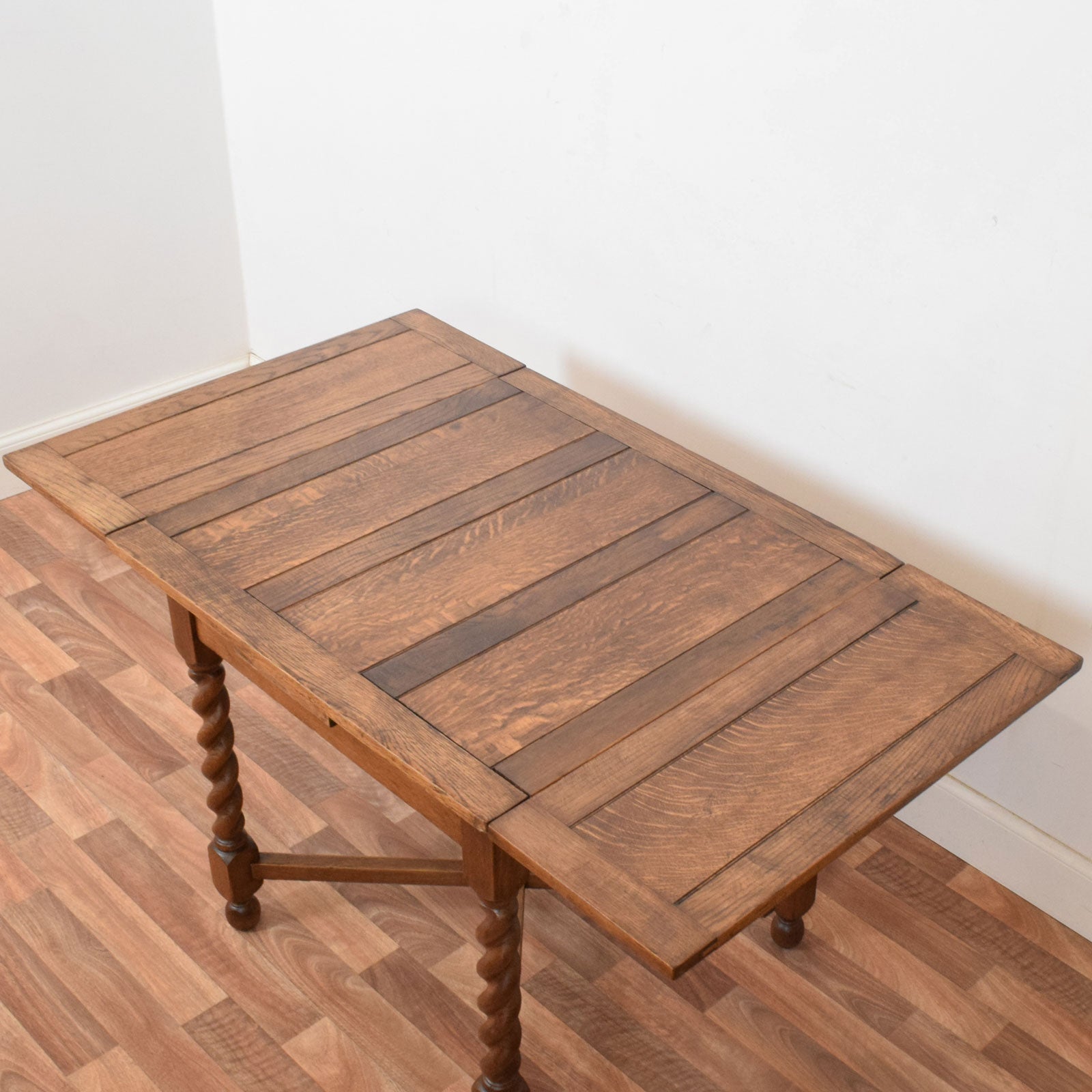 The previous darker stain has been stripped, and then multiple coats of hard-wearing matte lacquer have been applied, providing a durable, long-lasting finish, while also accentuating the natural oak grain. This item is made entirely from oak. As with many vintage pieces, signs of age remain: there are visible gaps between the table leaves and the central top section, and one of the chair backrests is missing a small piece of oak from the decorative splat.