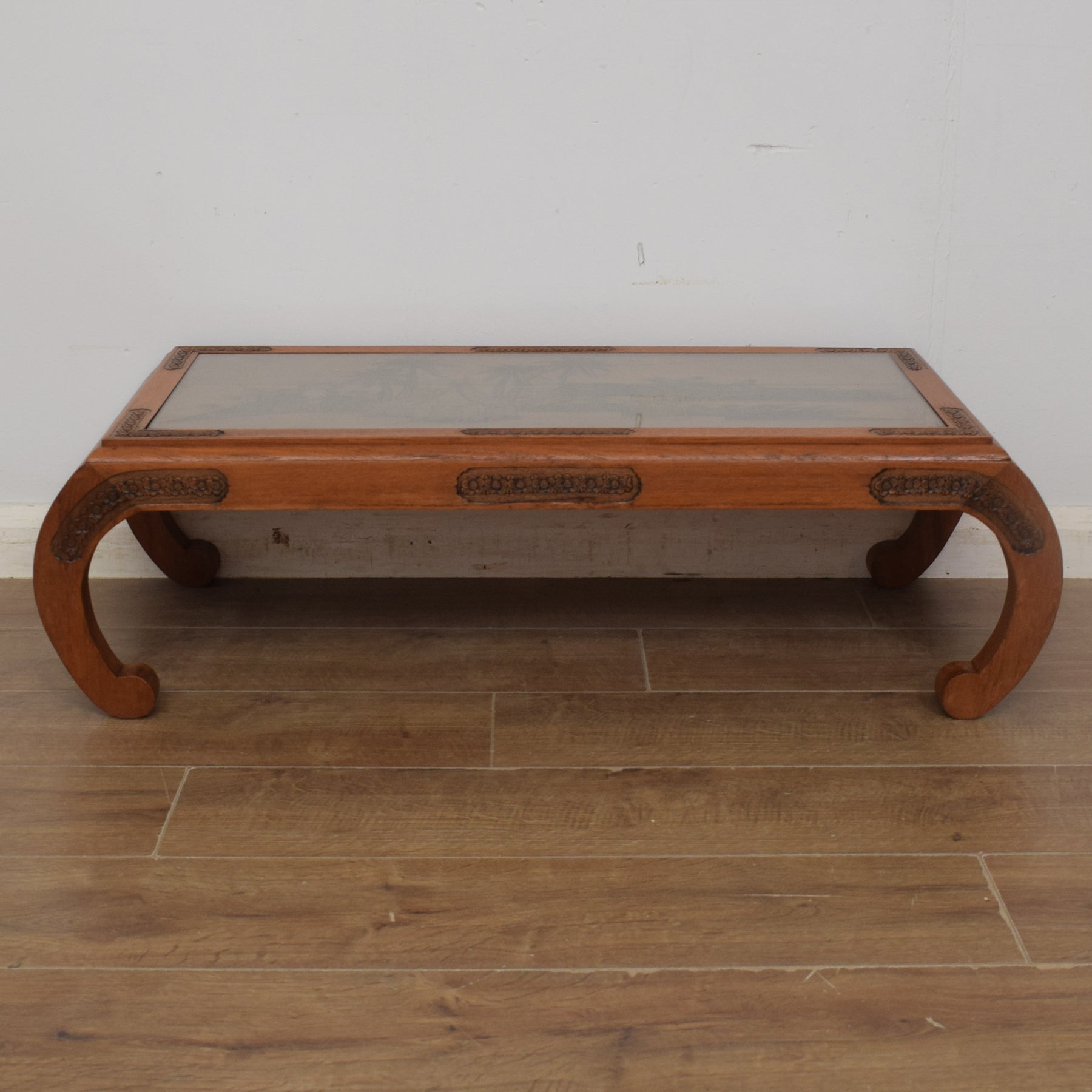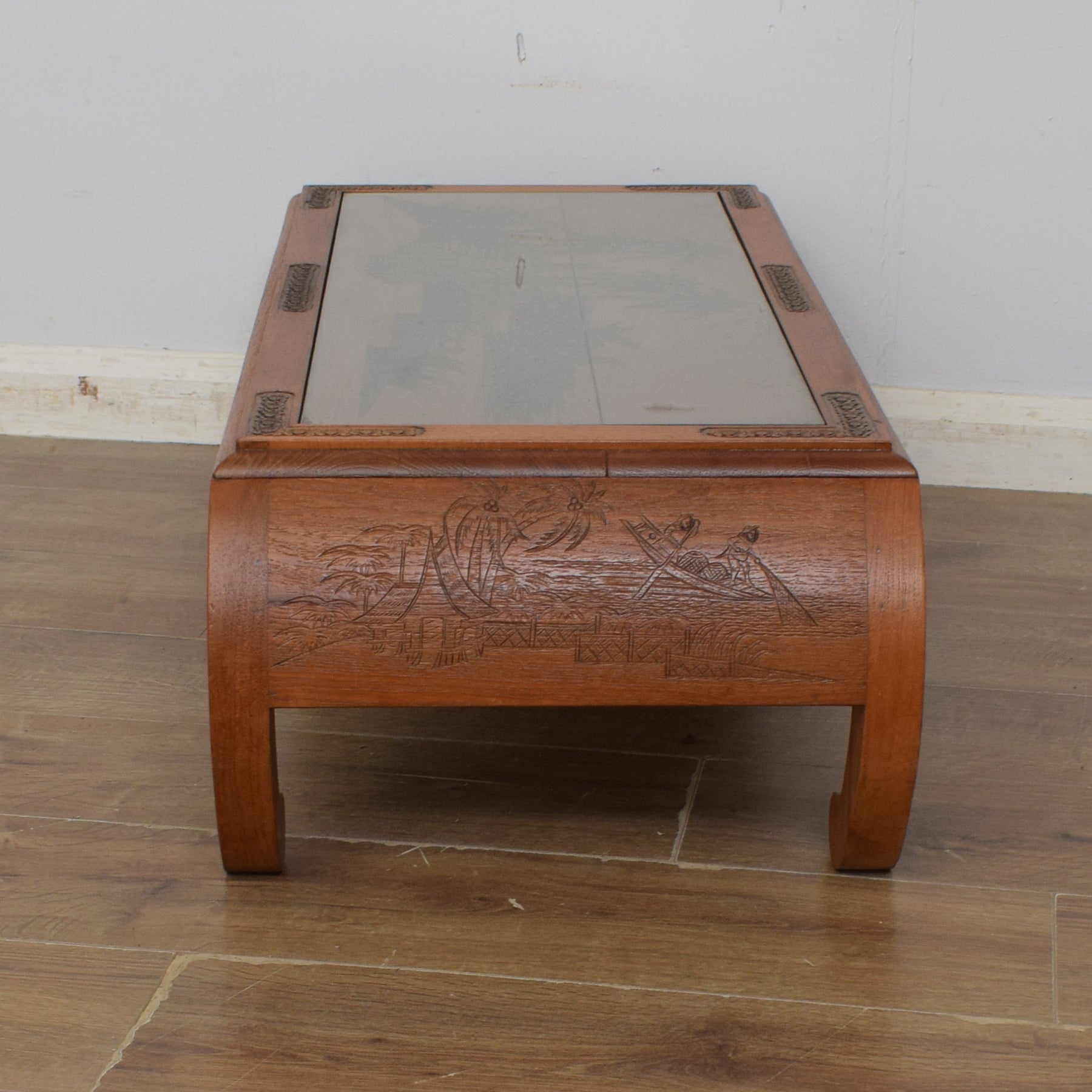The table showcases beautifully detailed carvings, featuring floral motifs and scenic imagery that reflect skilled artistry. The scrolled legs add a touch of elegance, while the tabletop, with its intricate carvings under a protective glass, provides both visual appeal and practicality. There is a gap between two of the planks used for the table top, however this piece still retains its elegance and beauty as shown in the photographs.