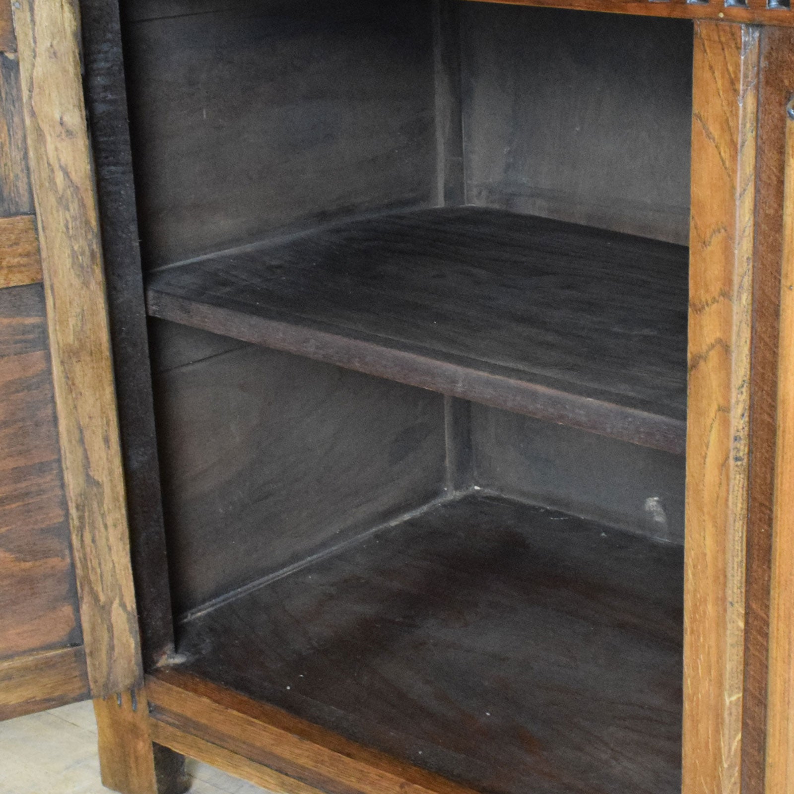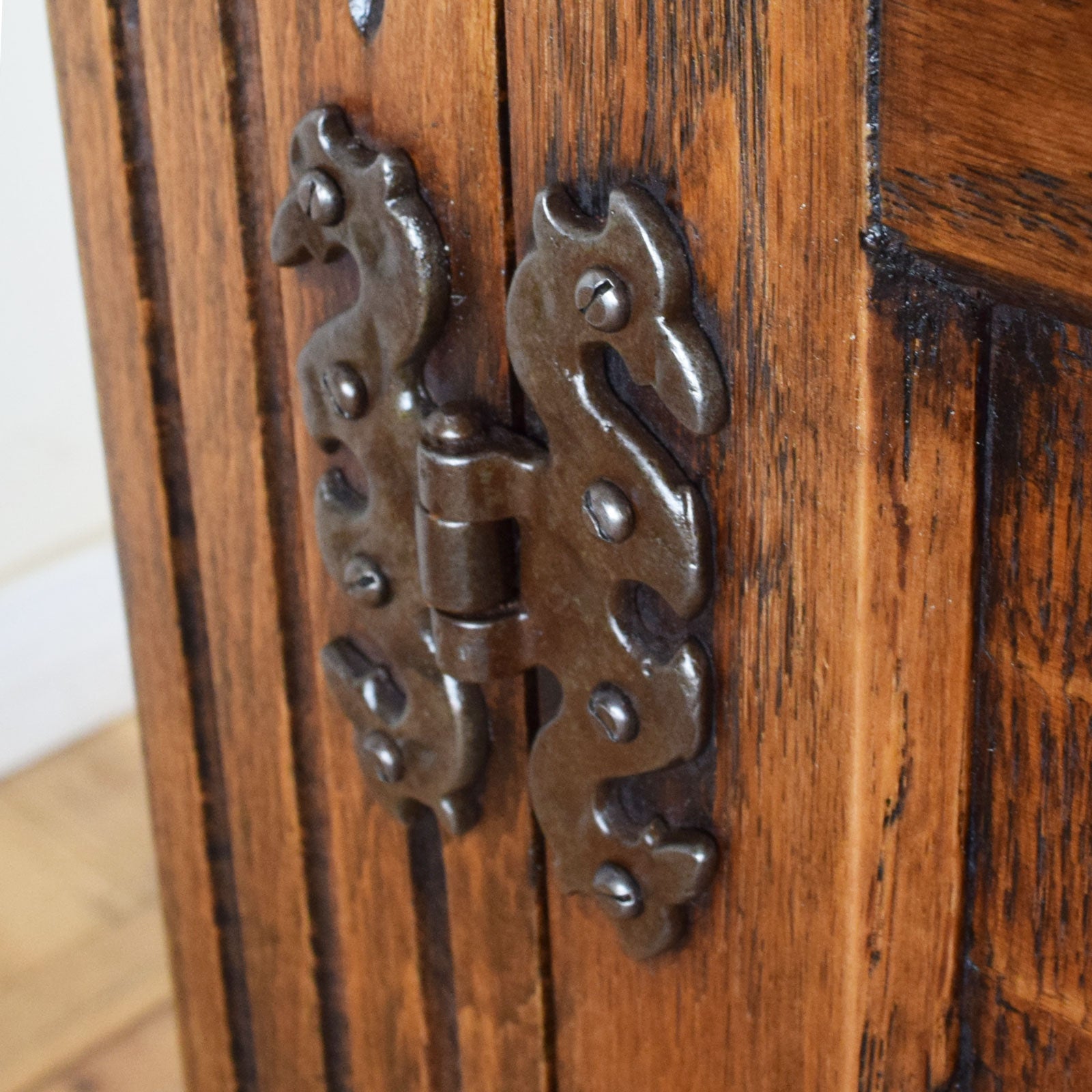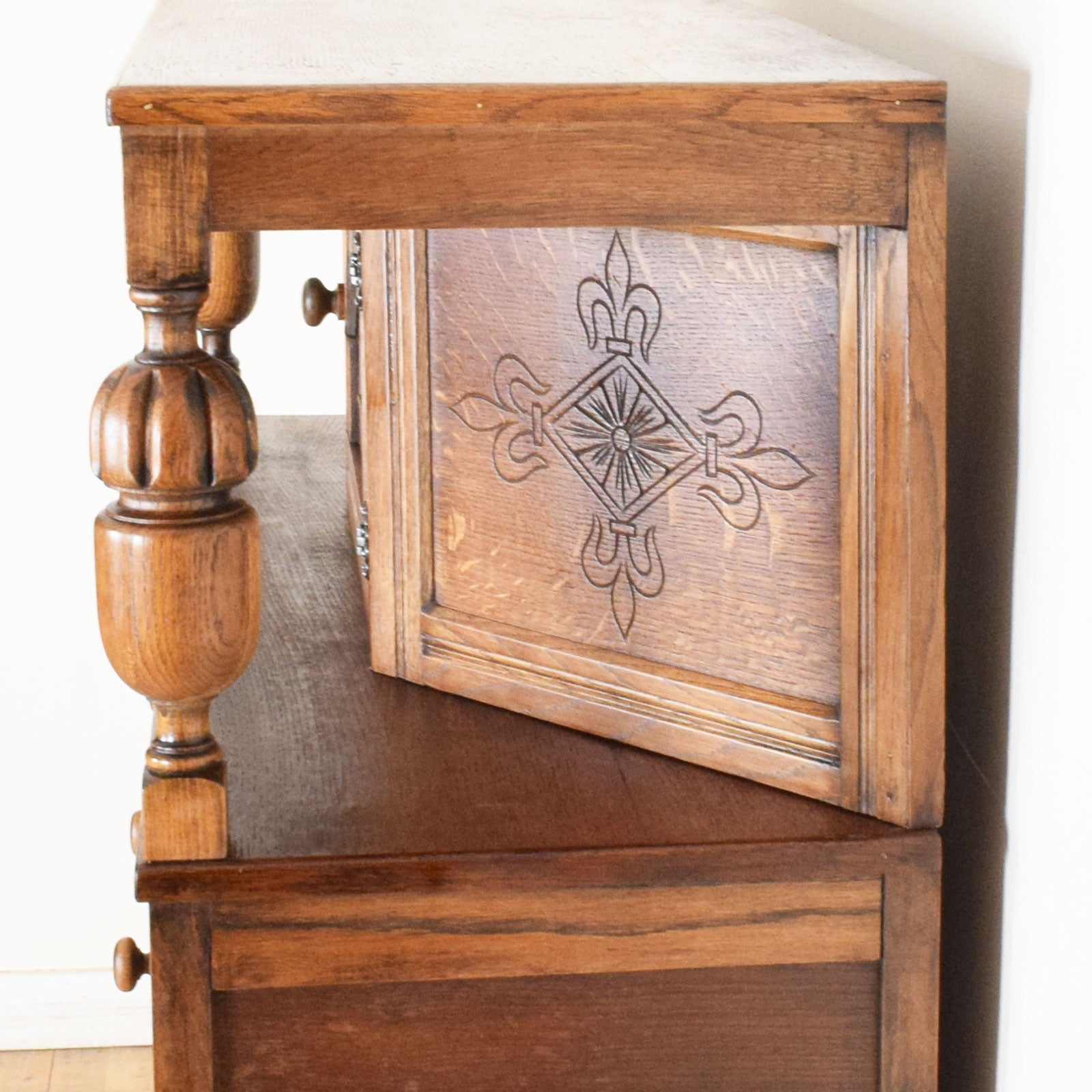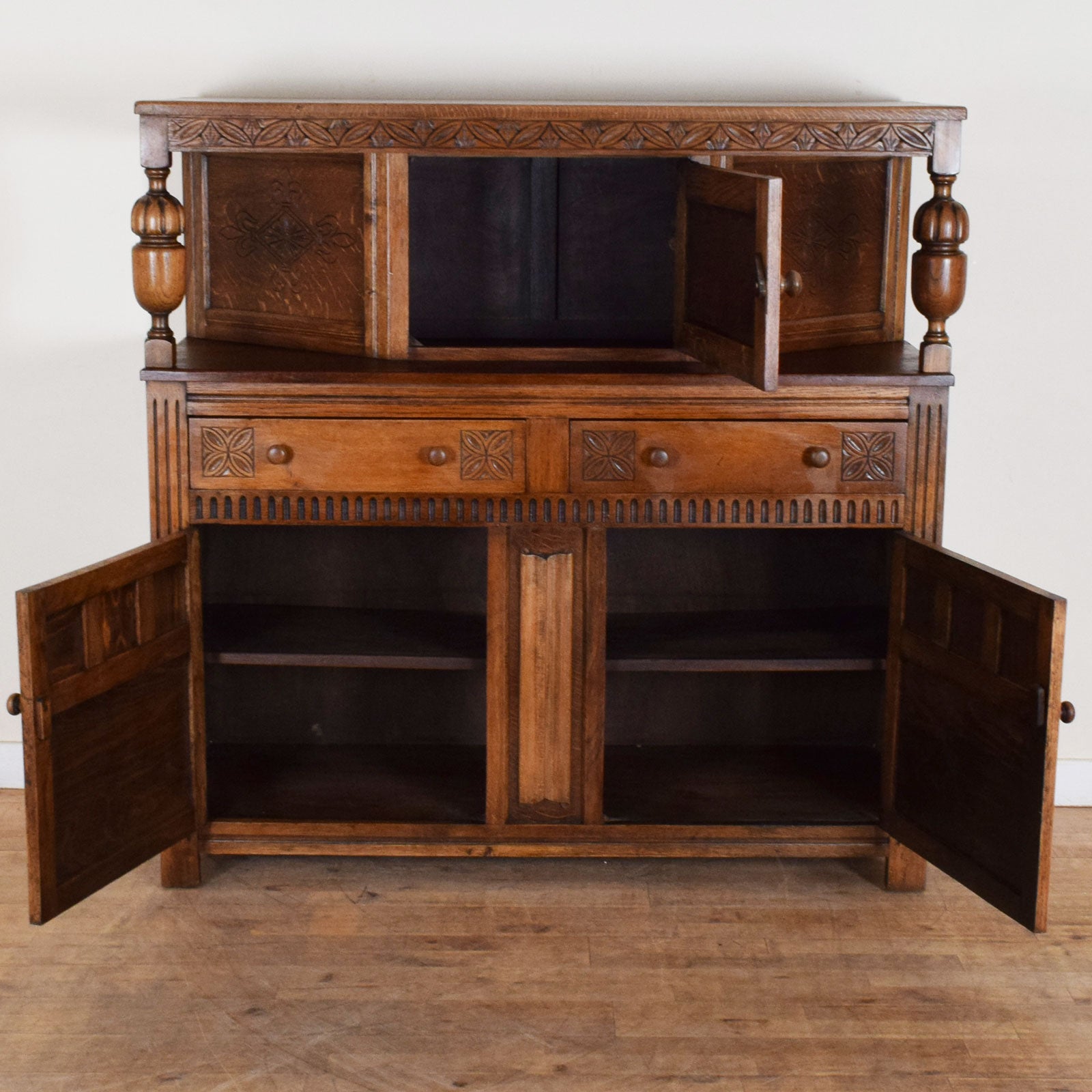 This carved oak court cabinet is destined to claim a place of pride in any home, ideally suited for a hallway, living room, or dining room.