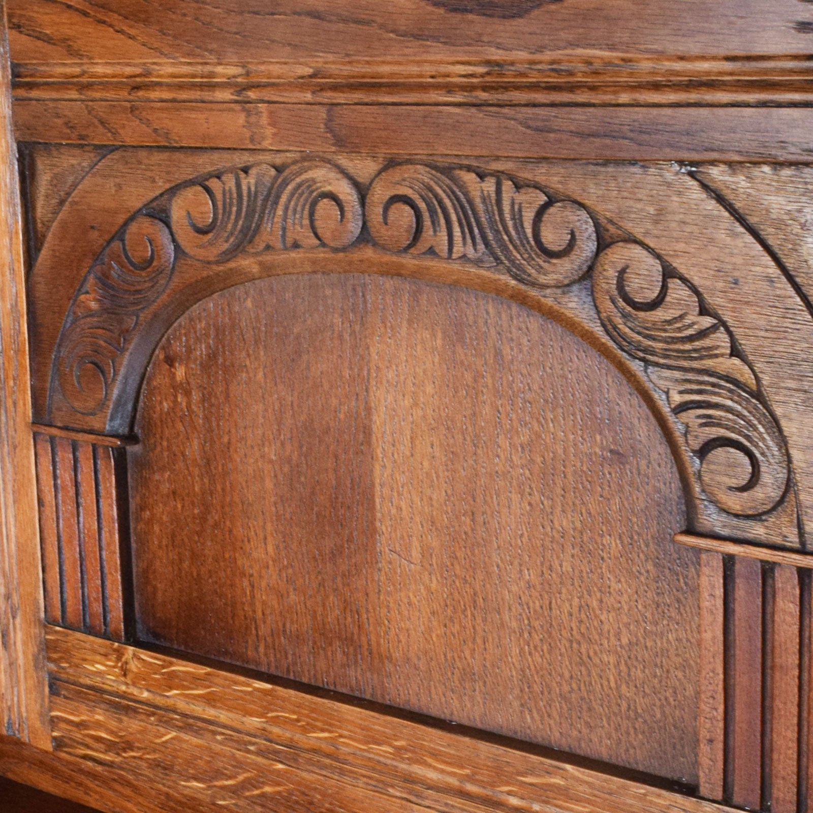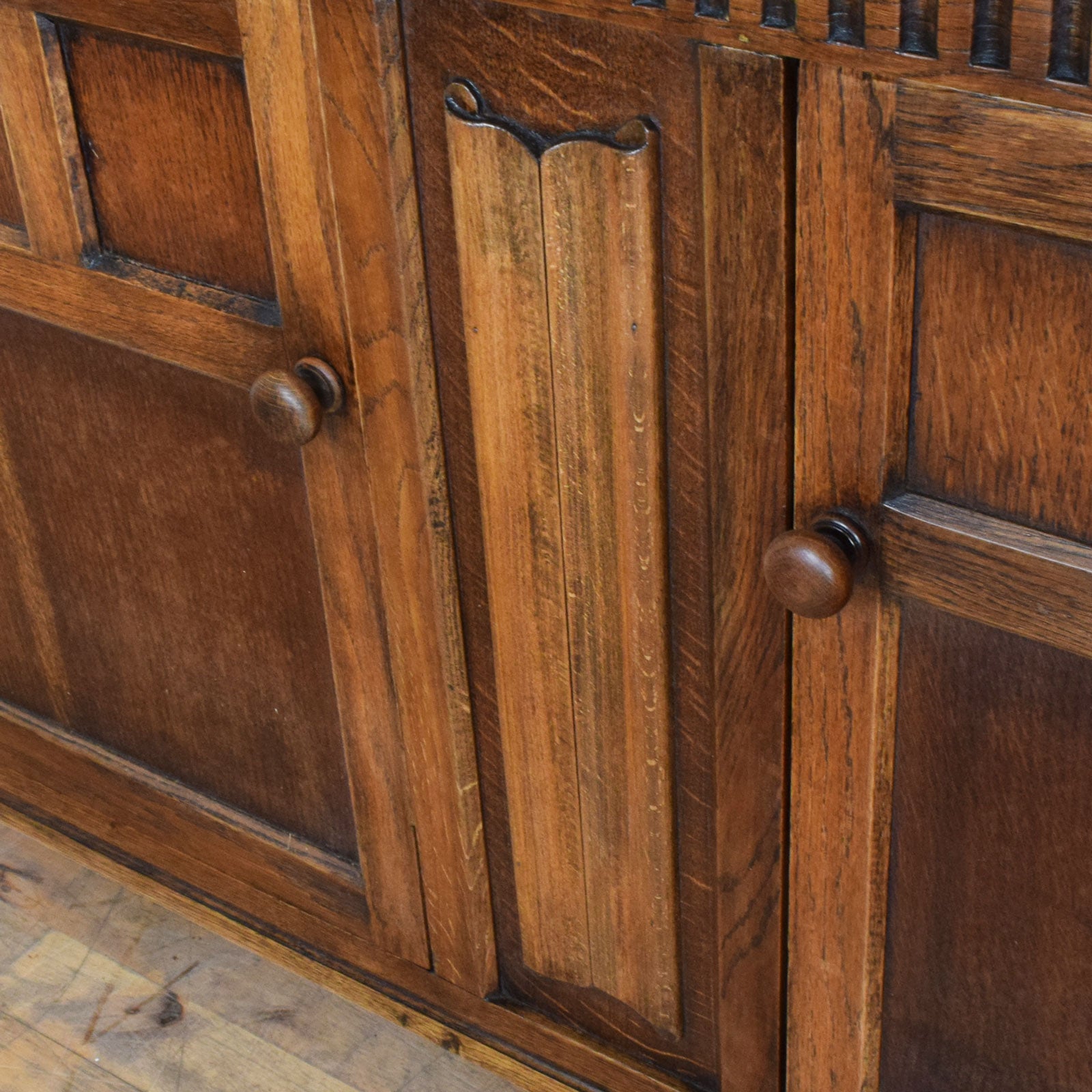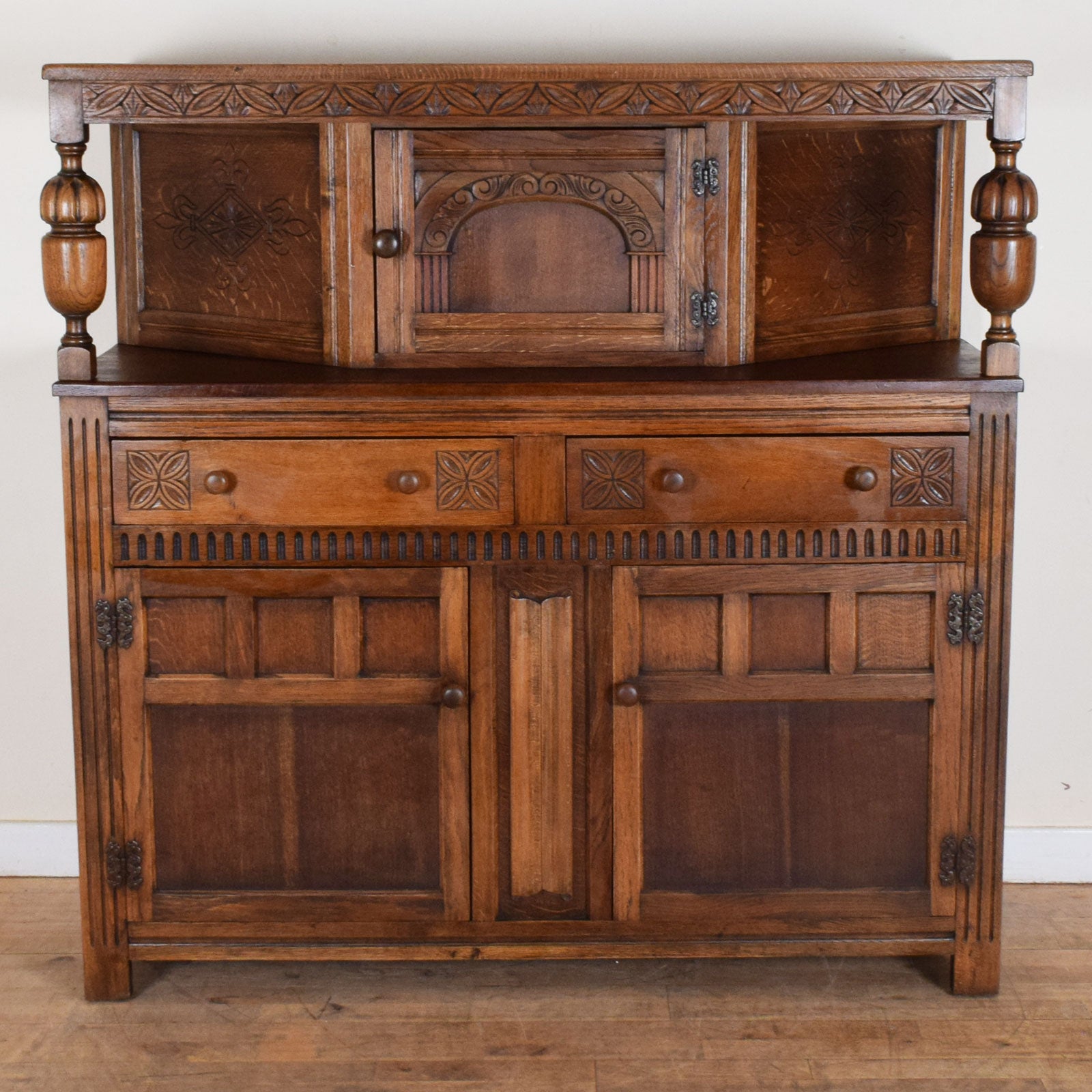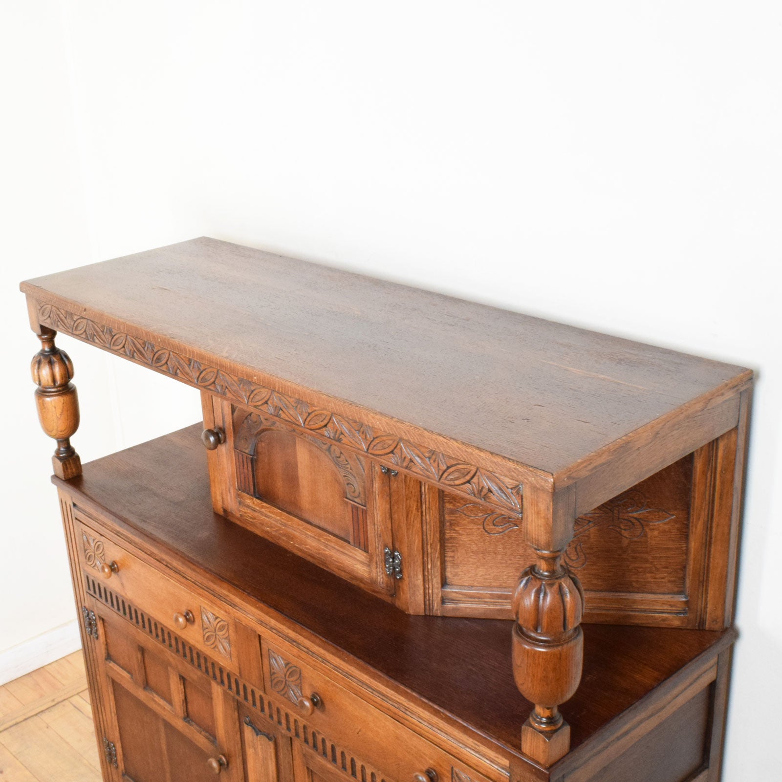 This carved oak court cabinet is destined to claim a place of pride in any home, ideally suited for a hallway, living room, or dining room.