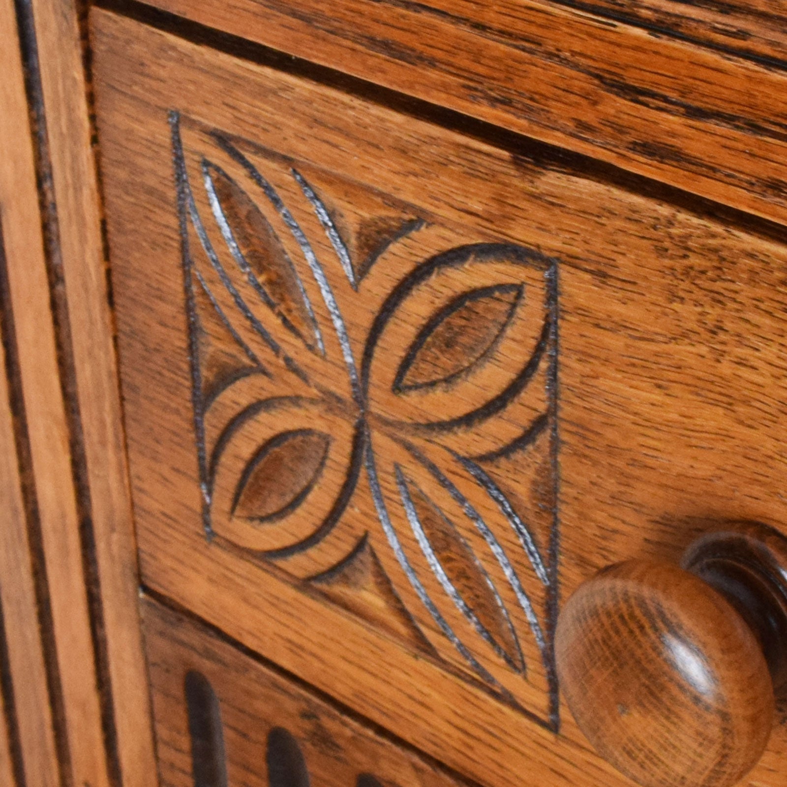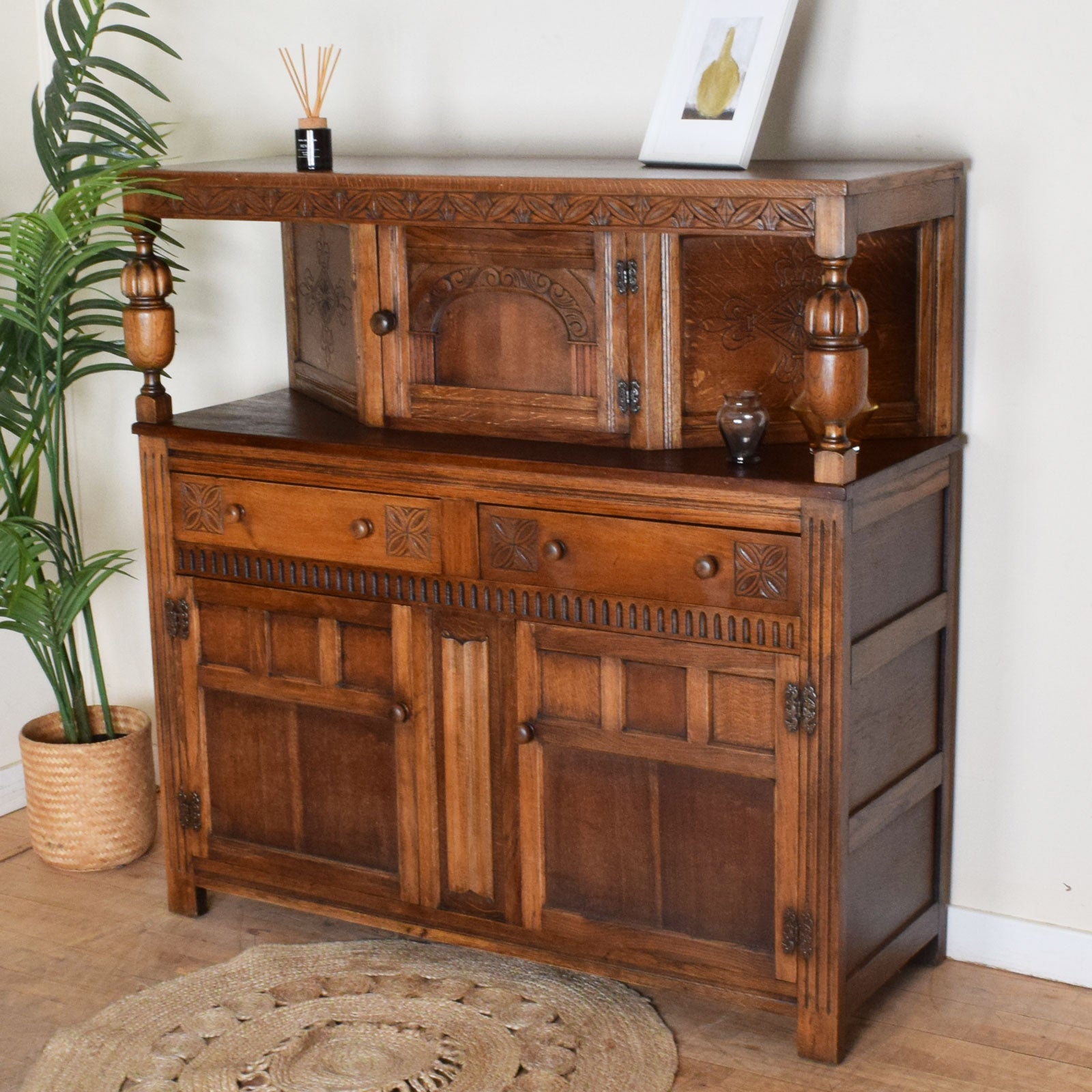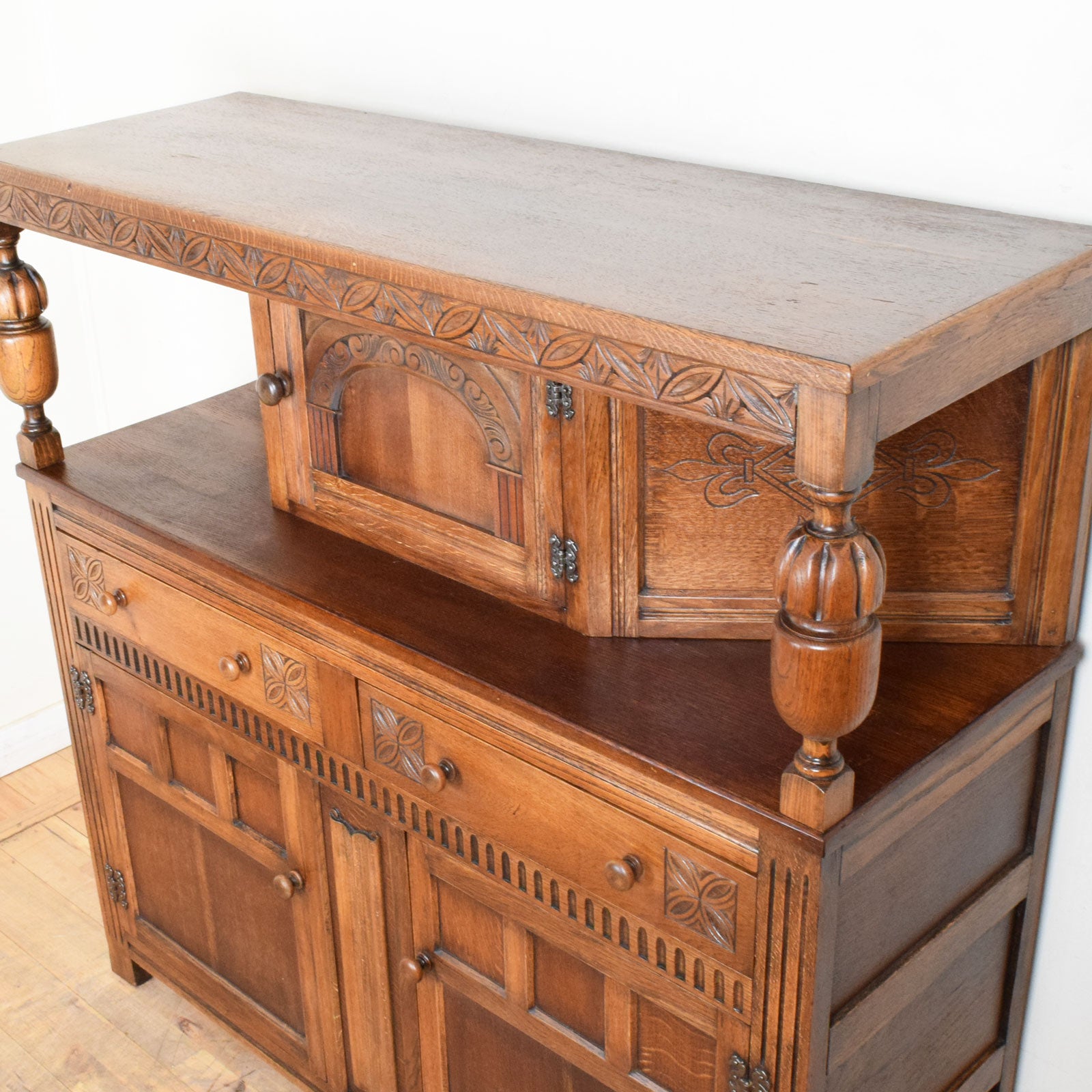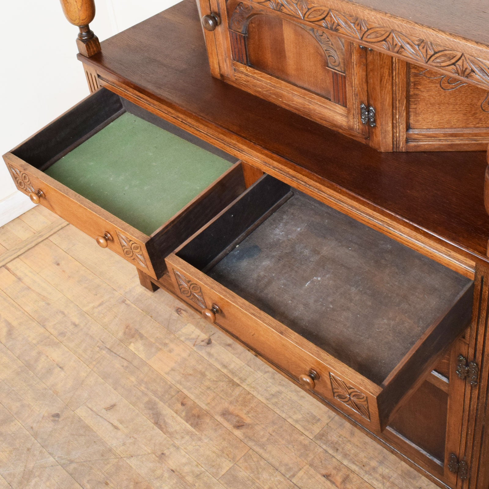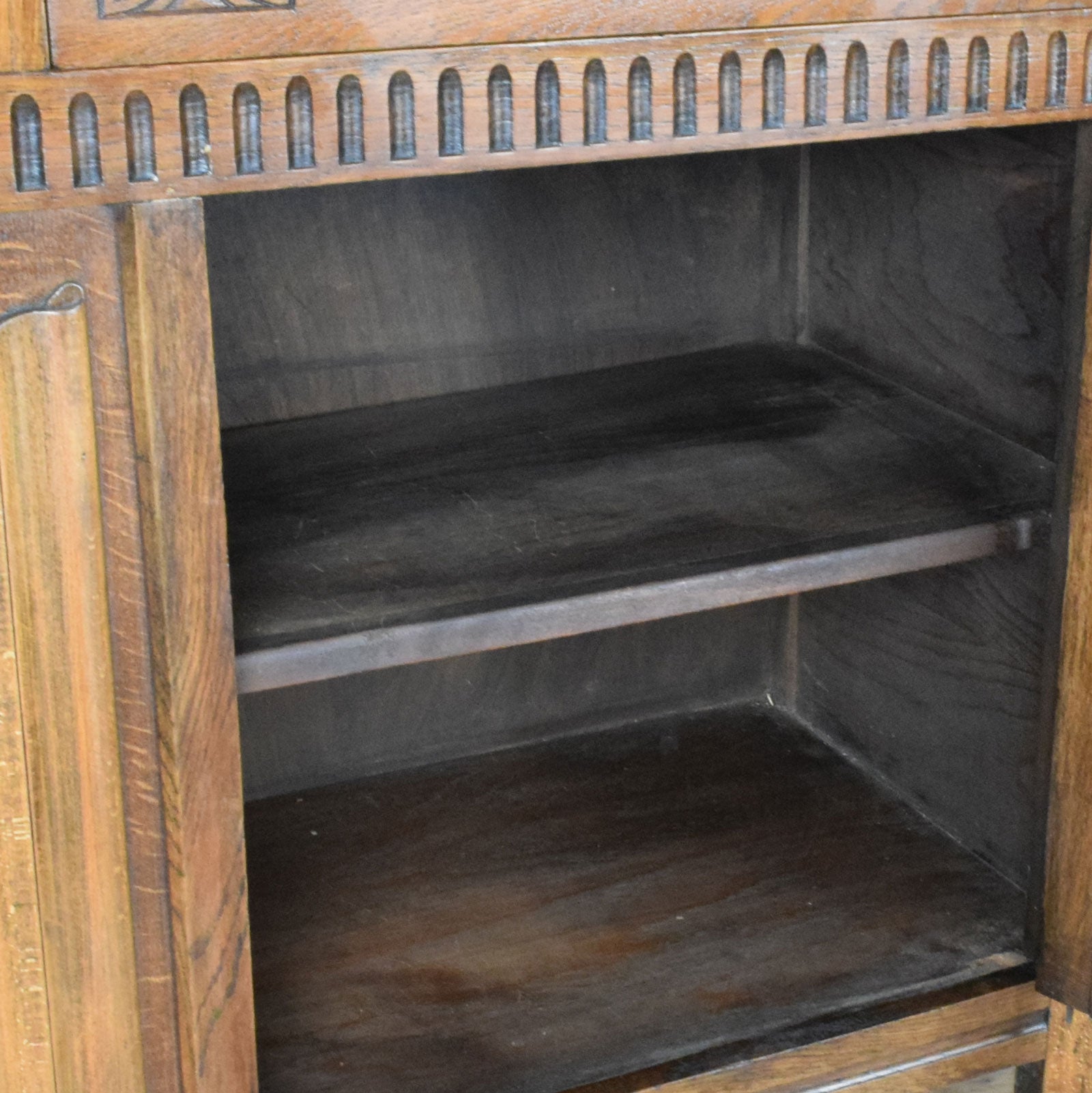 This carved oak court cabinet is destined to claim a place of pride in any home, ideally suited for a hallway, living room, or dining room.