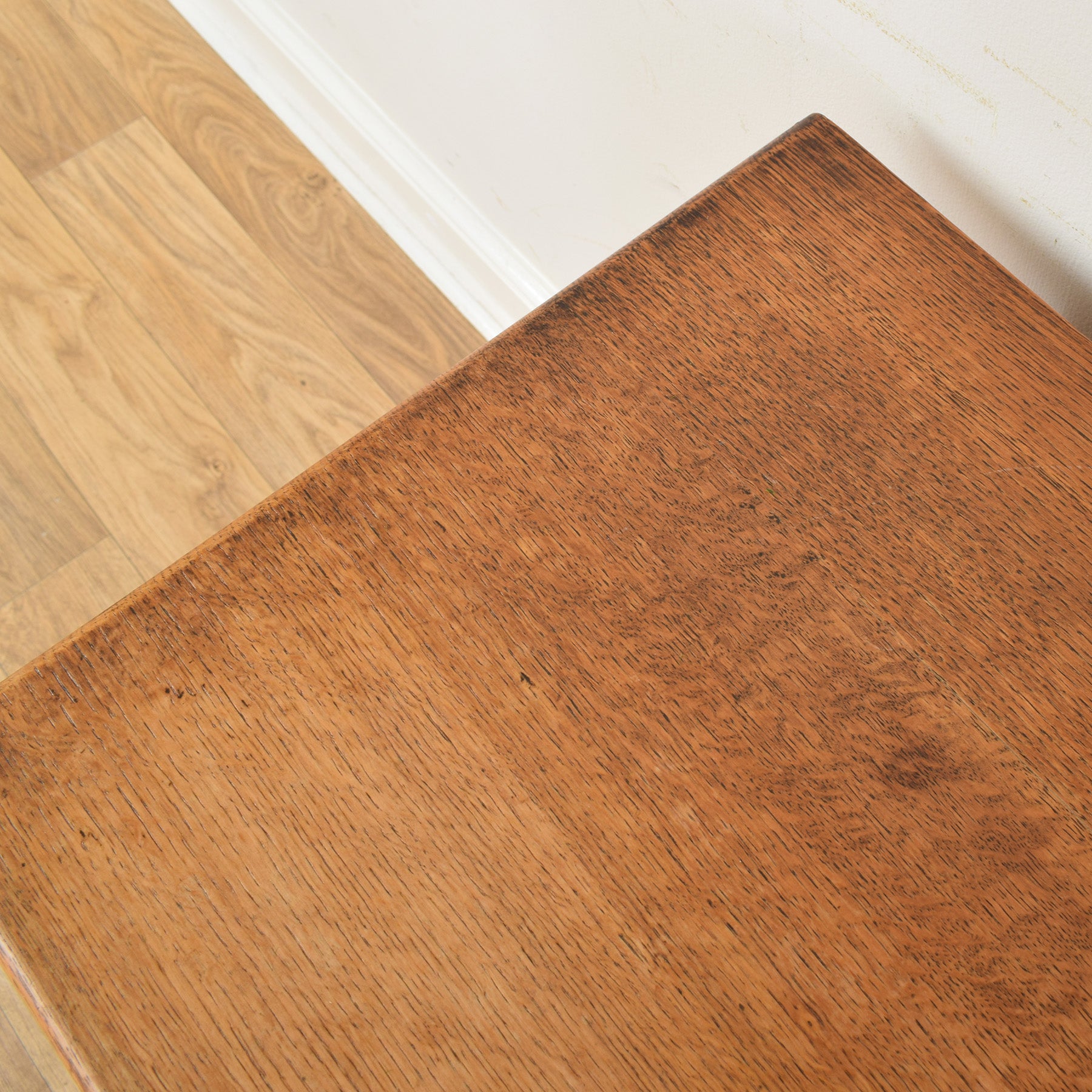 The previous darker stain has been stripped, and then multiple coats of hard-wearing matte lacquer have been applied, providing a durable long-lasting finish, while also accentuating the natural oak grain. There is some discolouration visible on the top surface, and small pieces of moulding are missing at the rear, both reflected in the overall character of the piece. This item is made entirely from oak.