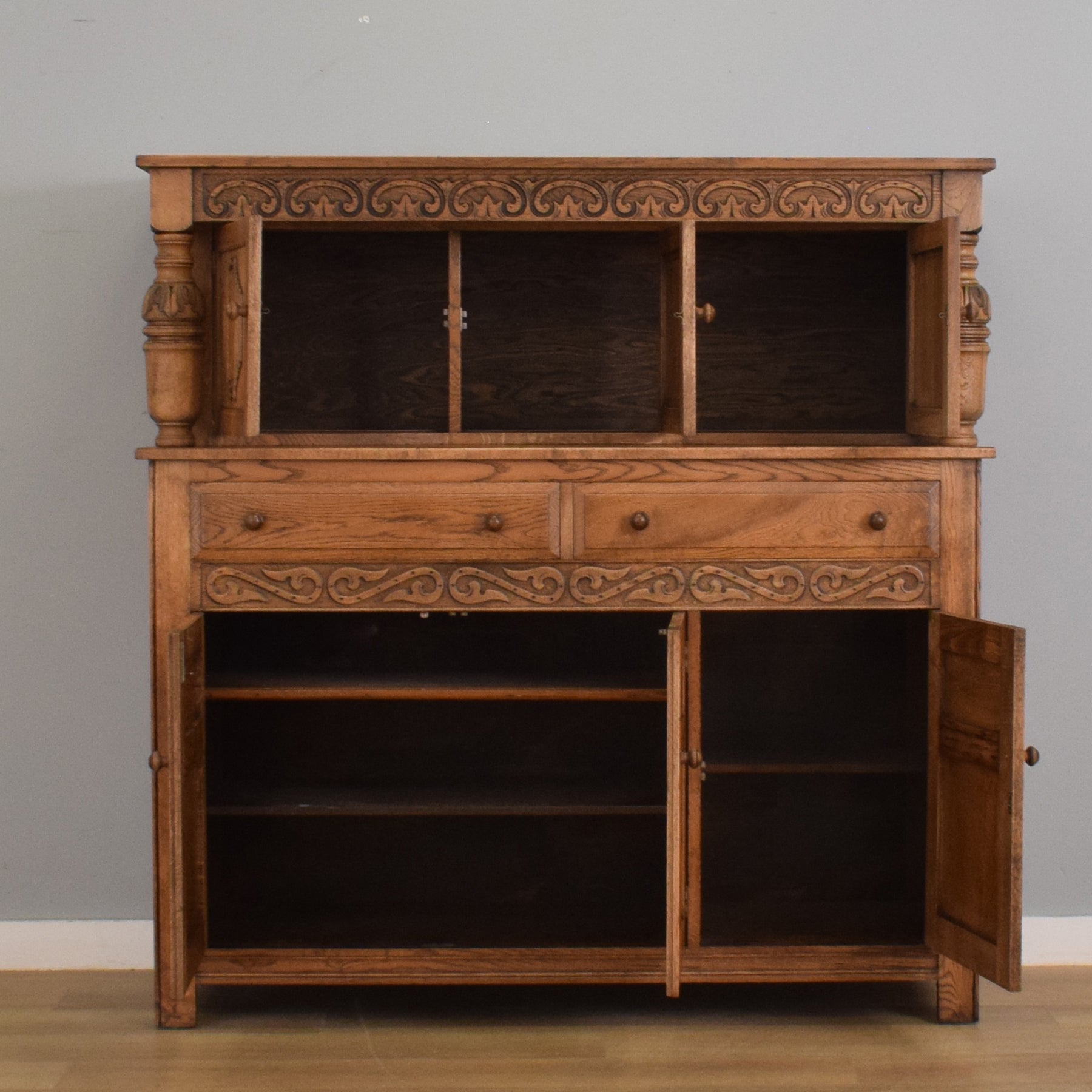 This example features a striking combination of open display sections, enclosed cupboards, and carved embellishments. The upper tier includes turned supports and three cupboard doors with ornate carved detailing. Below, the main body of the cabinet offers two drawers and spacious double-door and single-door cupboards.