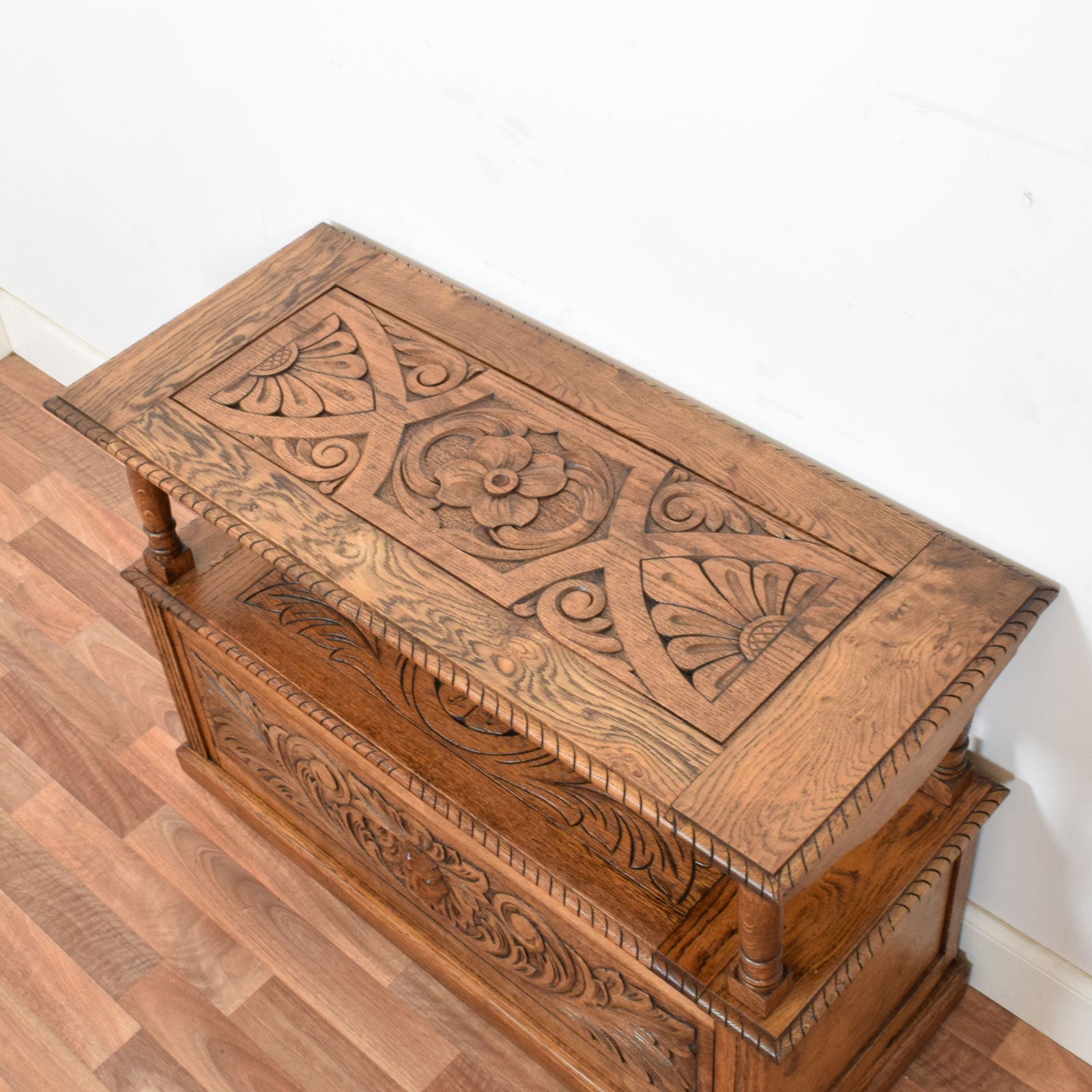 This beautifully detailed carved monk’s bench is a striking and practical addition to any hallway, living space, or traditional interior. Combining character and craftsmanship, it offers both seating and storage, making it ideal for keeping shoes, blankets, or other household items neatly tucked away while serving as an attractive focal point in the room.