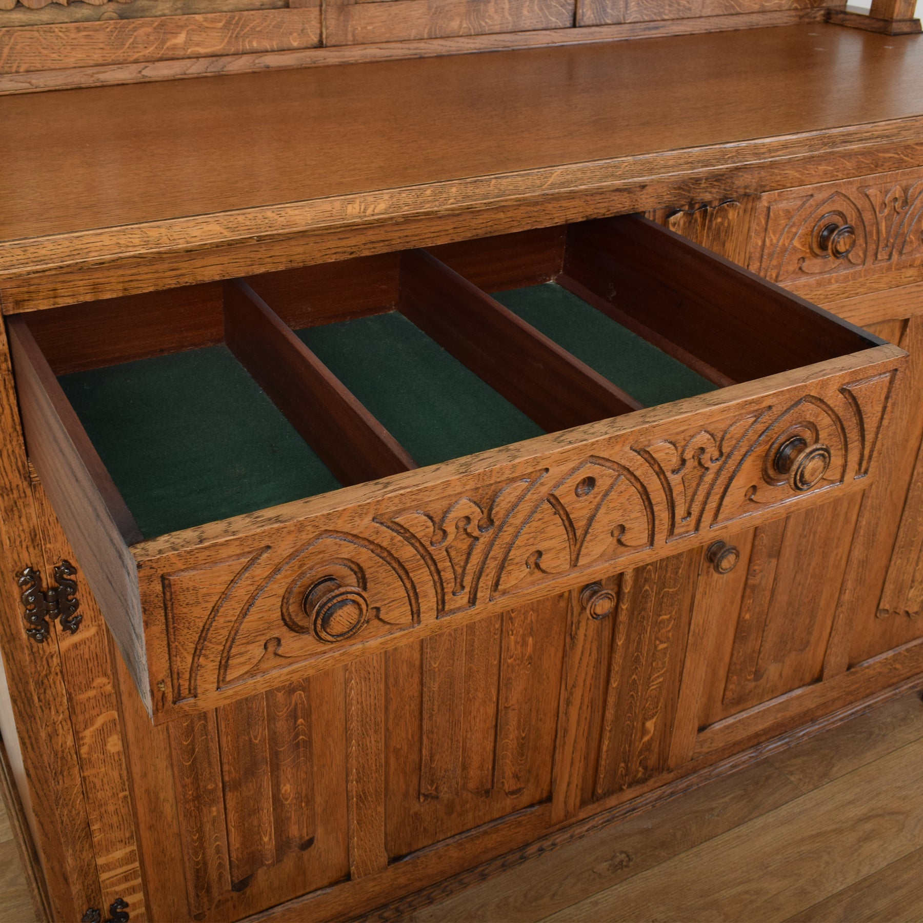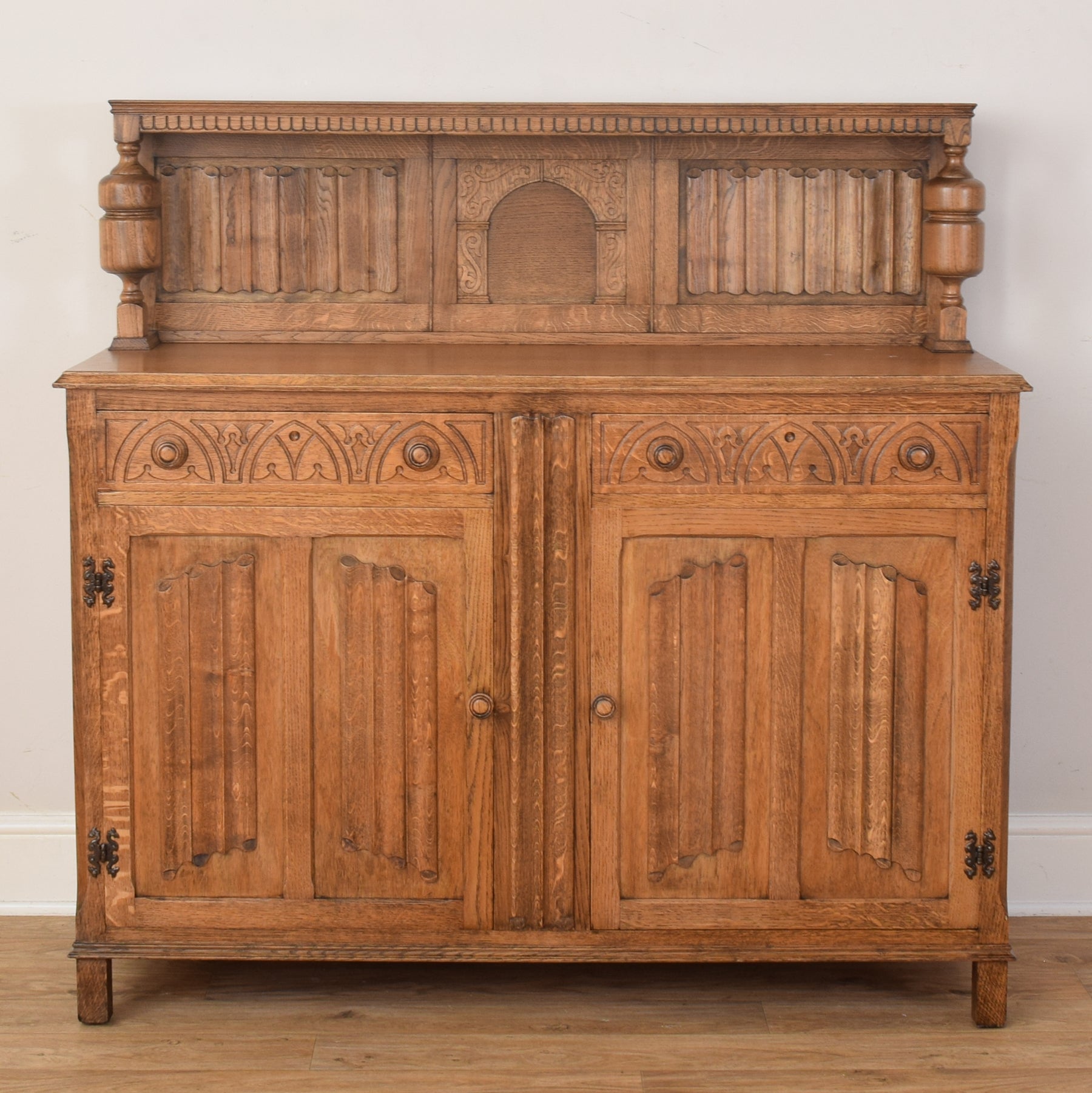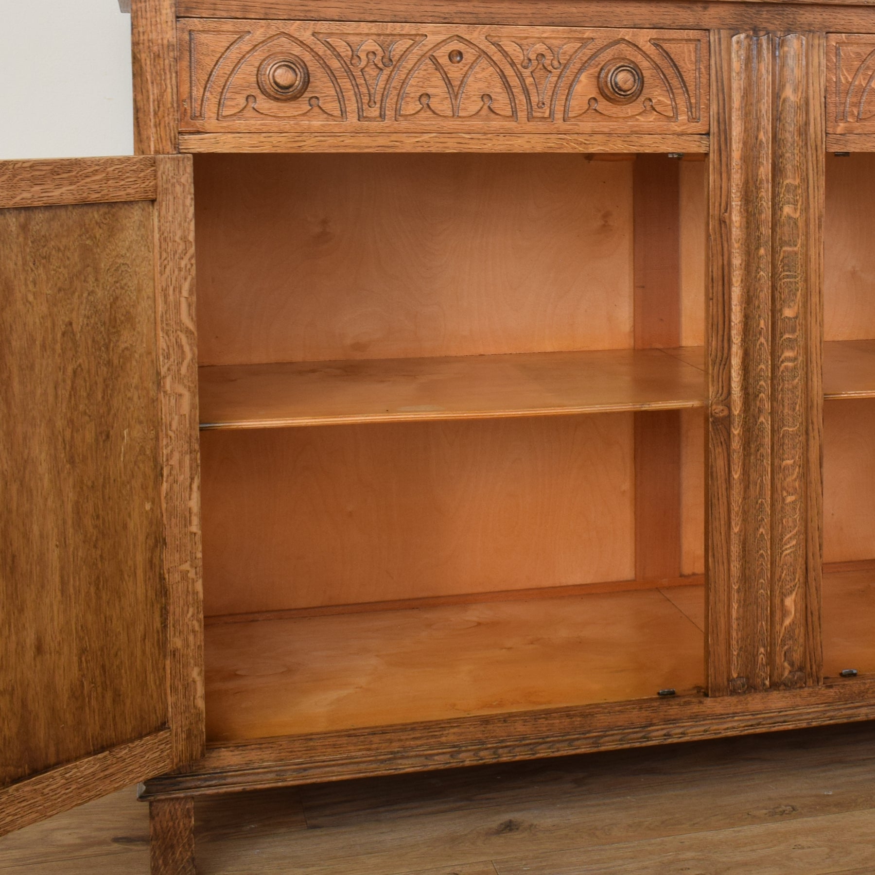 This carved oak sideboard features intricate Gothic-style carvings across the upper and lower panels, adding depth and interest to its design. The raised back includes turned supports and decorative moulding, while the twin cupboard doors below open to reveal generous storage space. The rich tone of the oak highlights the natural grain, giving the piece a warm and inviting presence.