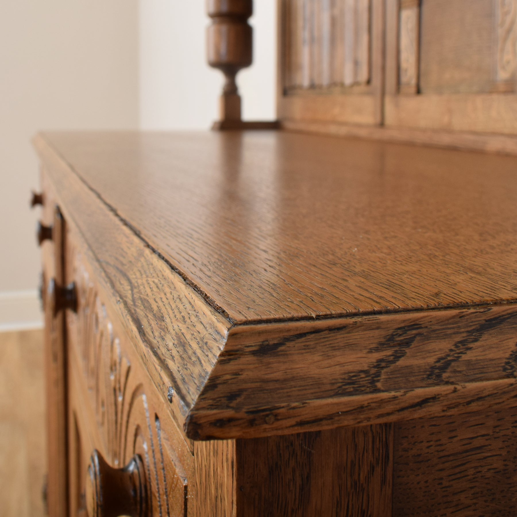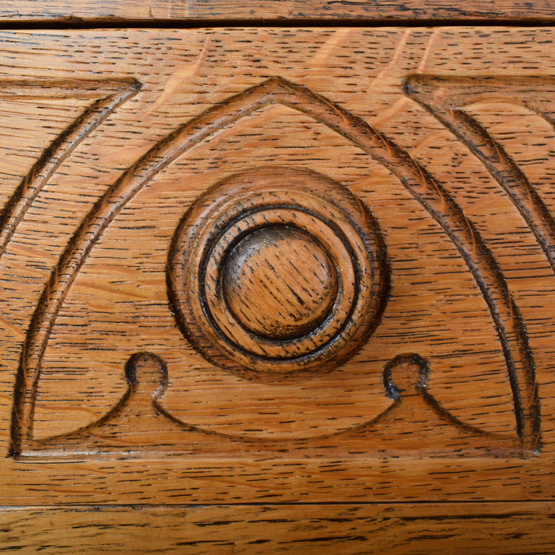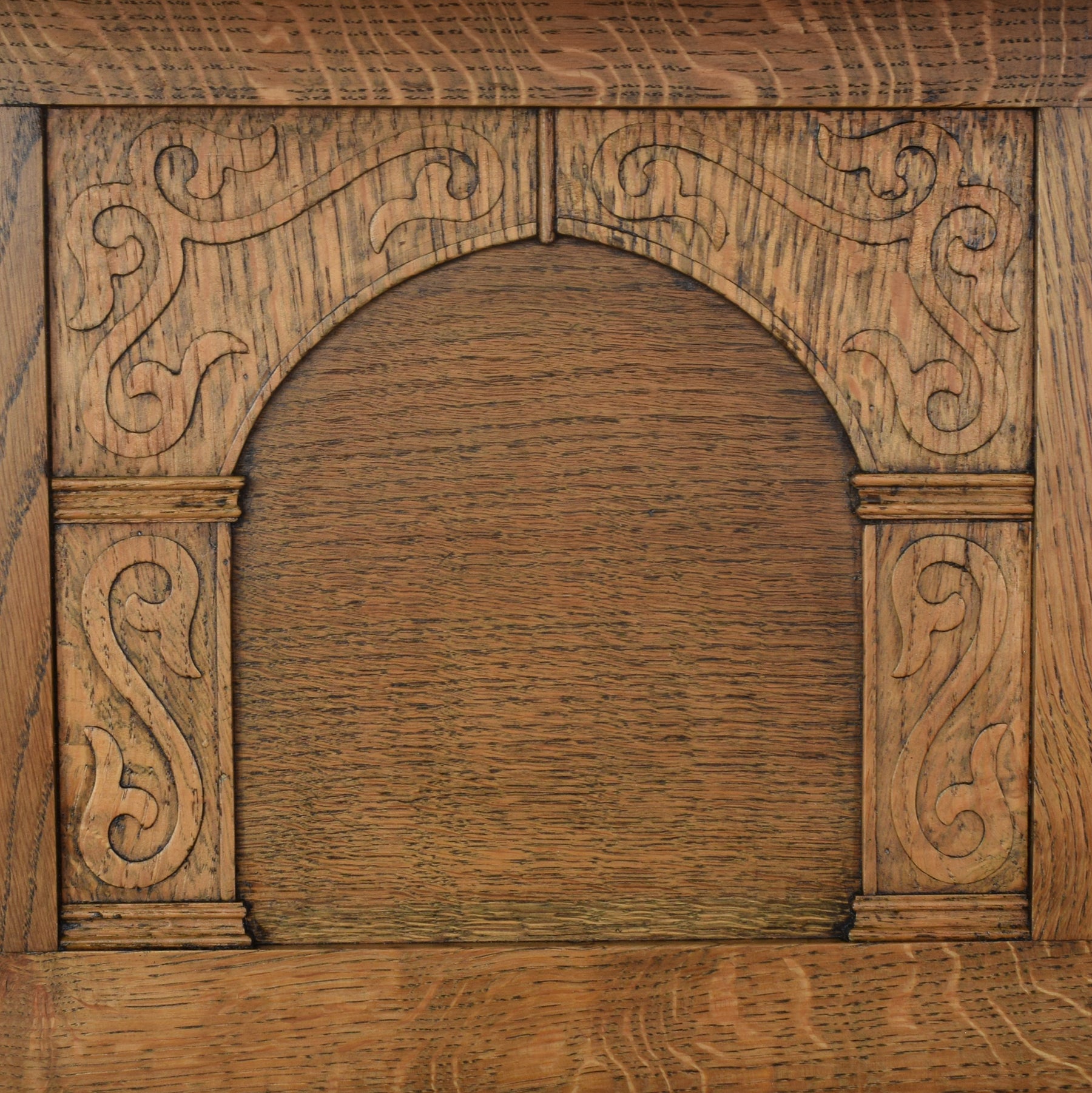 This carved oak sideboard features intricate Gothic-style carvings across the upper and lower panels, adding depth and interest to its design. The raised back includes turned supports and decorative moulding, while the twin cupboard doors below open to reveal generous storage space. The rich tone of the oak highlights the natural grain, giving the piece a warm and inviting presence.