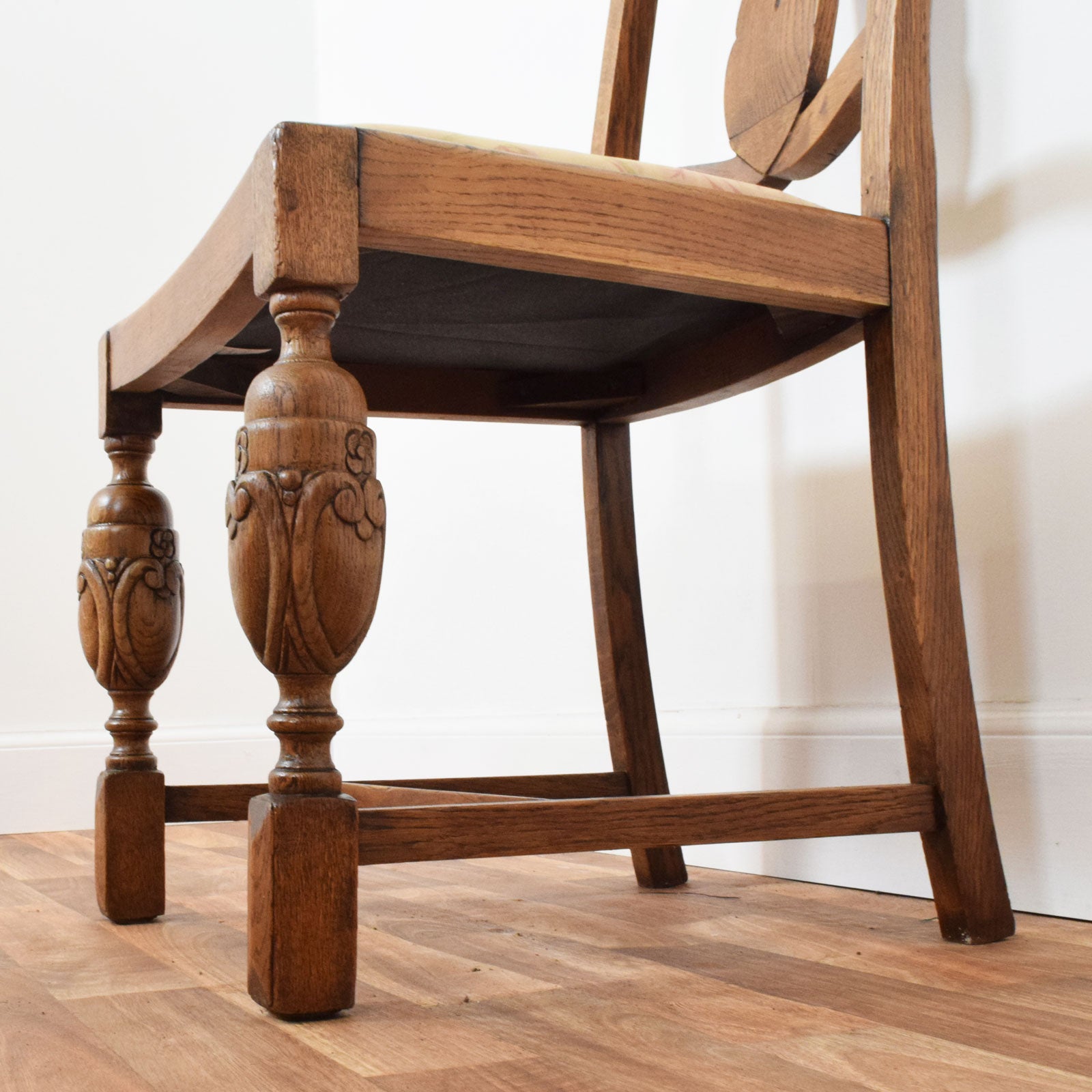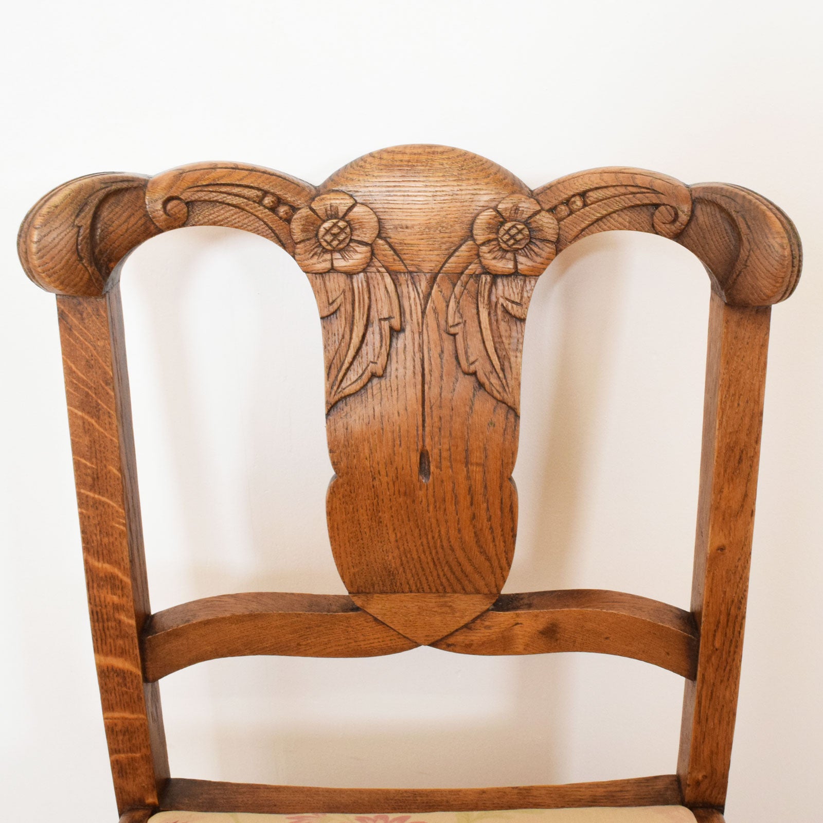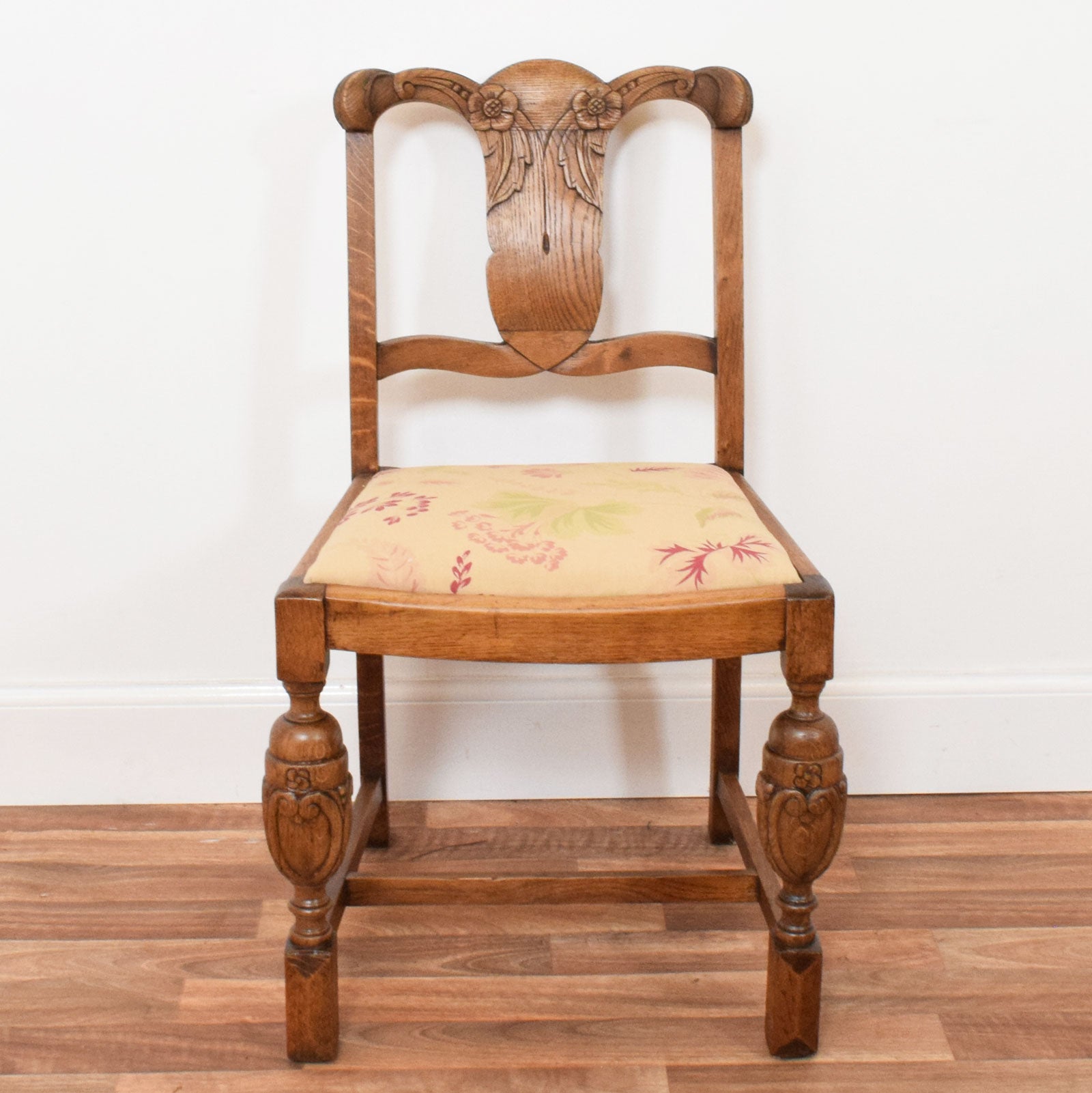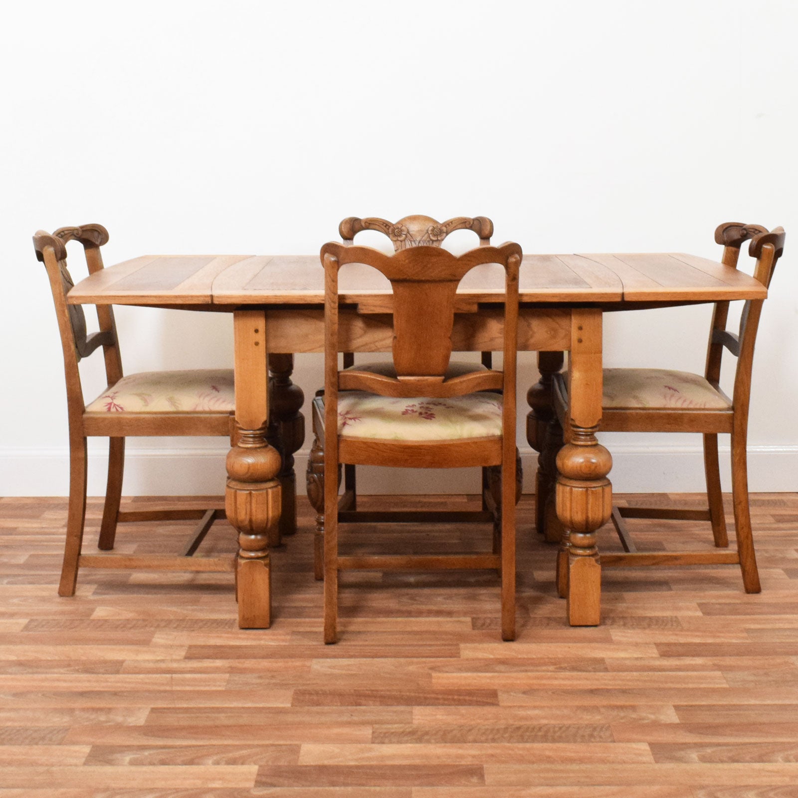 The four matching chairs feature carved splat backs with decorative floral motifs and sturdy carved front legs that echo the detailing of the table. The seats have been newly reupholstered in a neutral-toned fabric with a subtle floral pattern, complementing the warmth of the oak frames while providing comfort and a refreshed finish.