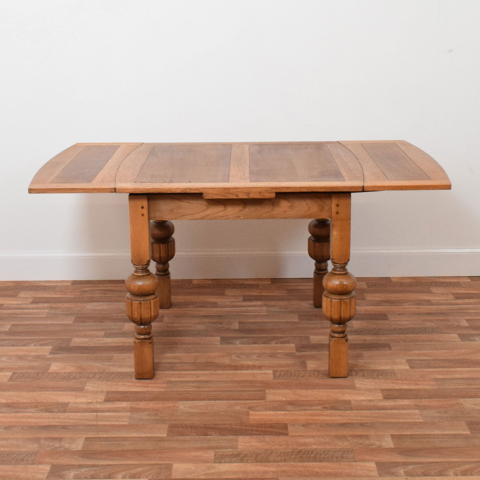The table features a classic rectangular top with contrasting oak tones that highlight the natural variation in the timber and veneer. It stands on beautifully turned and carved legs with bold, bulbous detailing. Constructed mainly from solid oak, the piece also incorporates compressed wood sections finished in oak veneer, combining durability with decorative appeal.