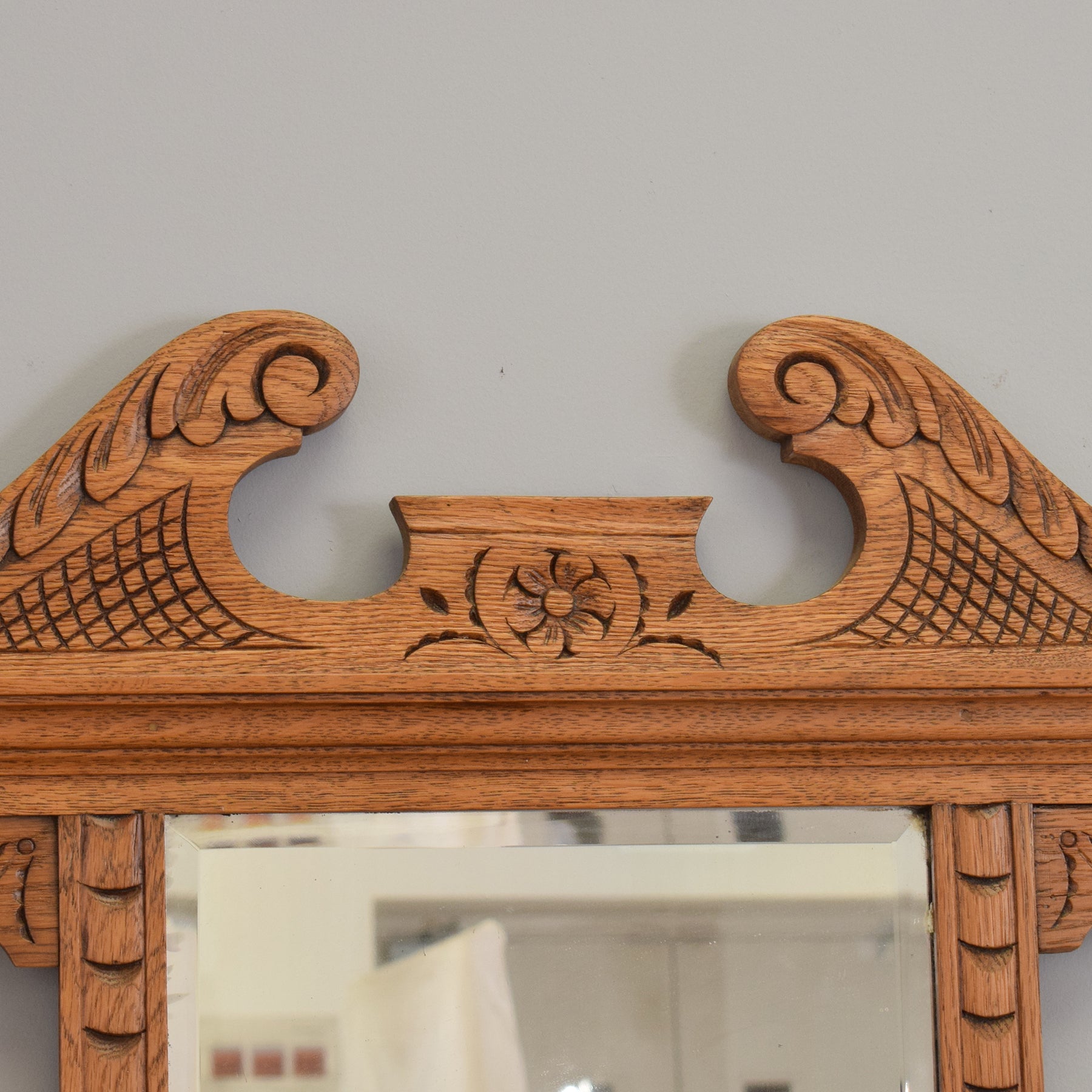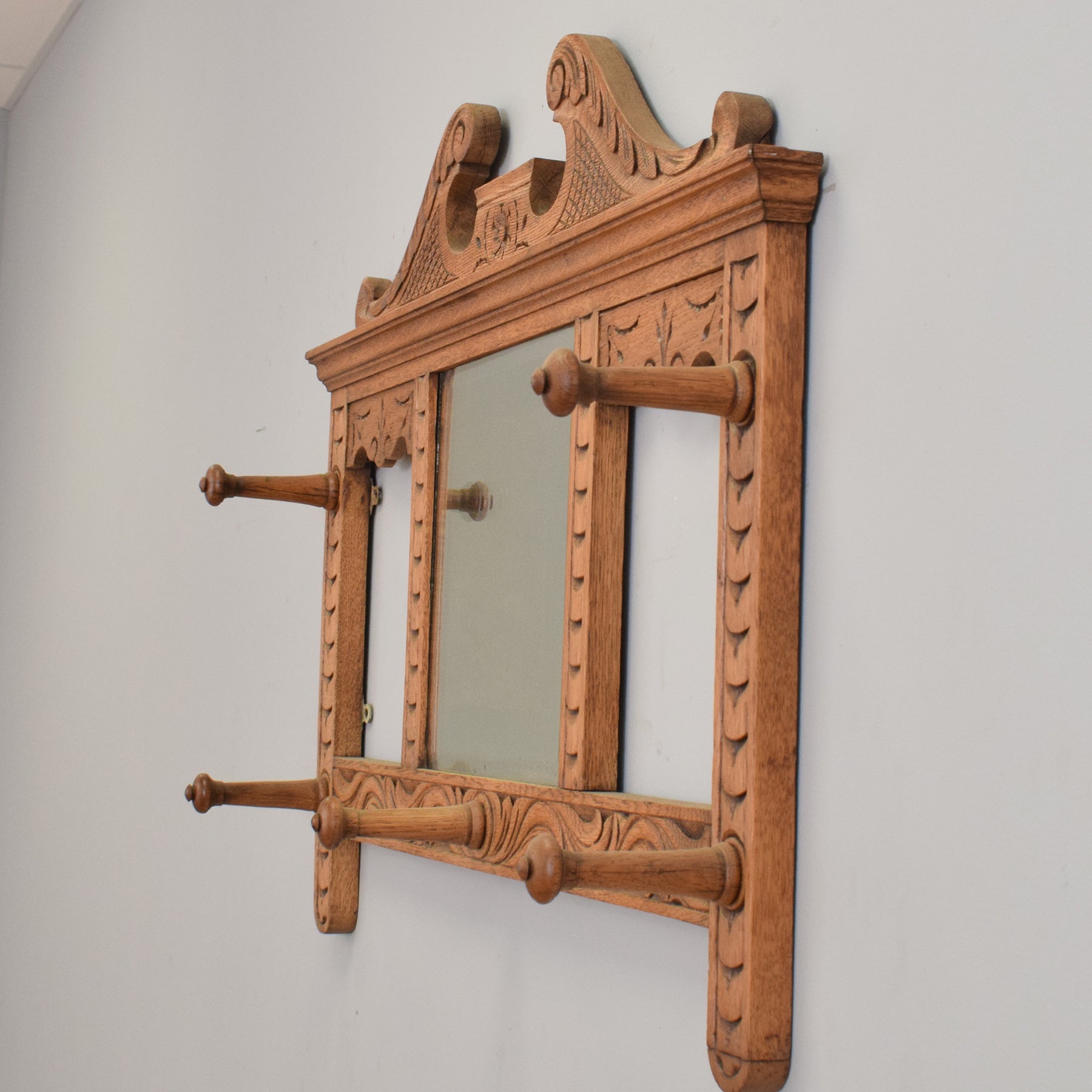 This vintage wall mirror features a richly detailed carved oak frame, showcasing a symmetrical scroll pediment with floral and lattice accents that draw the eye upward. The central bevel-edged mirror is flanked by five generously spaced pegs, ideal for light outerwear or accessories. Decorative scalloped panels and repeated carved motifs enhance the classical aesthetic, making this a standout feature in any hallway, cloakroom, or utility area.