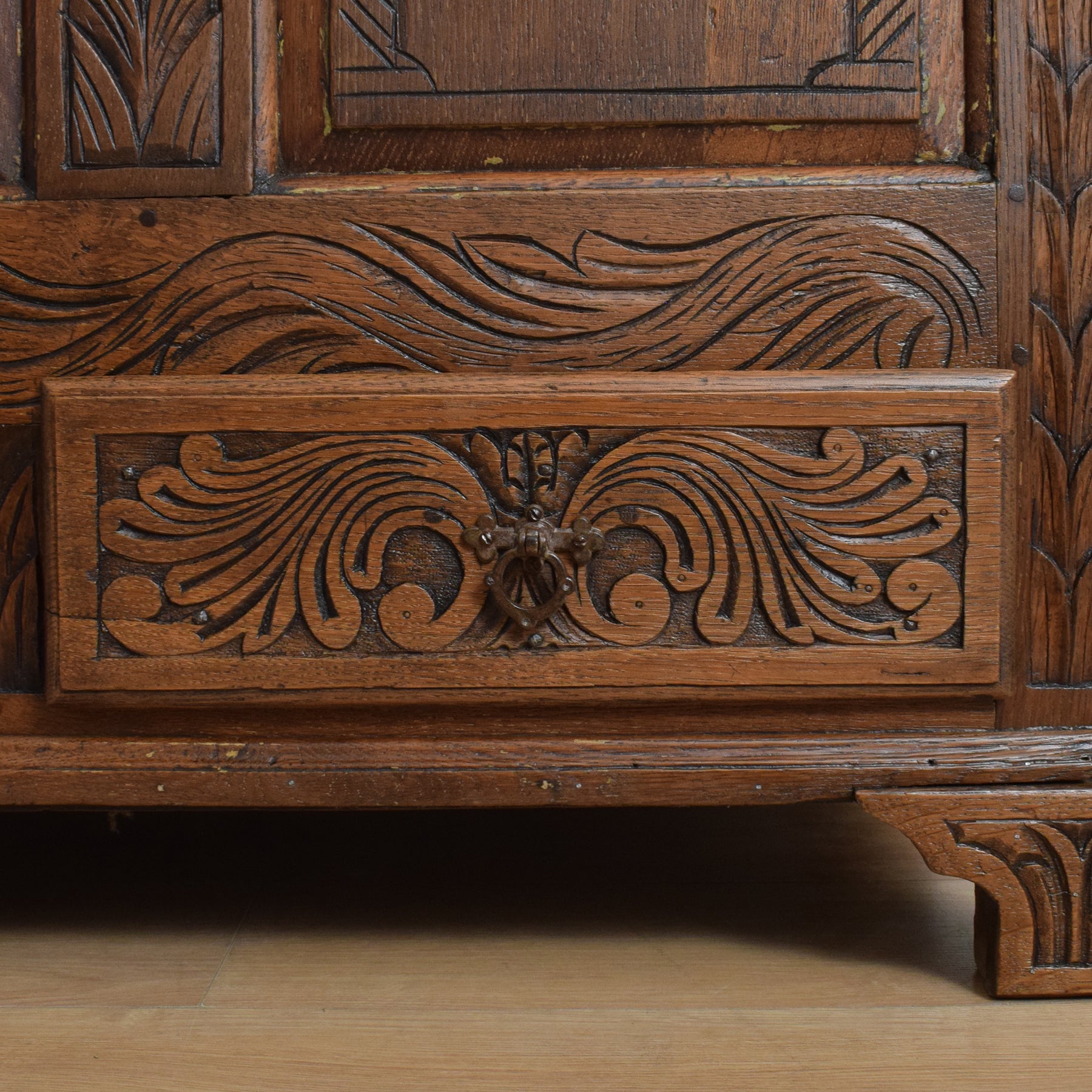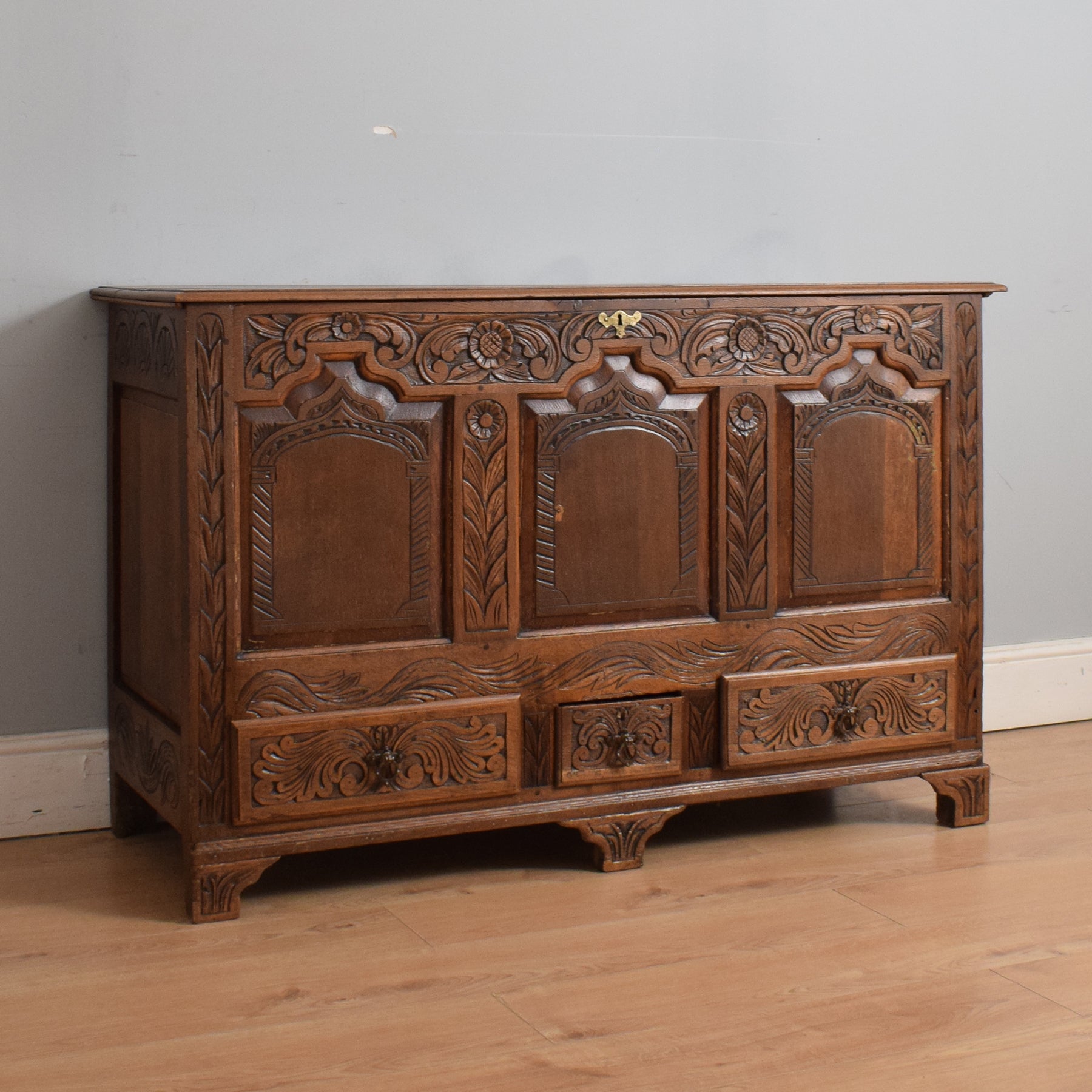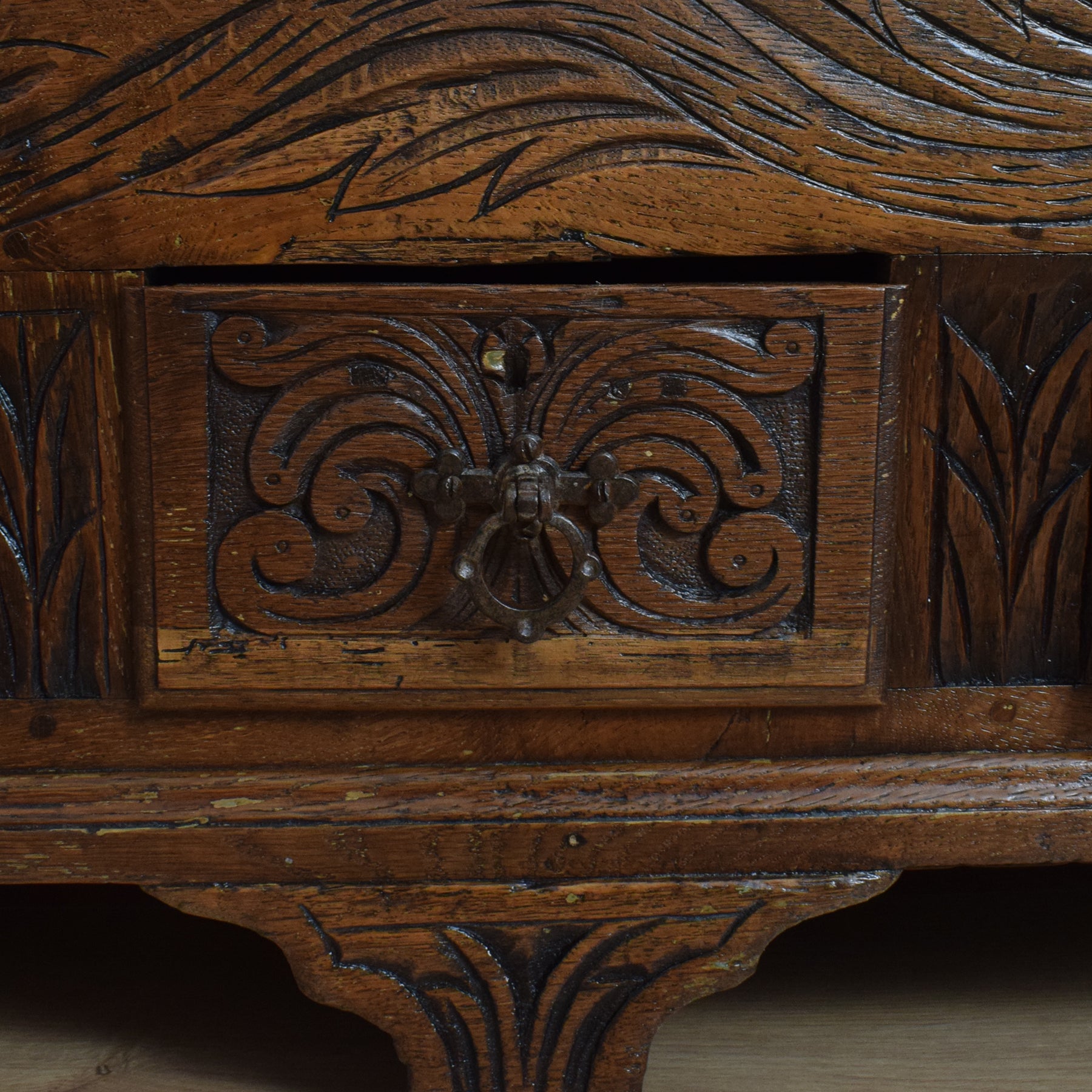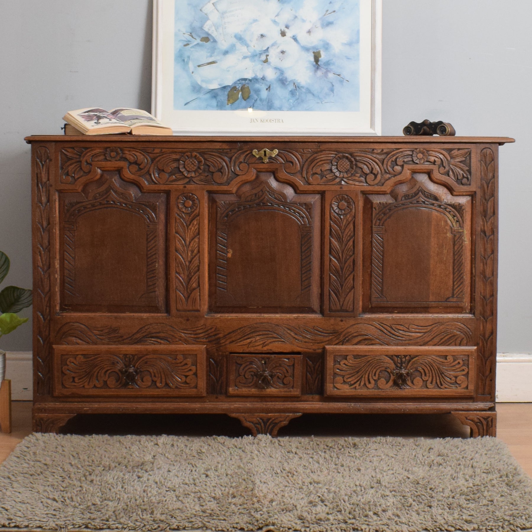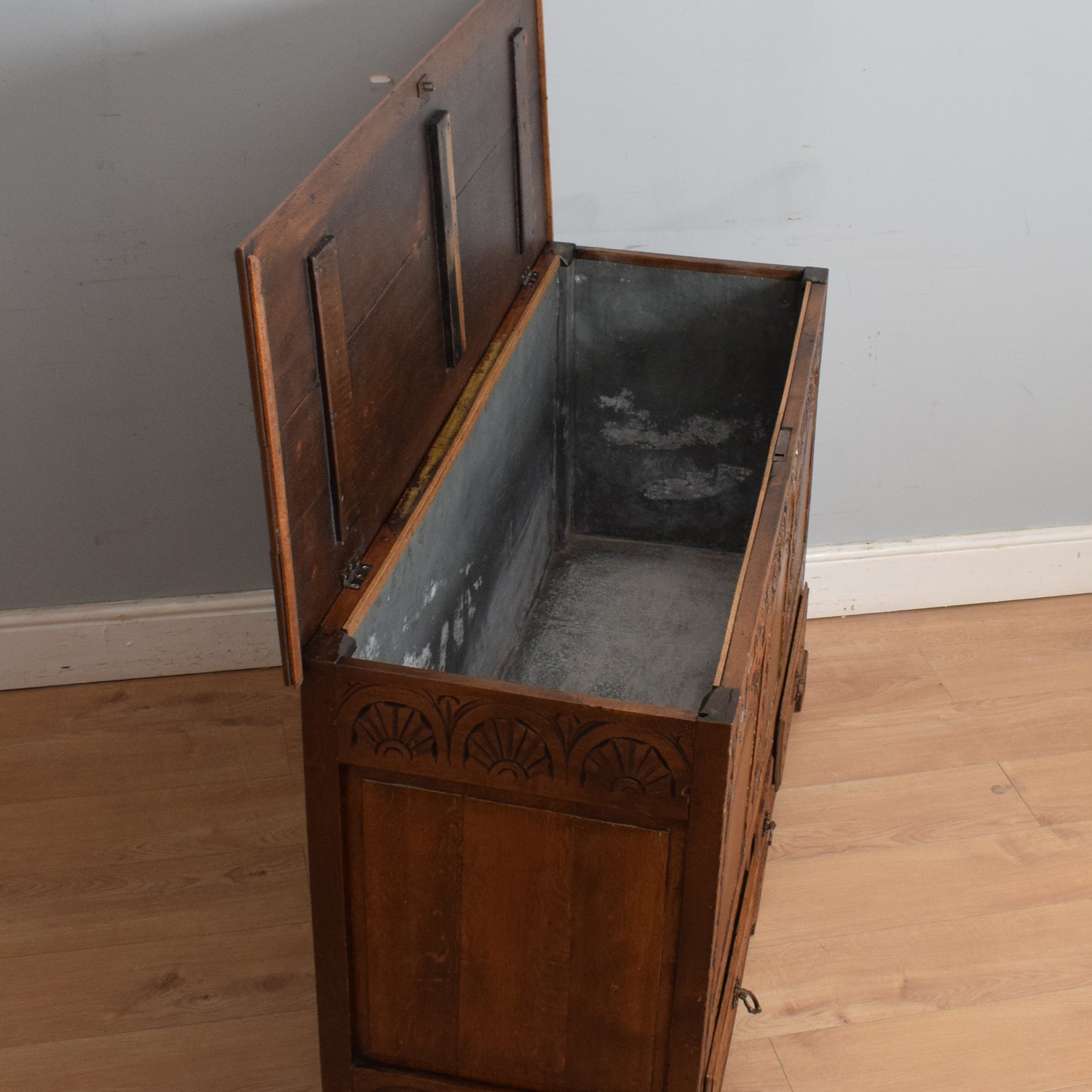 Opening the oak lid reveals a zinc-lined compartment, ideal for neatly storing blankets, spare bedding, or shoes, making it a versatile addition to any bedroom or hallway. Additionally, three drawers, also lined with zinc, offer valuable extra storage space. The intricate carving adds to its visual appeal, making it a delight to behold.