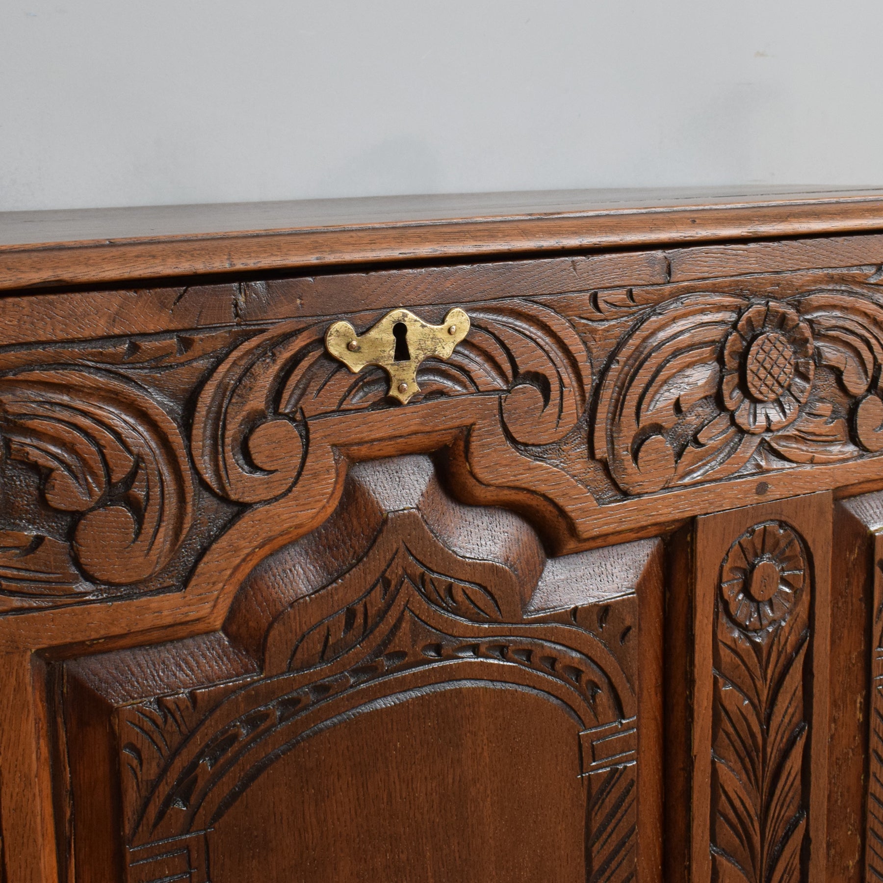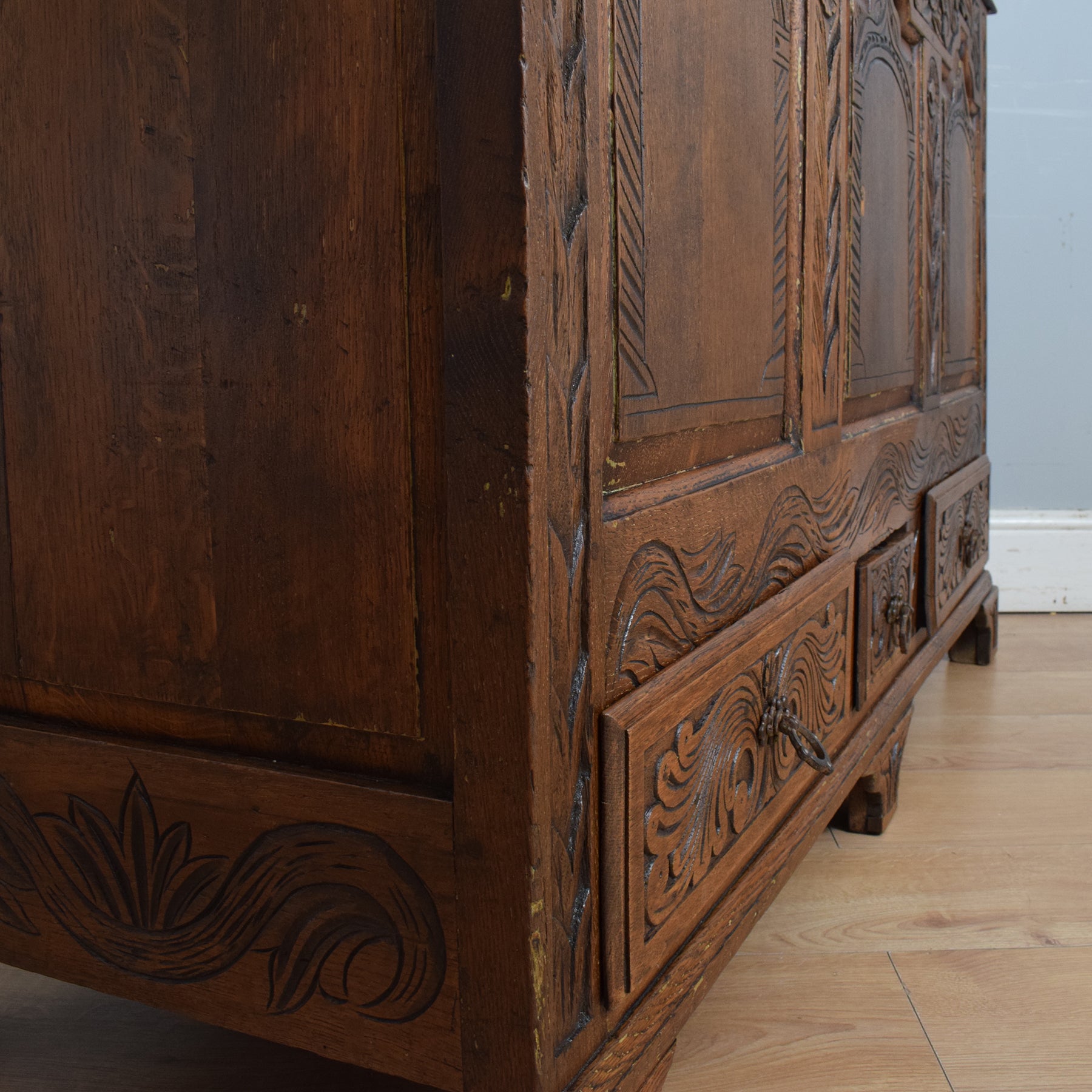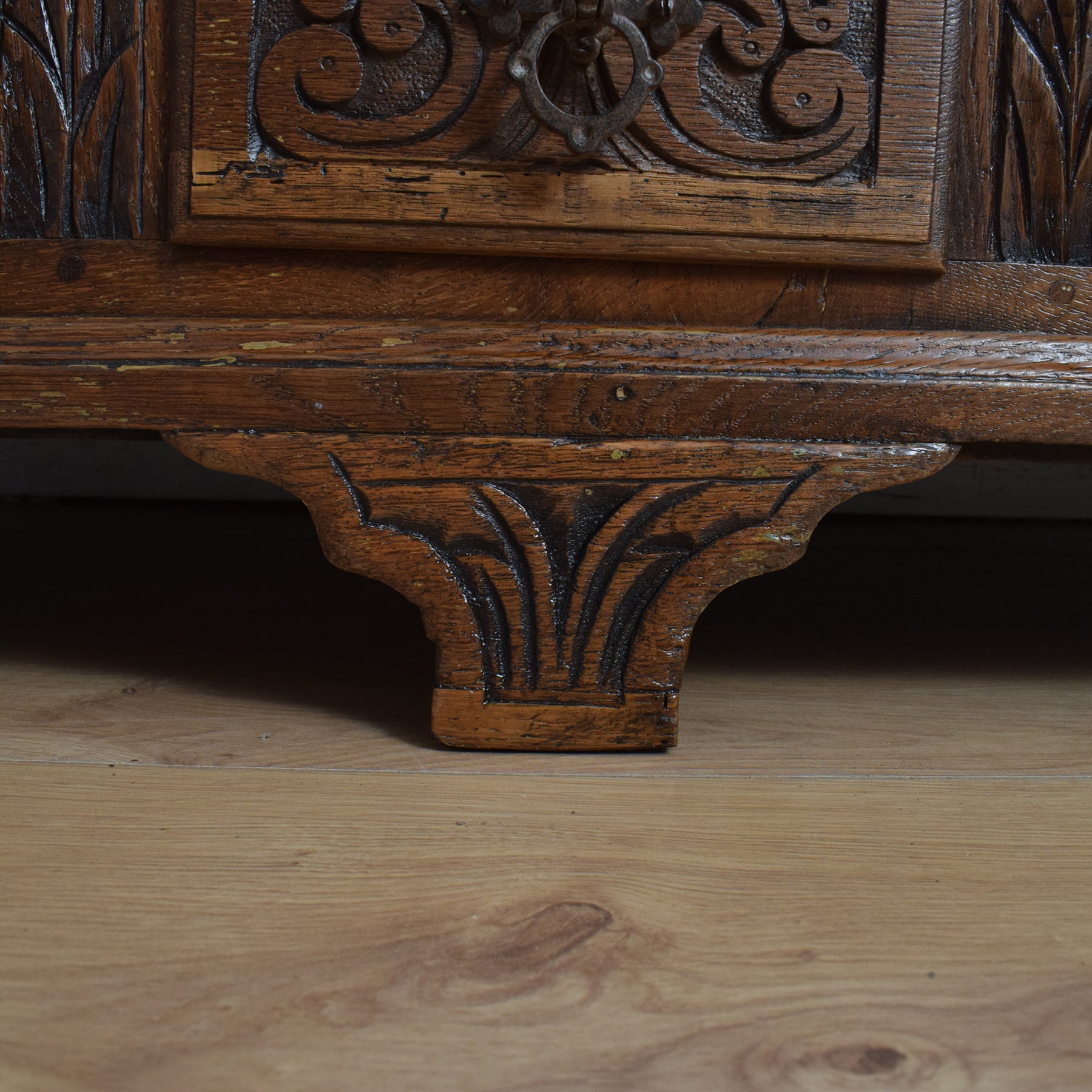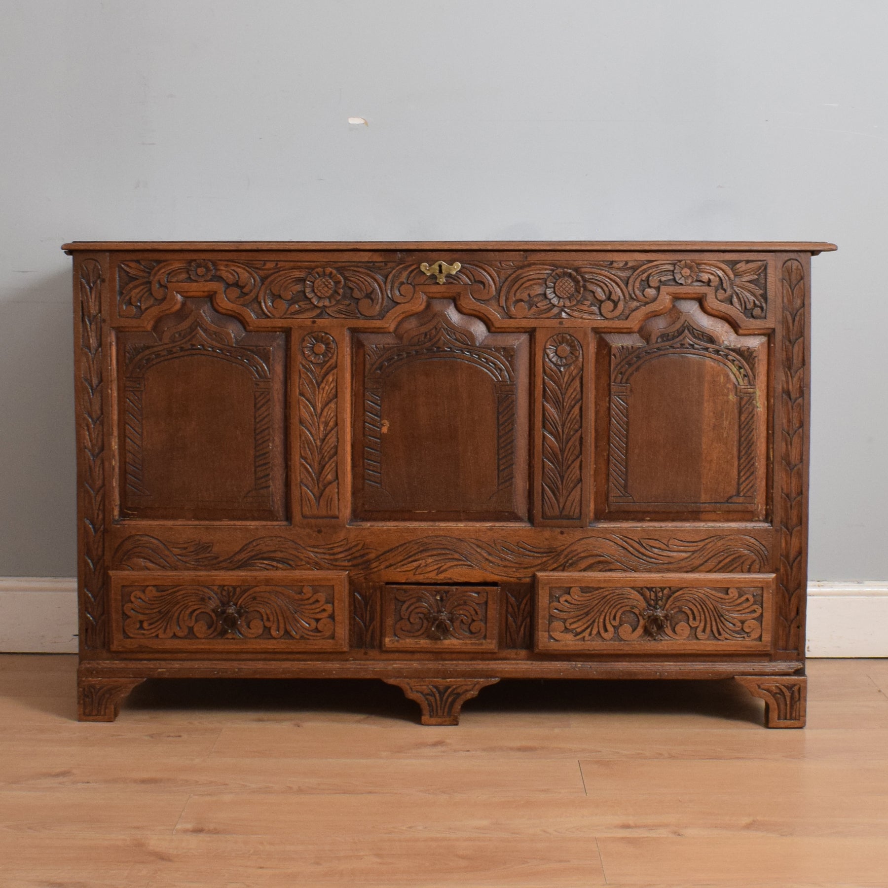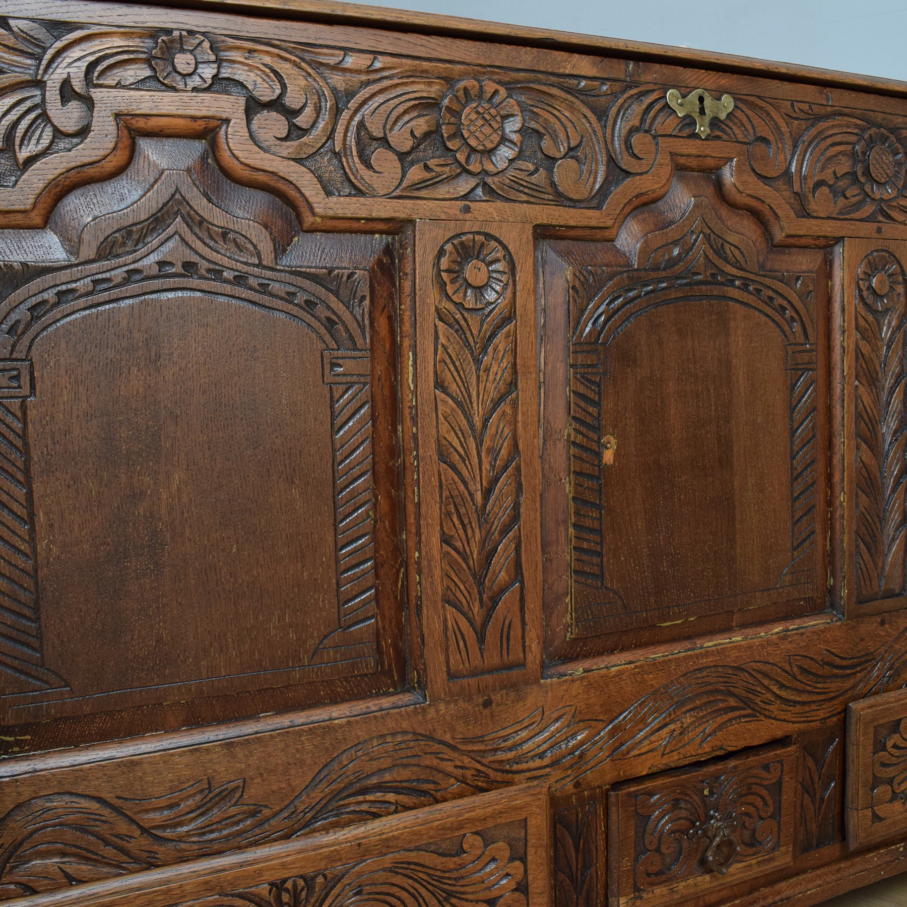 Opening the oak lid reveals a zinc-lined compartment, ideal for neatly storing blankets, spare bedding, or shoes, making it a versatile addition to any bedroom or hallway. Additionally, three drawers, also lined with zinc, offer valuable extra storage space. The intricate carving adds to its visual appeal, making it a delight to behold.