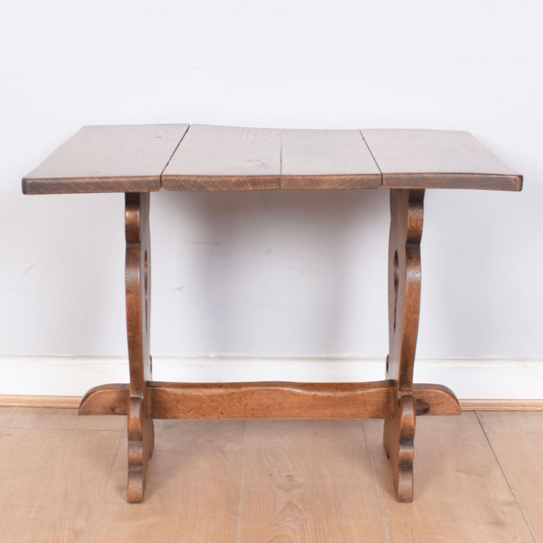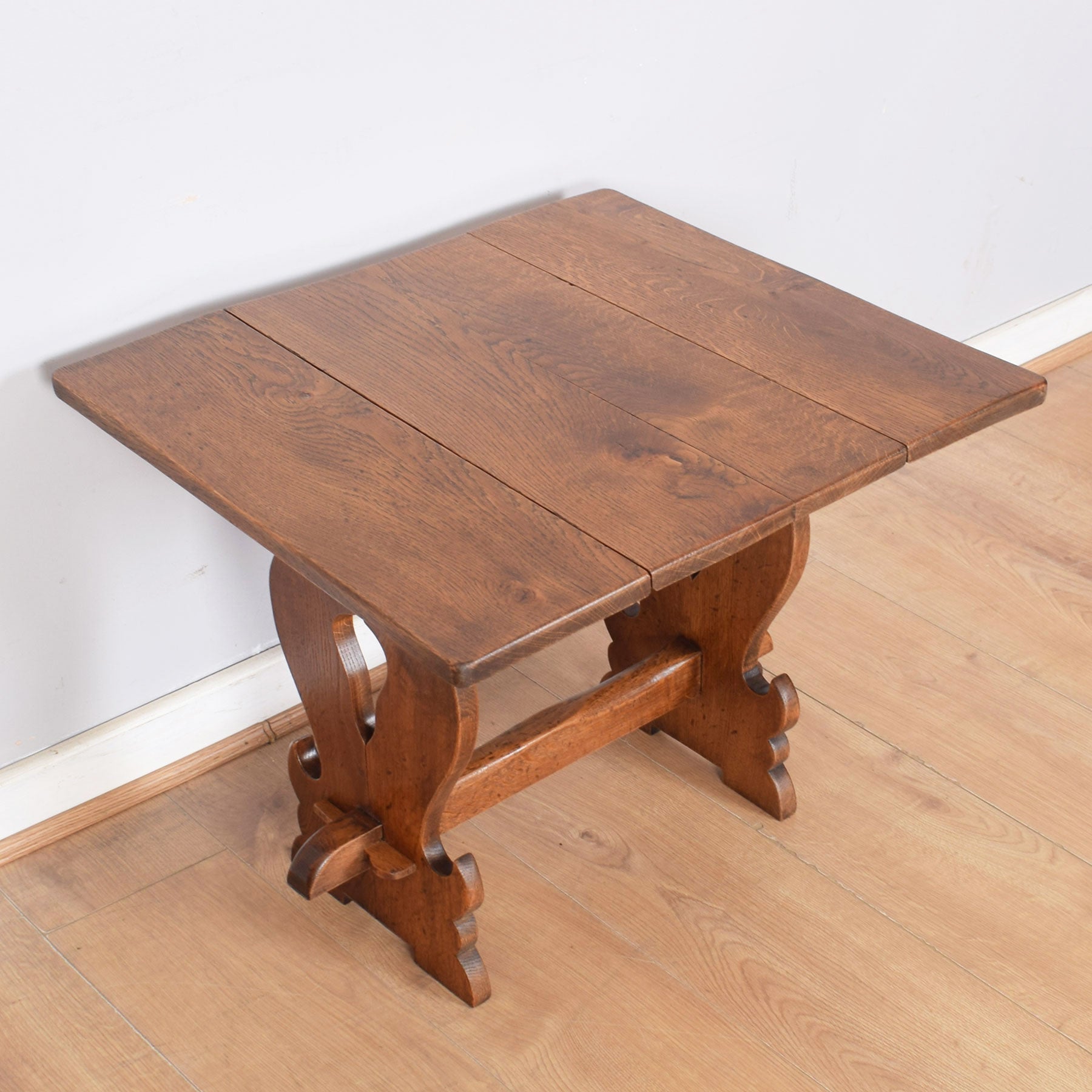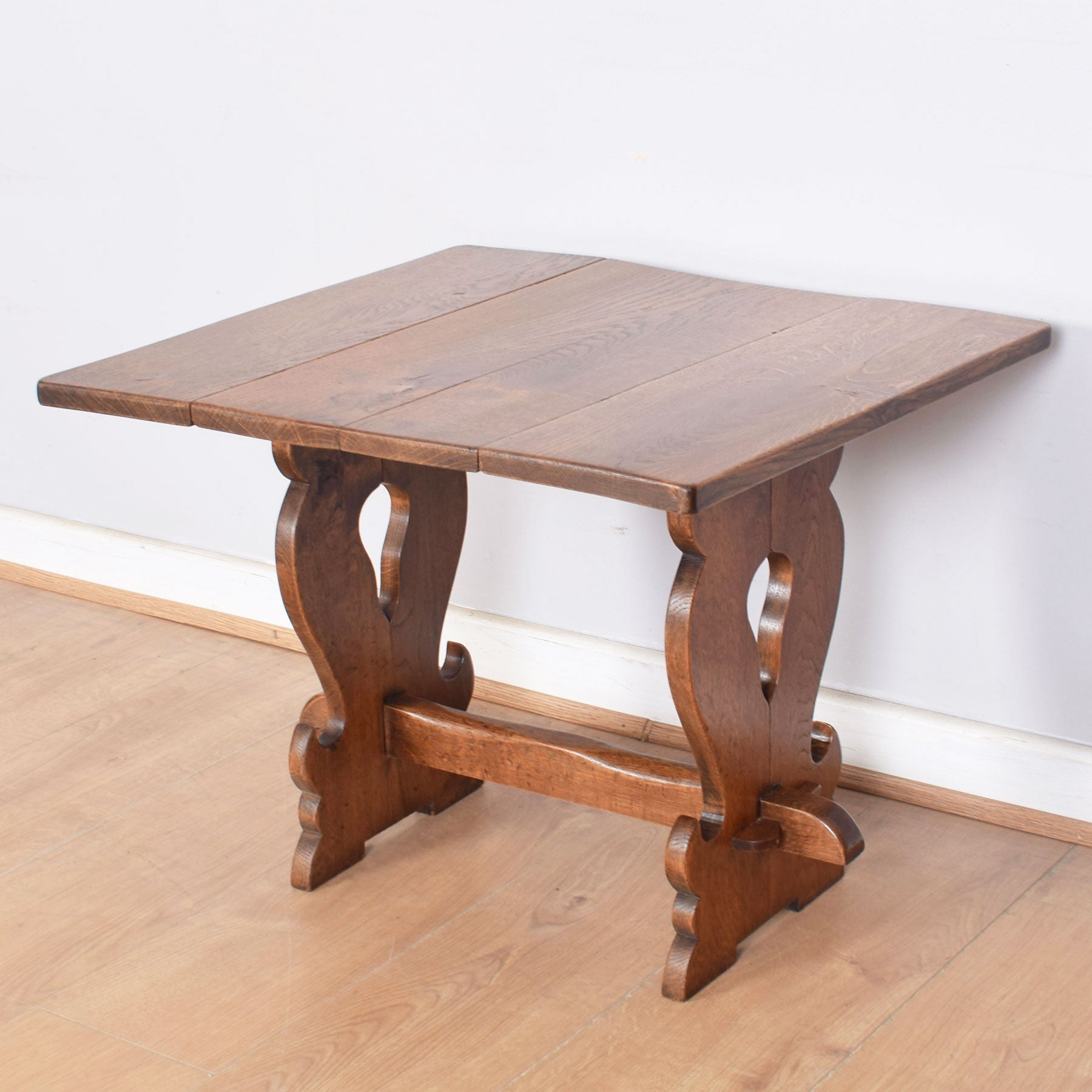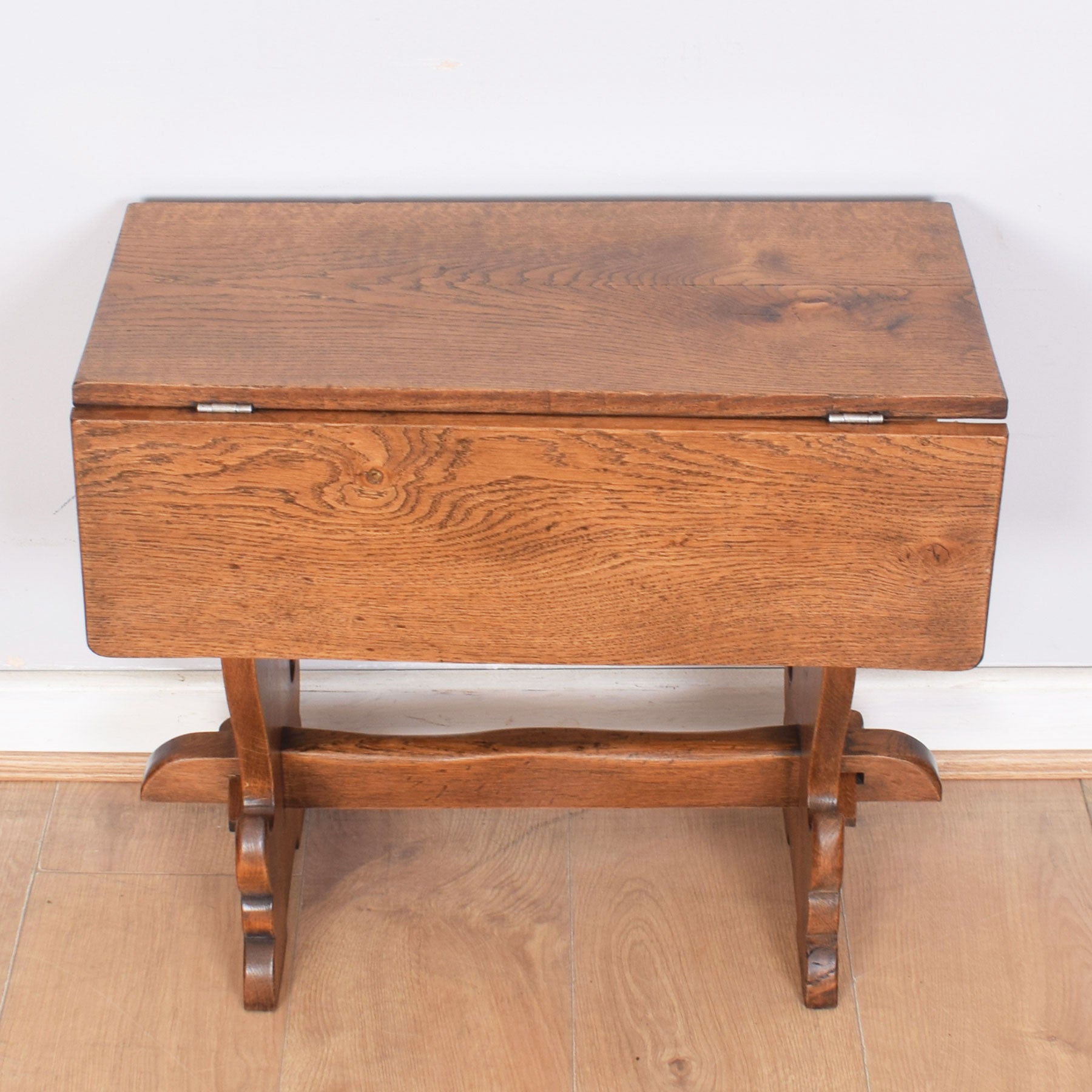 The oak top has two leaves that lift and are held in position by rotating the top through 90 degrees, giving a generous amount of space to serve tea or coffee. With the leaves folded down the table provides the ideal space to rest a reading book or stand a lamp. The nicely shaped leg frame provides a stable base.