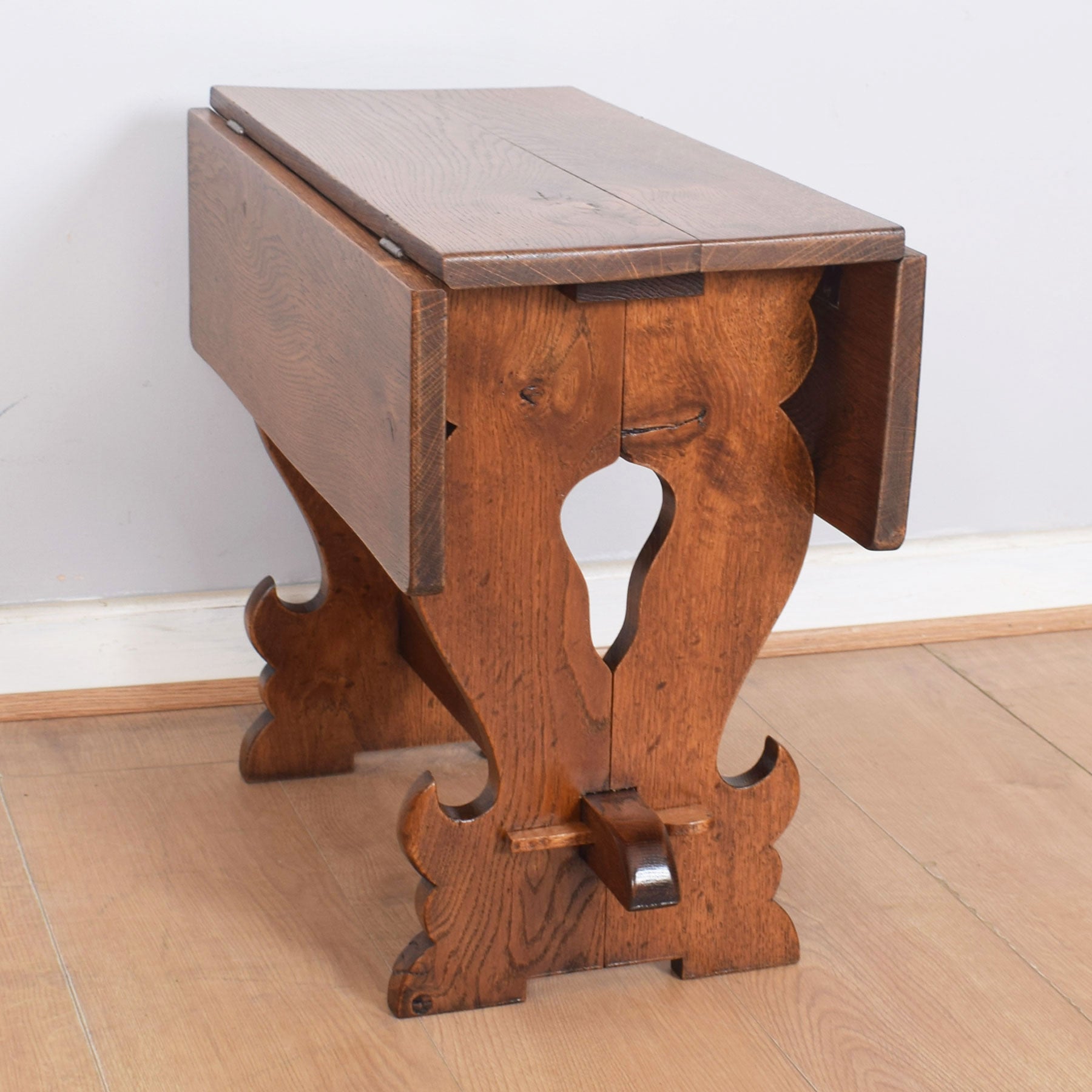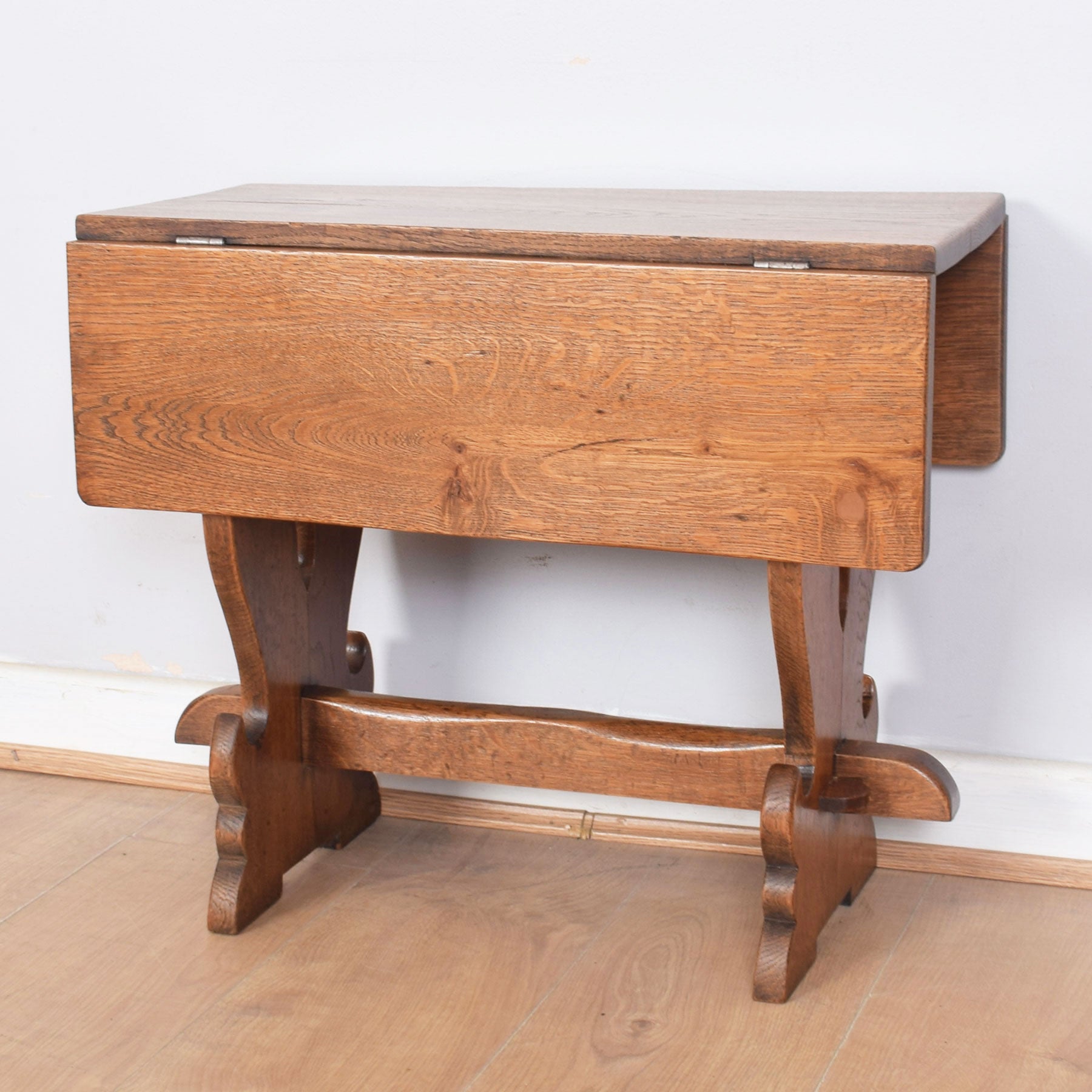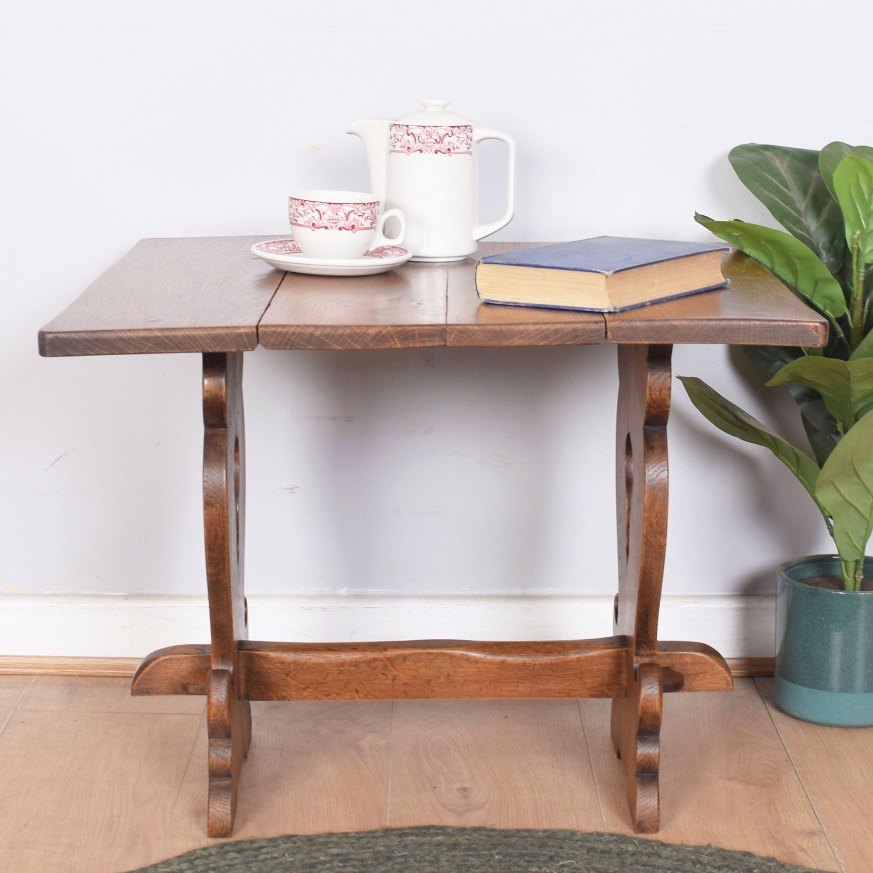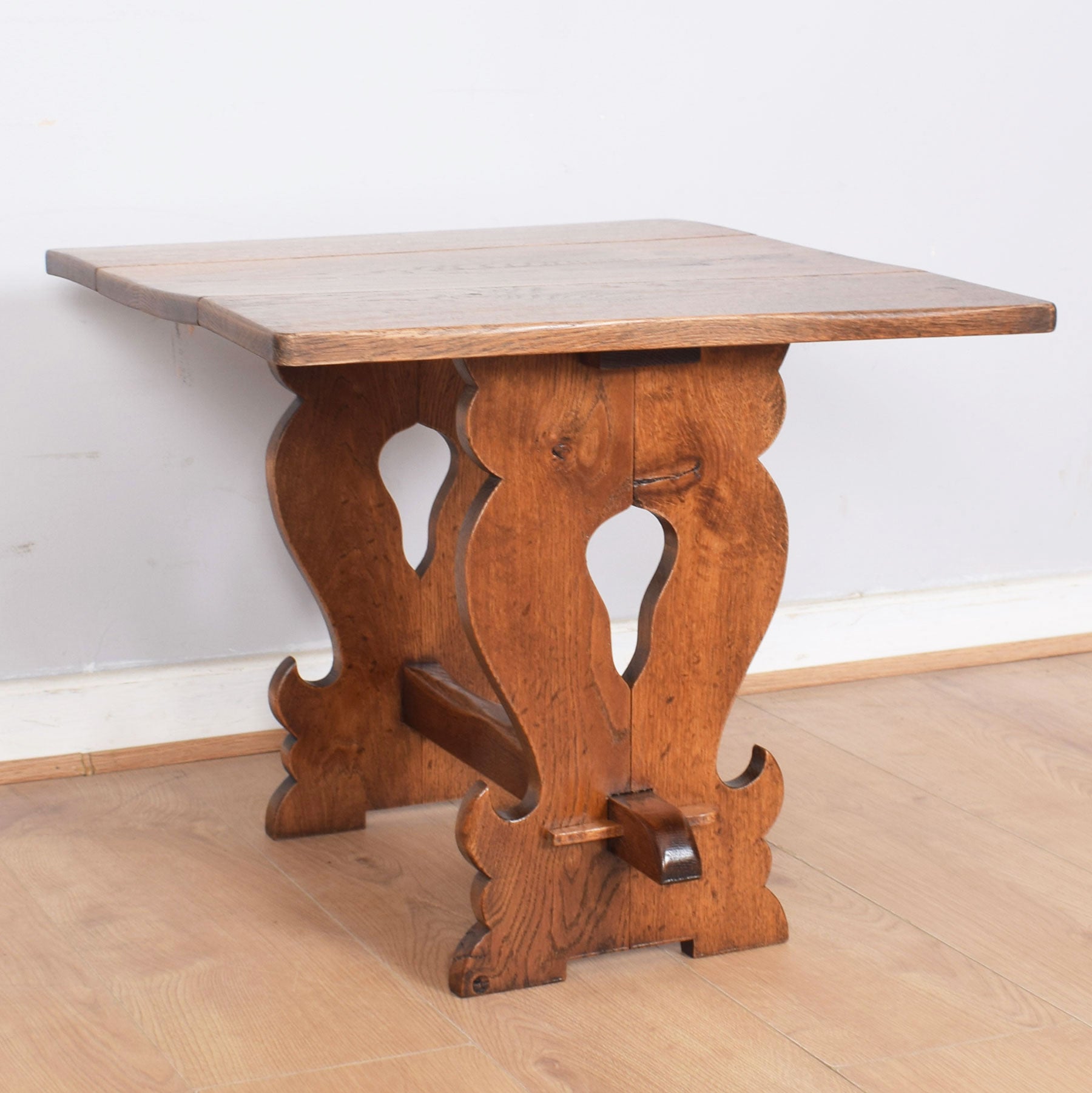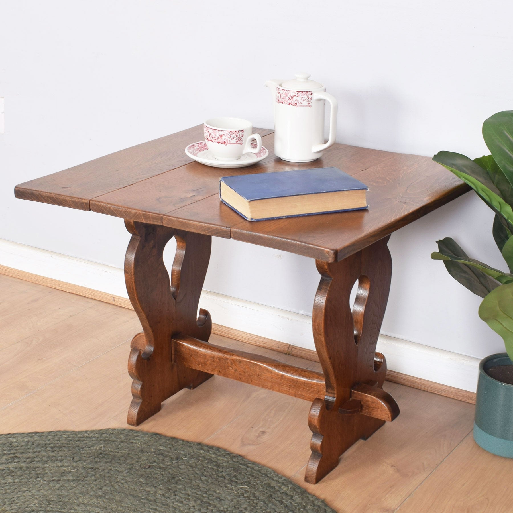 The oak top has two leaves that lift and are held in position by rotating the top through 90 degrees, giving a generous amount of space to serve tea or coffee. With the leaves folded down the table provides the ideal space to rest a reading book or stand a lamp. The nicely shaped leg frame provides a stable base.