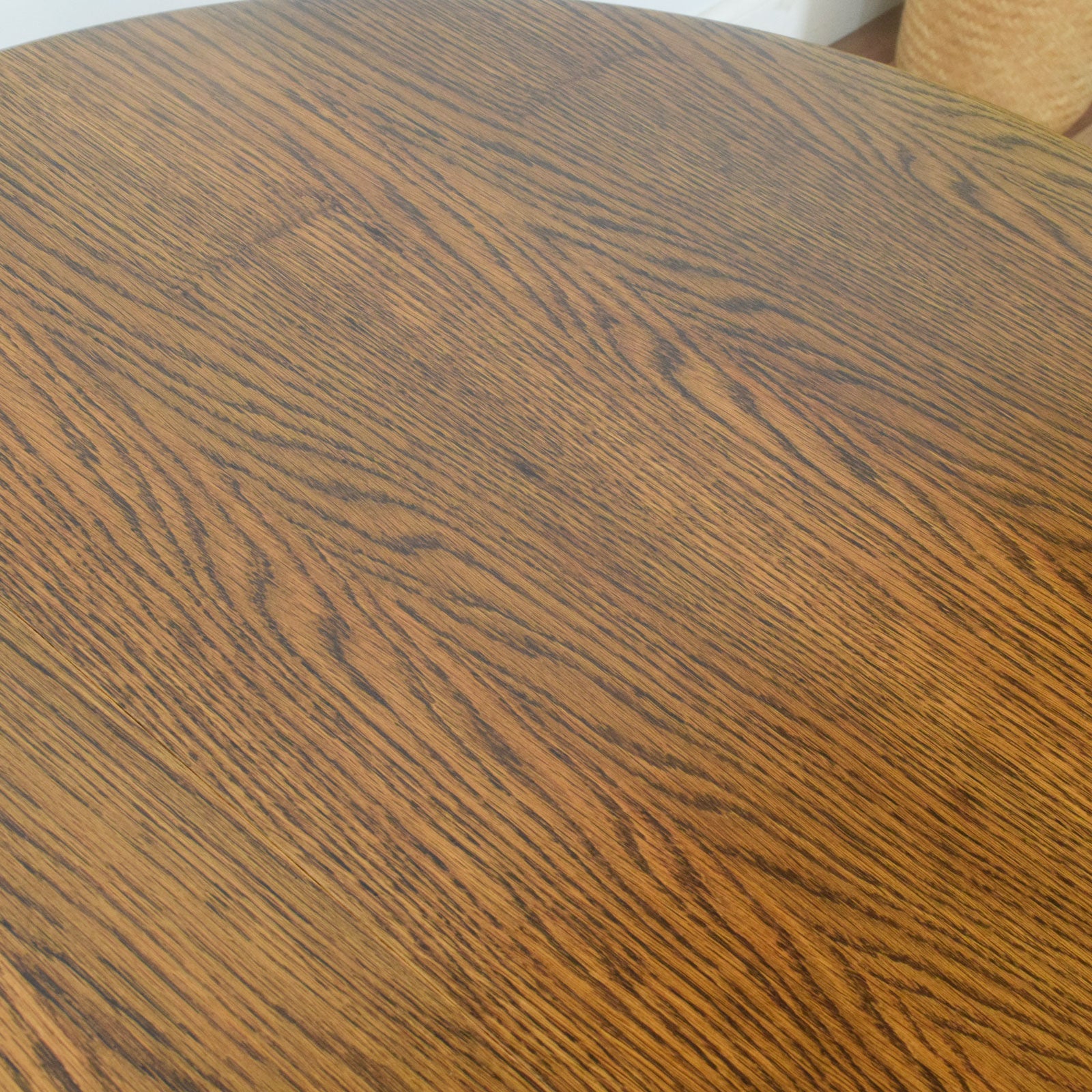 The entire set has been carefully stripped and refinished with several coats of hard-wearing matte lacquer, creating a smooth, durable finish that enhances the natural grain of the wood. The tabletop is covered in oak veneer, while other components of the set are made from a mixture of solid oak and mahogany. The seats have been professionally reupholstered, providing clean and comfortable seating throughout.