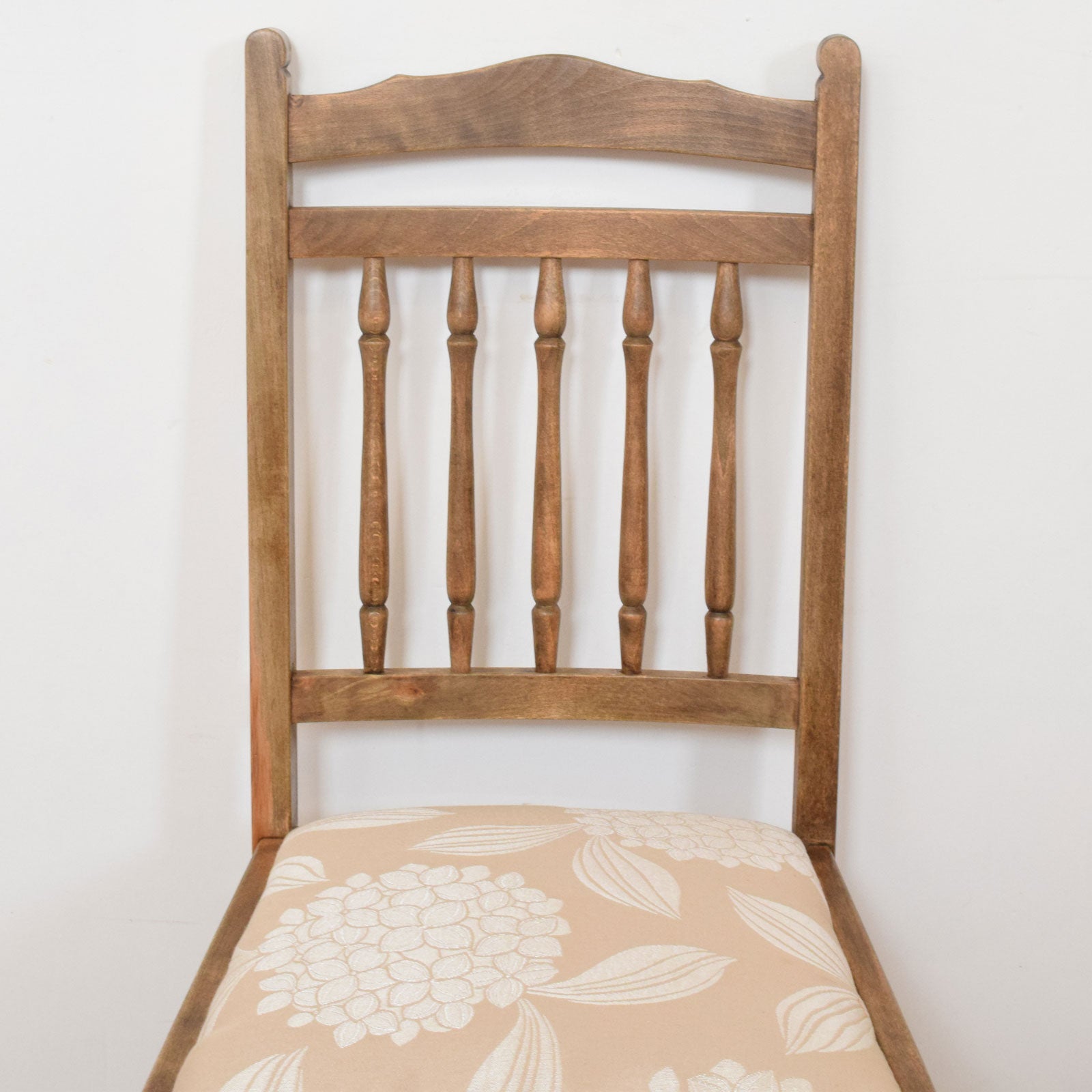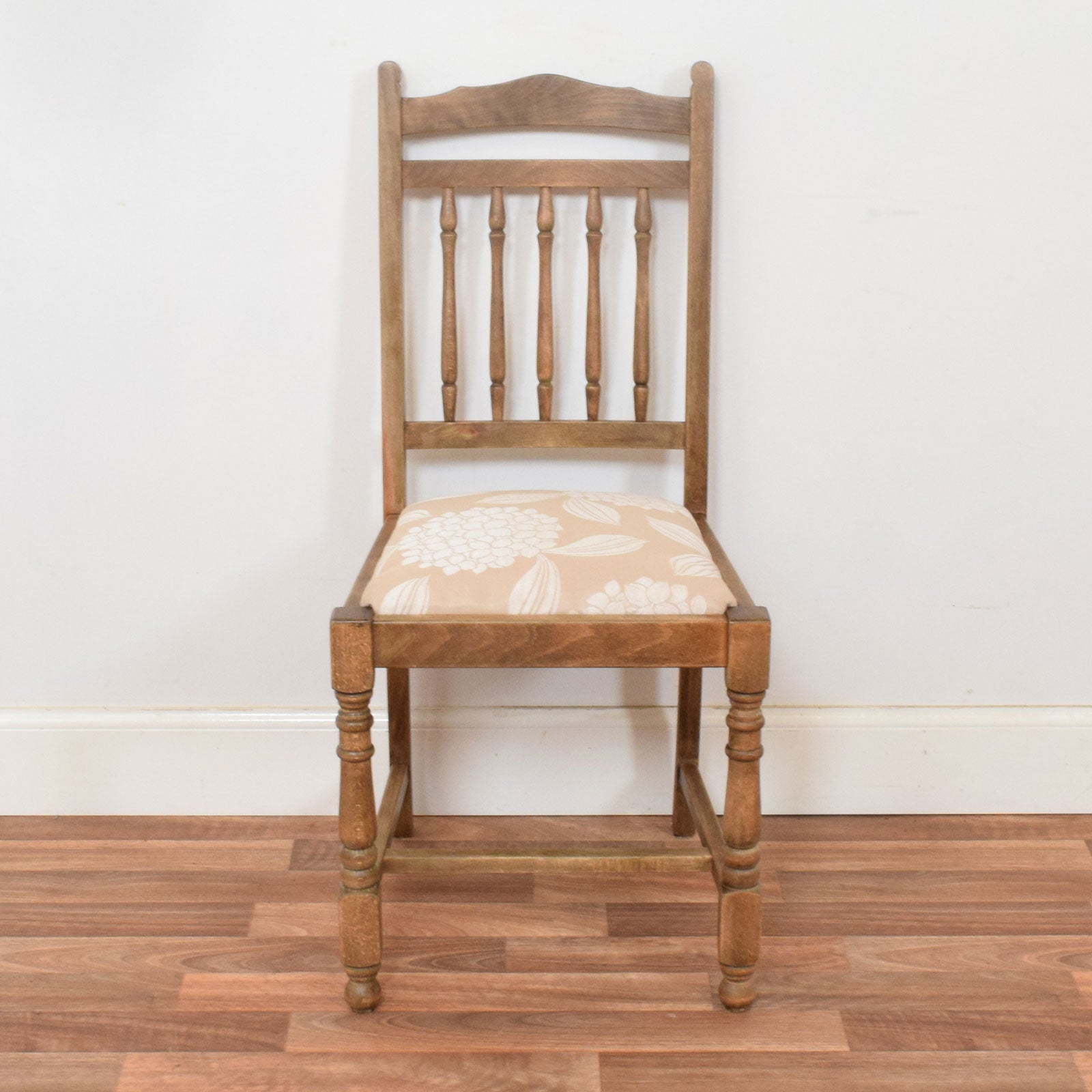The oval-top table features two drop leaves that can be raised to extend the surface when needed and lowered to save space. It stands on turned legs with cross-stretchers for strength and stability. The four matching chairs have gently curved top rails, turned spindle backrests, and square tapered legs with H-stretchers, giving them a balanced, country-inspired appearance. Each chair has a generously padded seat, newly upholstered in a warm beige fabric with a bold floral design in off-white tones, adding a soft contrast to the wood.