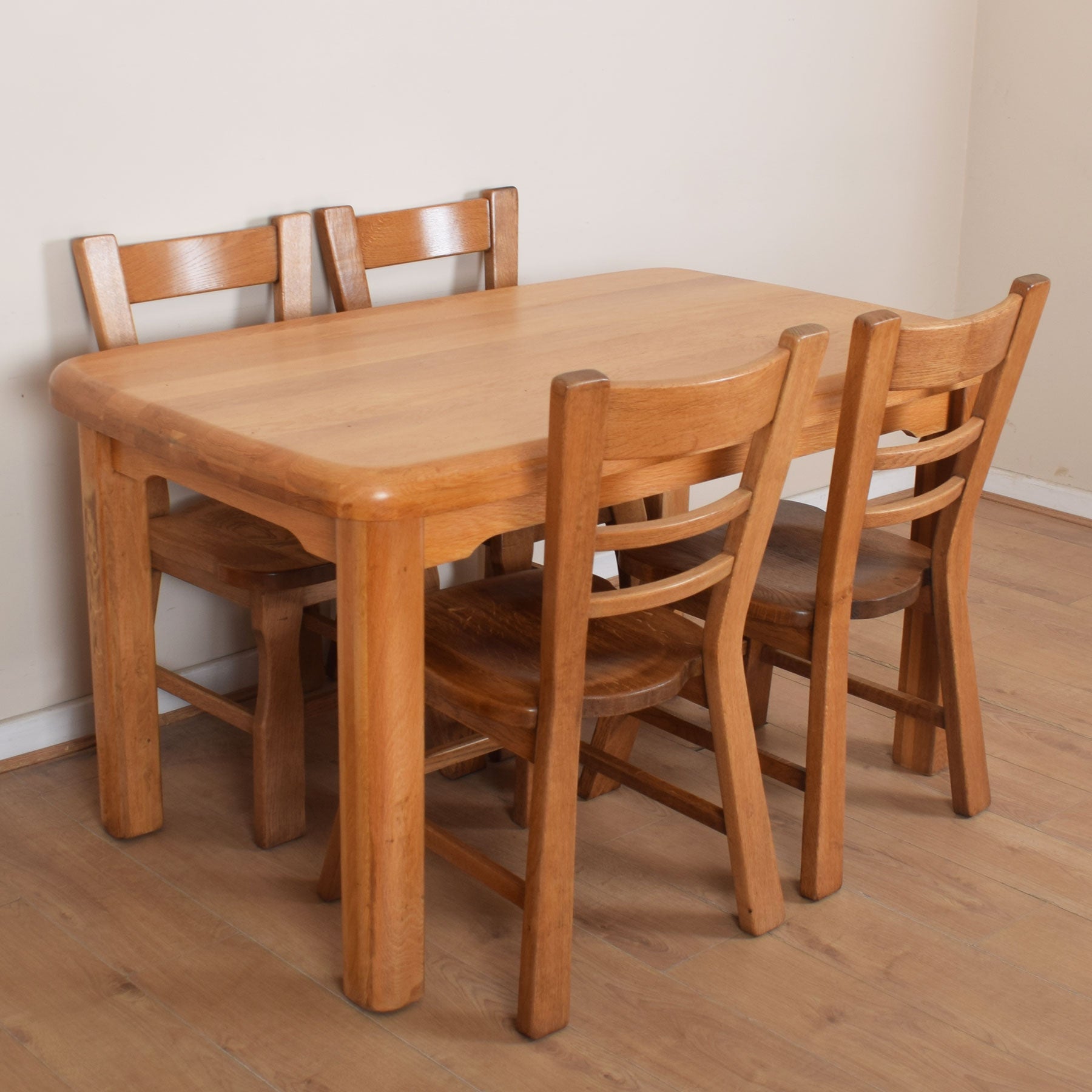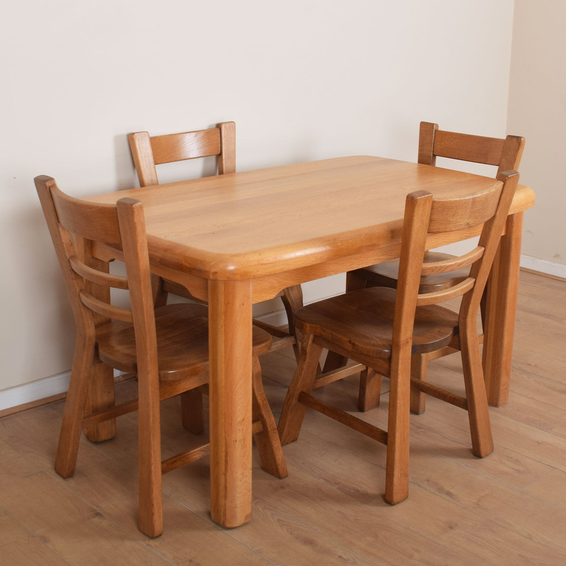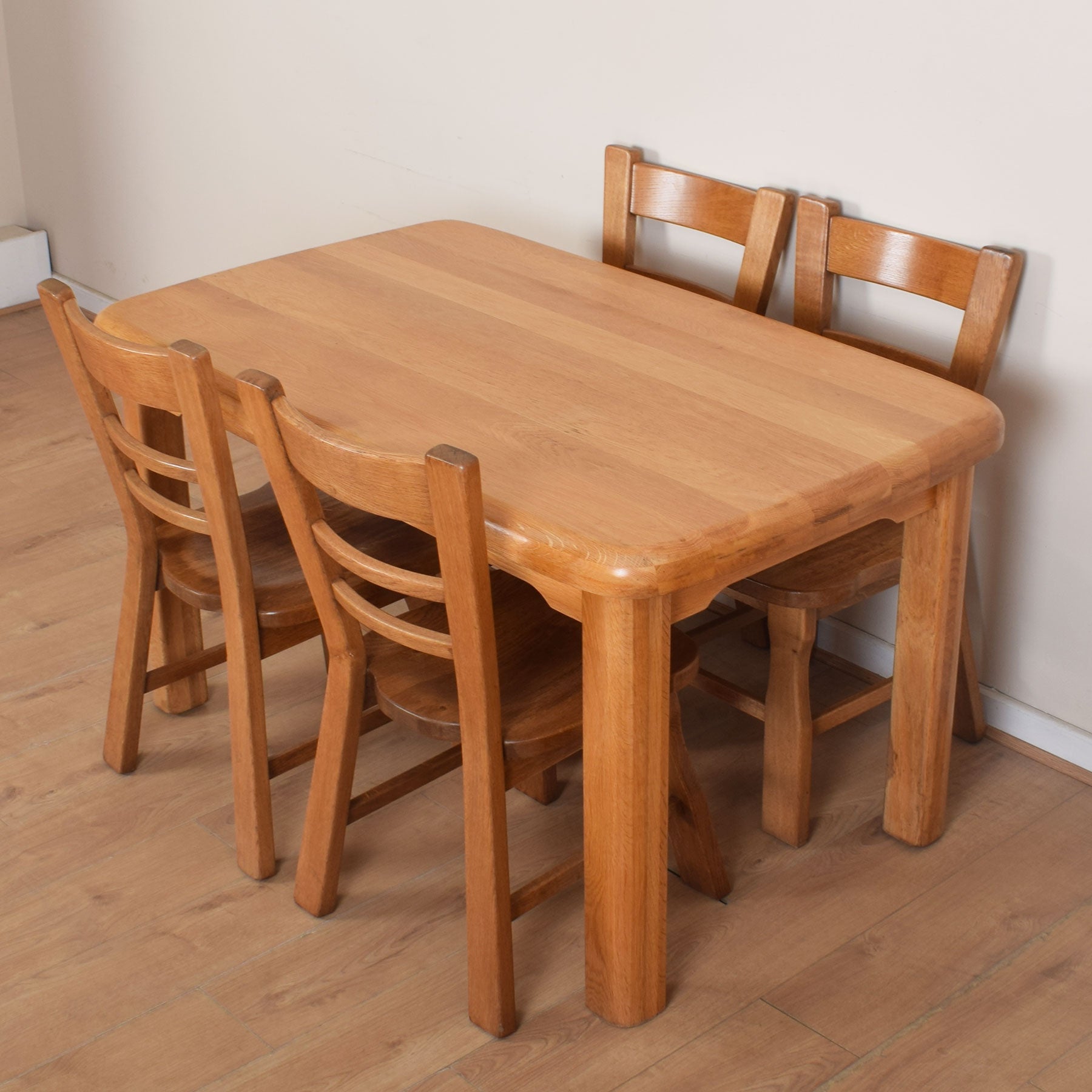 The well-proportioned dining table offers ample space for a family of four to dine in comfort, with the potential to accommodate two guests if required. The four accompanying ladder-back design chairs provide comfortable dining and complement the table beautifully. This quality-made dining table and chairs are solid Dutch oak throughout.