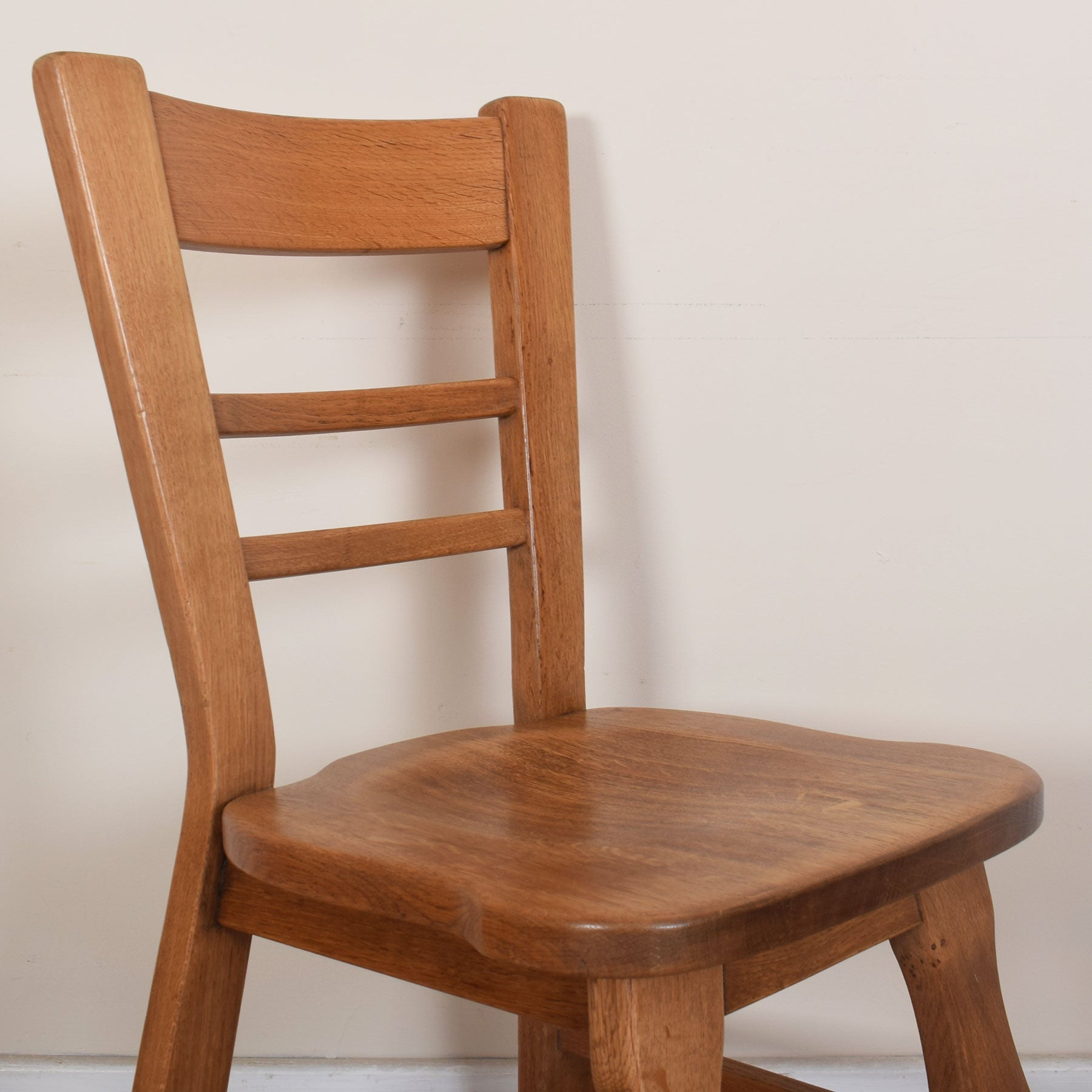 Our restoration workshop has stripped the original varnish from this dining suite, before finishing with a professional matt lacquer that enhances the colour and character of the natural oak. It should be noted from the photographs that one of the table legs has some discoloured marks, but this does not detract from the overall appearance of the dining suite.