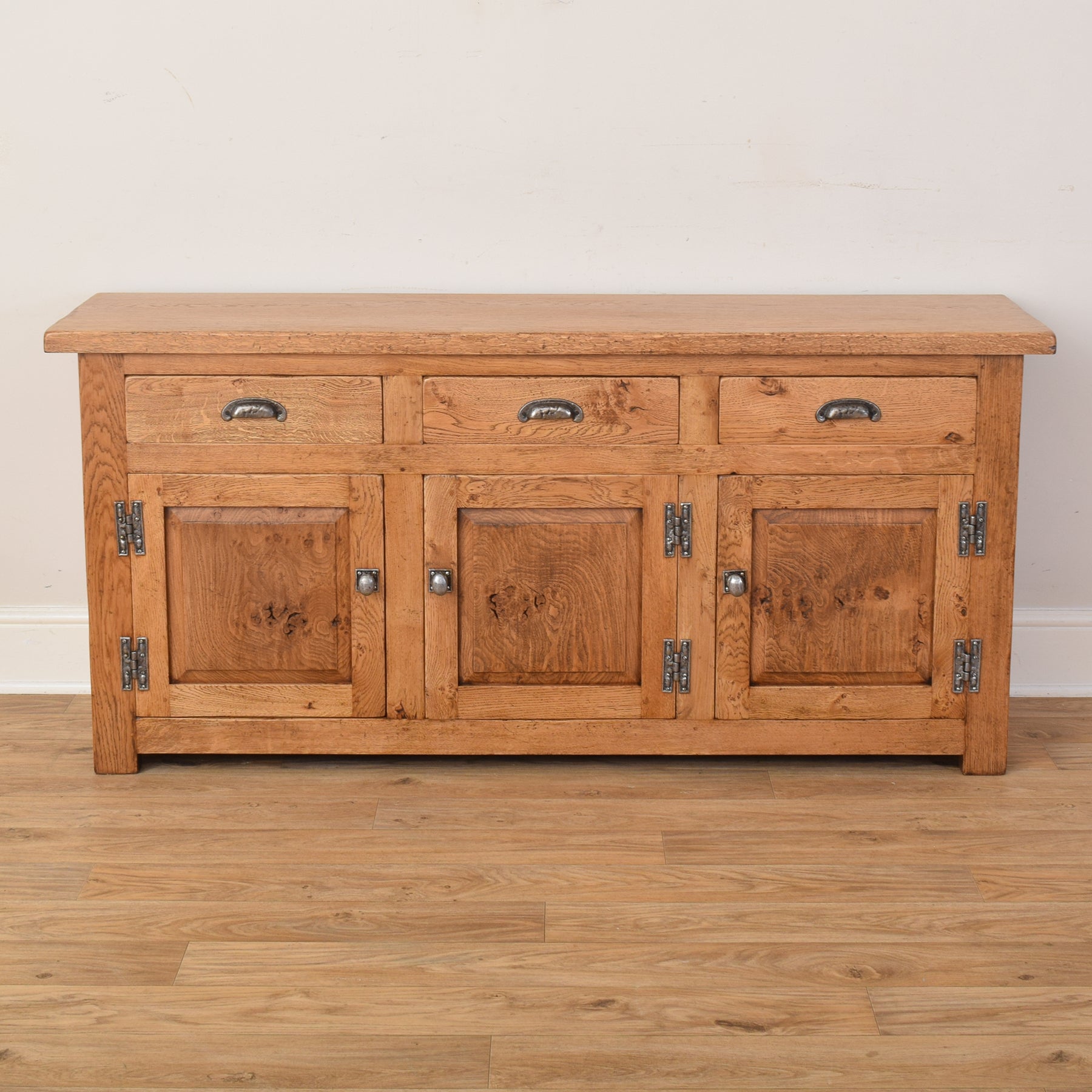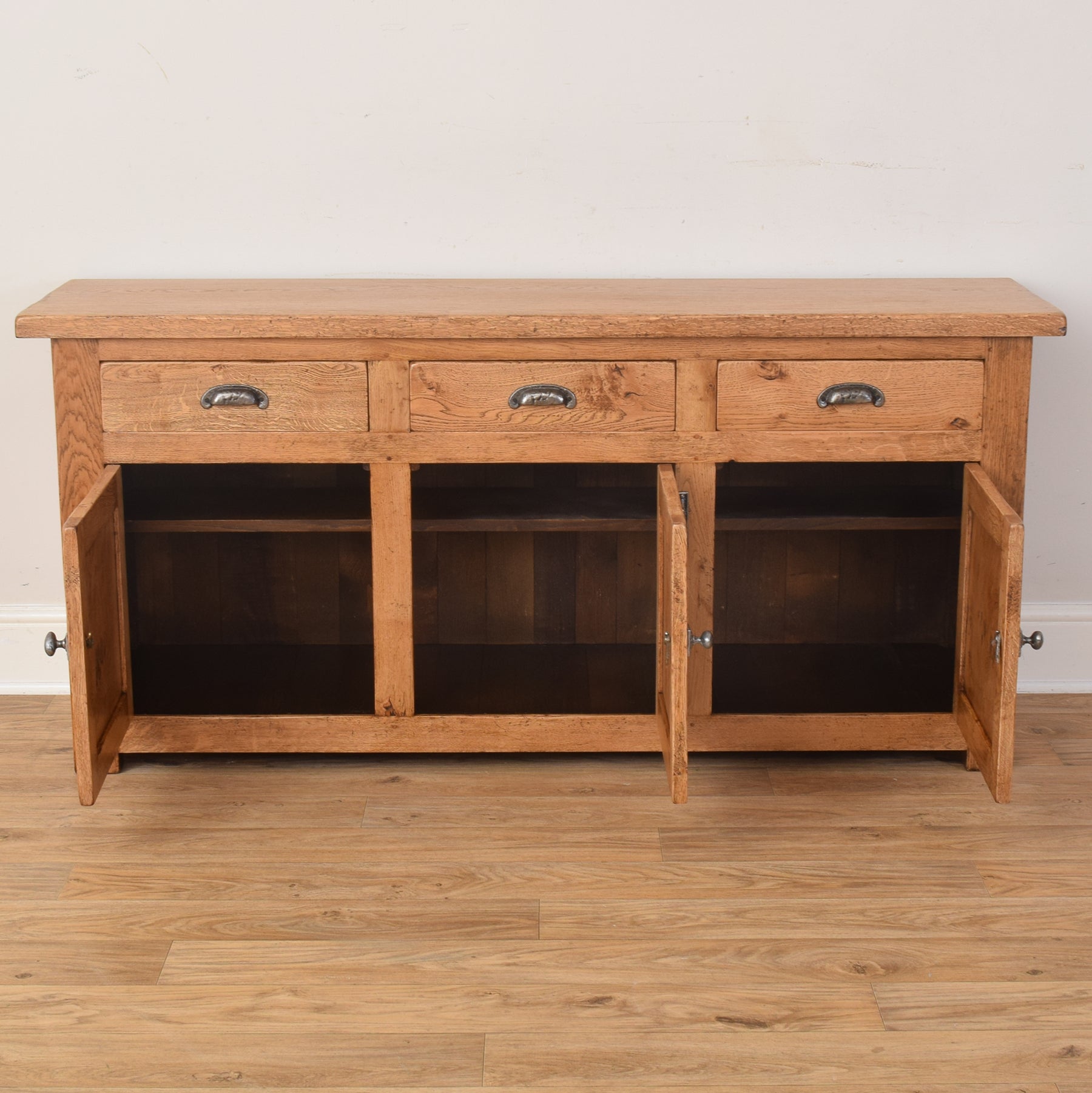 The sideboard features three drawers over three cupboard doors, all fitted with sturdy metal cup handles and hinges that lend an industrial touch to its otherwise classic design. The simple lines and square framing give the piece a timeless look, while the natural grain and texture of the oak provide a sense of authenticity and craftsmanship.
