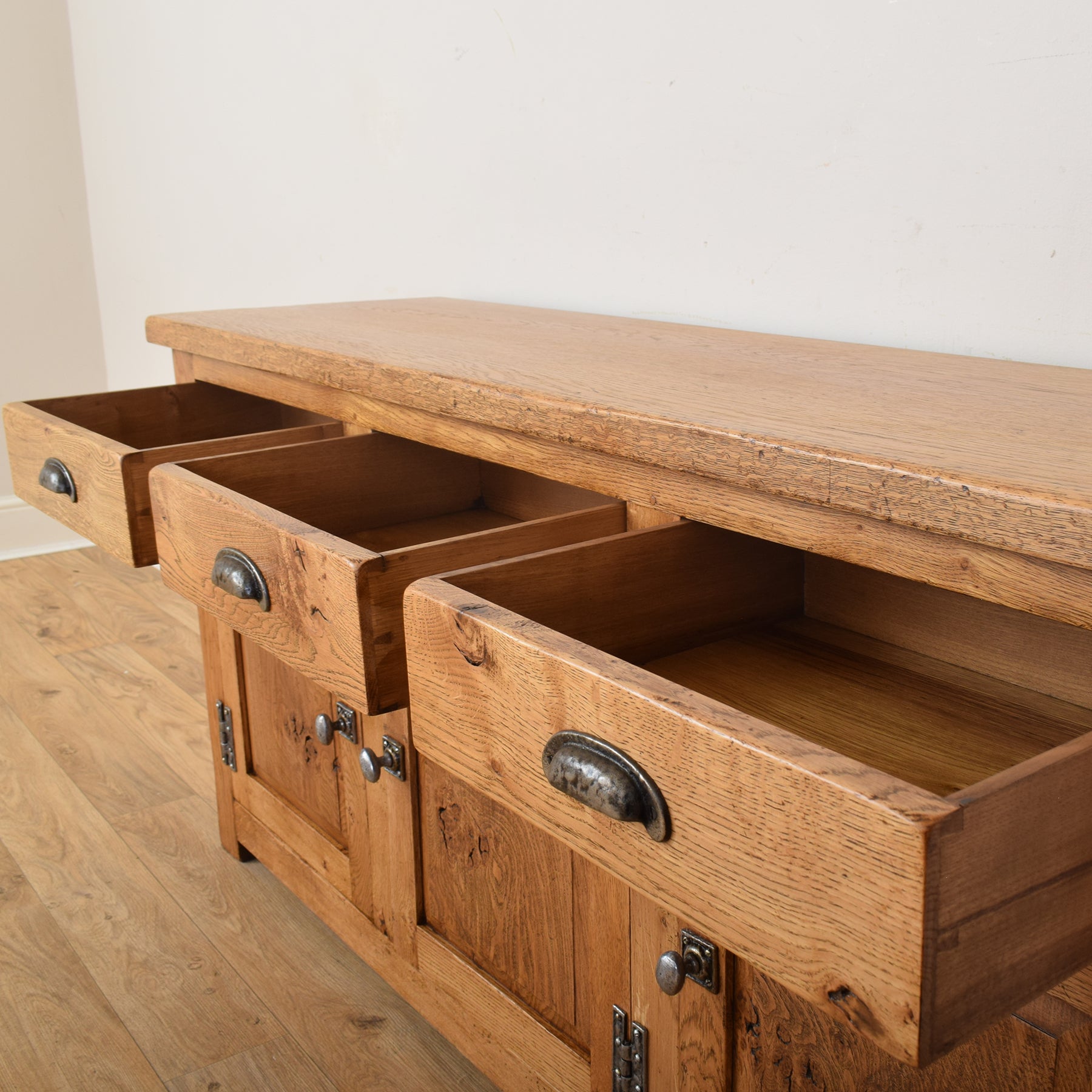Combining strength, beauty, and practicality, this Dutch oak sideboard is a fine example of traditional craftsmanship and natural design that will add warmth and personality to any home.