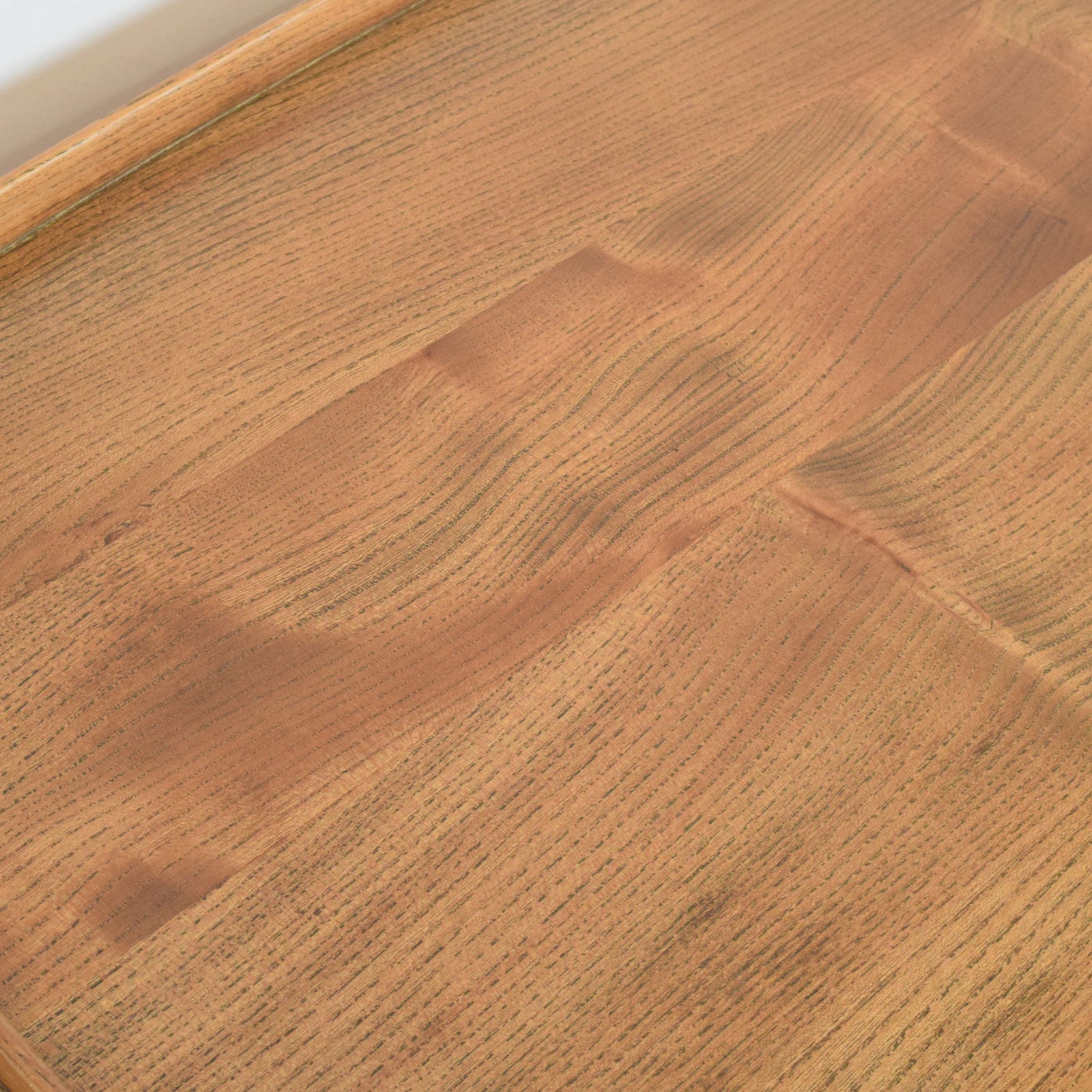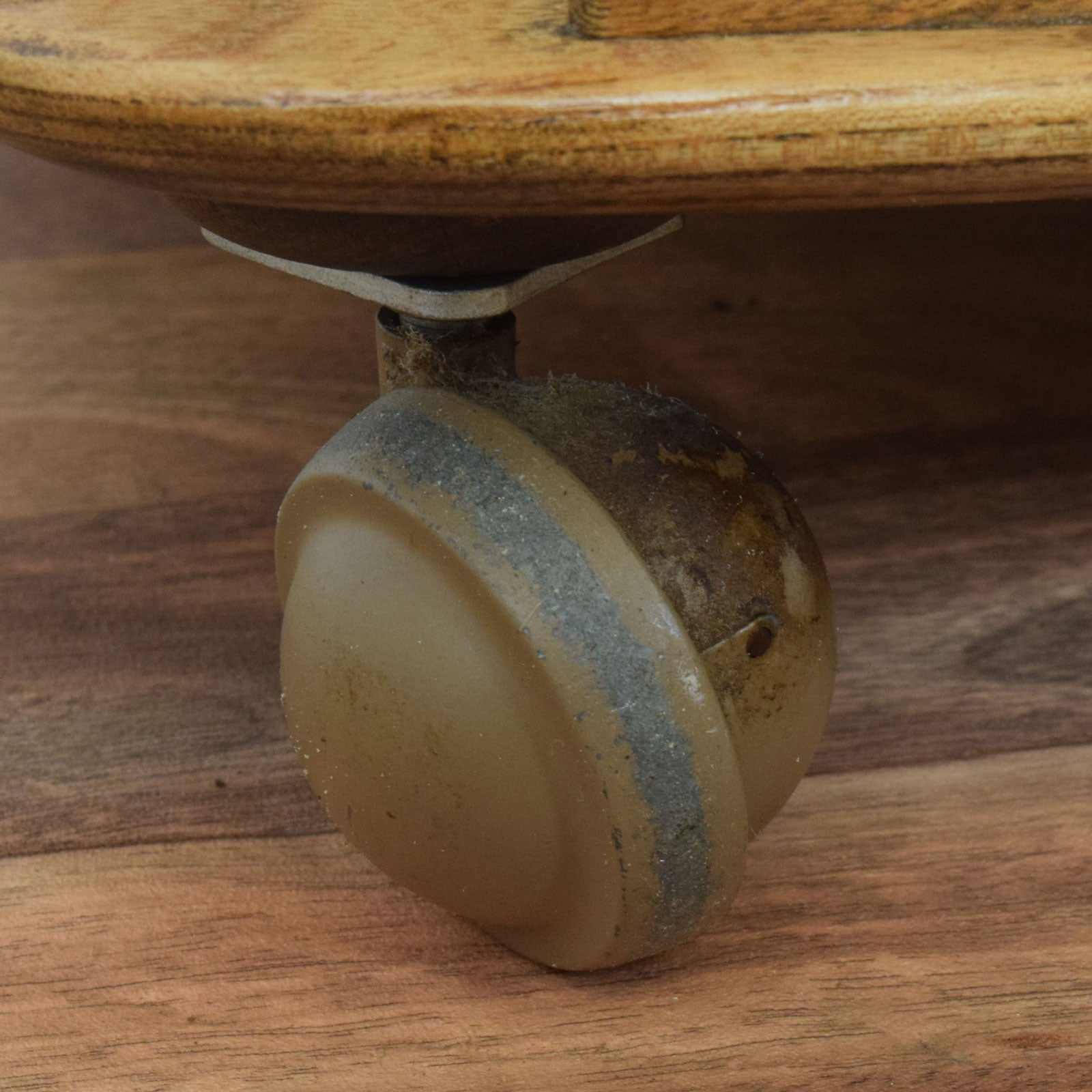 The item has been fully stripped and finished with several coats of hard-wearing matte lacquer. This treatment enhances the natural warmth and grain of the elm, while providing a durable surface suitable for regular use. Signs of age remain throughout, including wear to the edges of the trays, blackened grain in places, and ageing to the castors, which show some surface corrosion and discolouration but remain fully functional.