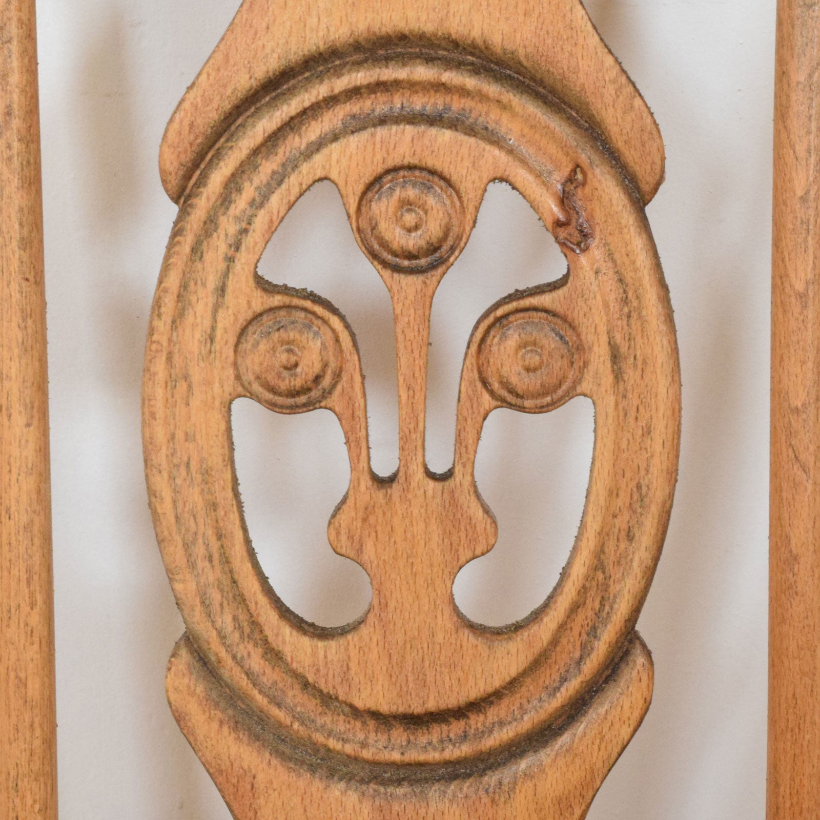 The frame has been professionally stripped and finished with multiple coats of hard-wearing matte lacquer, providing a durable surface while bringing out the richness and movement of the elm grain. There are some signs of age-related wear, including a small filled area on the carved splat, visible in the photographs. This item is made entirely from elm.
