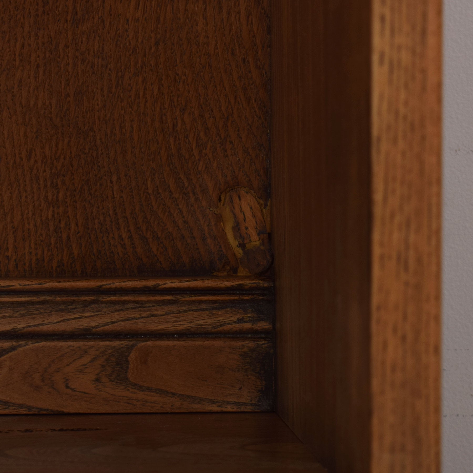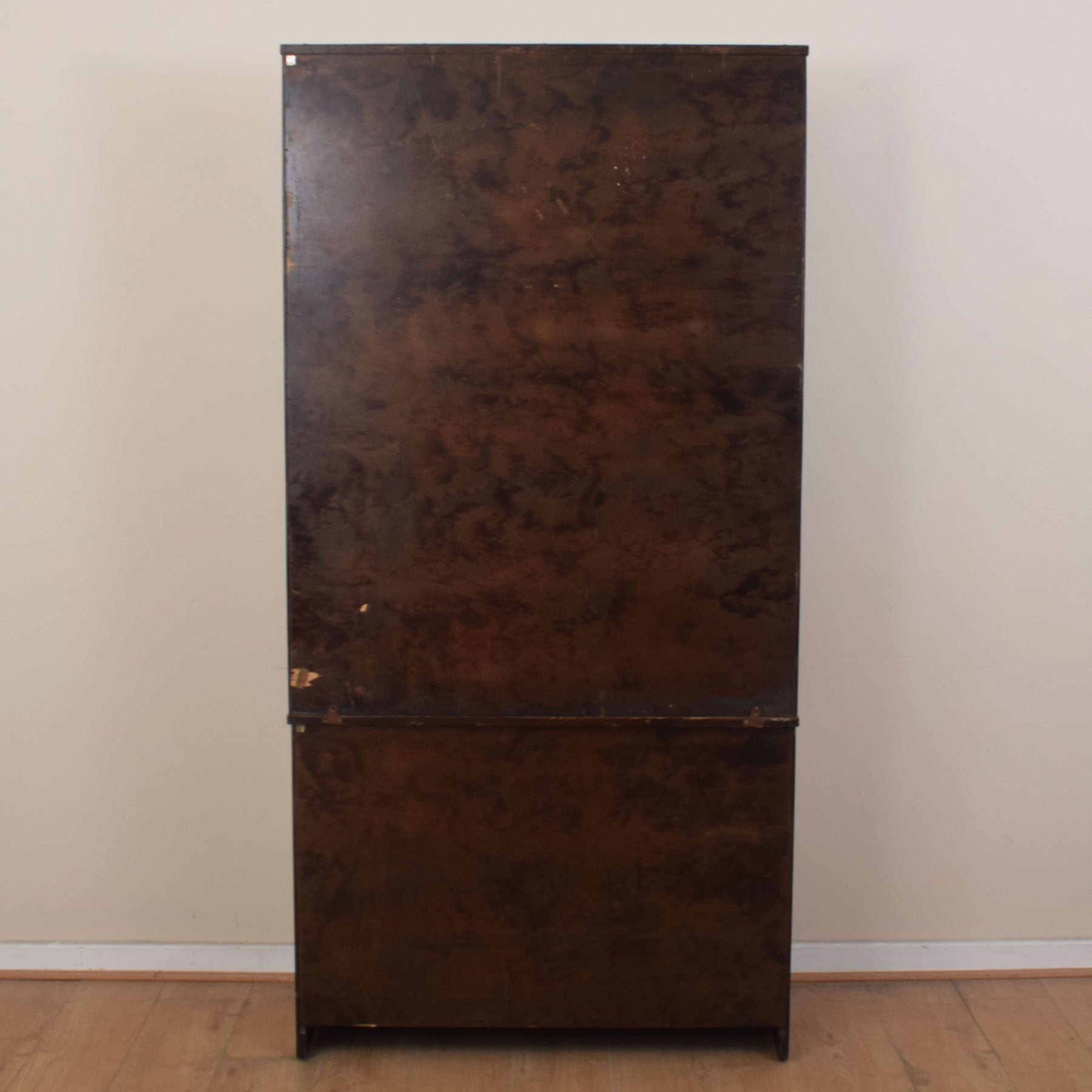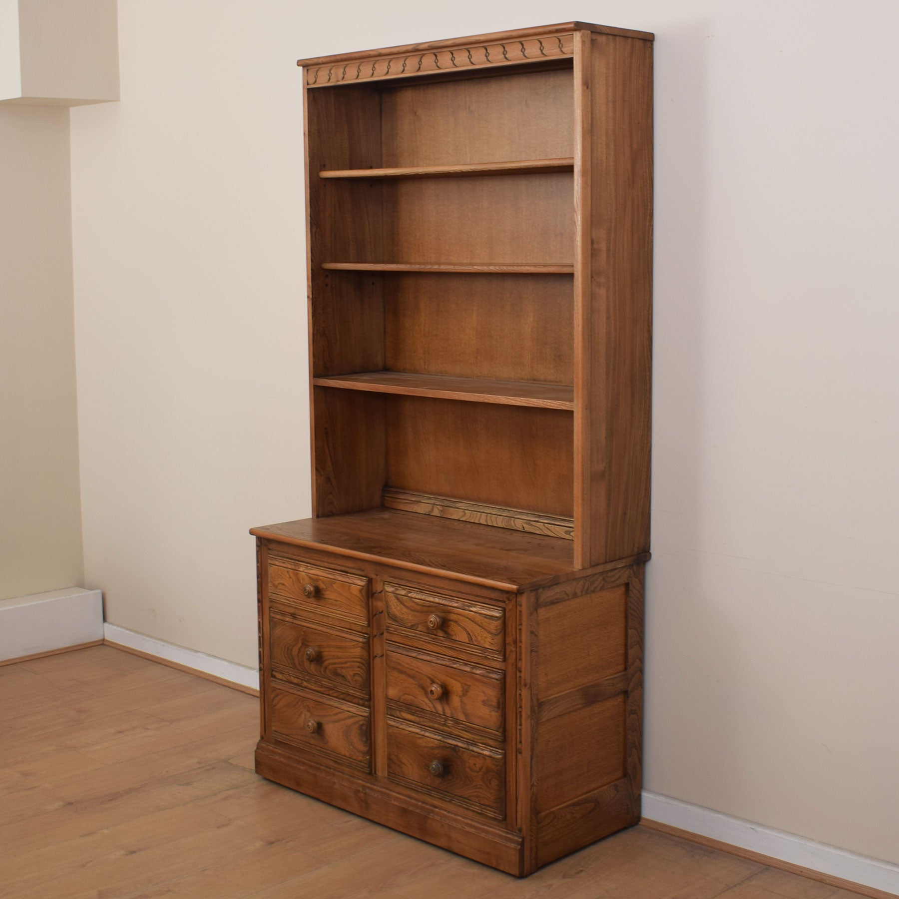 The upper bookcase or display unit features three height-adjustable bookshelves, each with a carved groove to support decorative plates or plaques. This sits on the beautifully elm-grained top of the lower drawer unit, which has space for treasured ornaments, additional books and collectables. Below are six usefully deep half-width drawers, offering valuable storage for a variety of household nik-naks. This quality made Ercol piece is largely soiid elm with some elm-veneered panels and plywood unseen drawer and back sections.