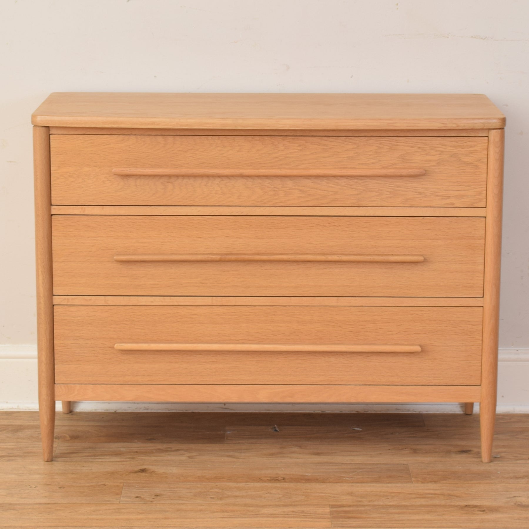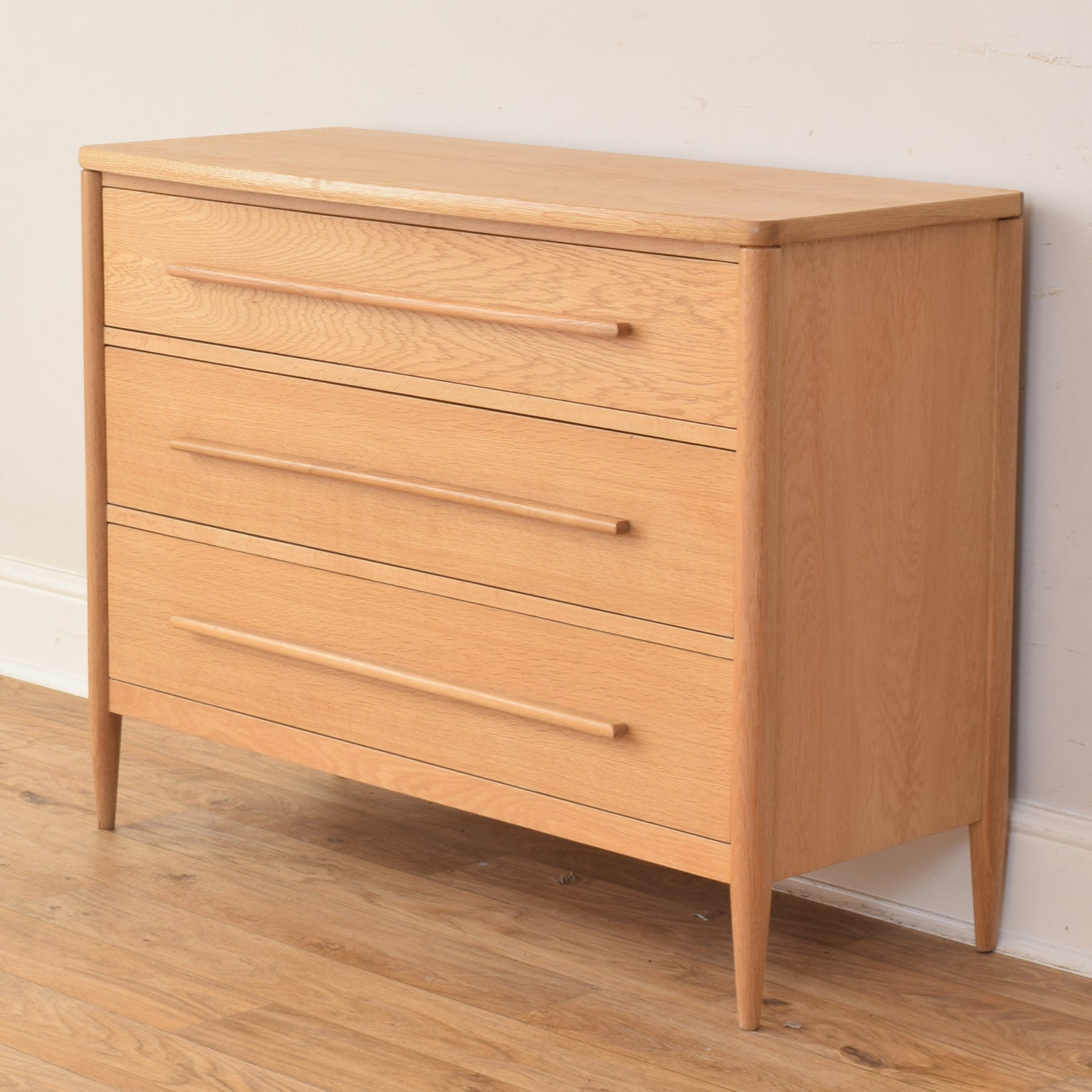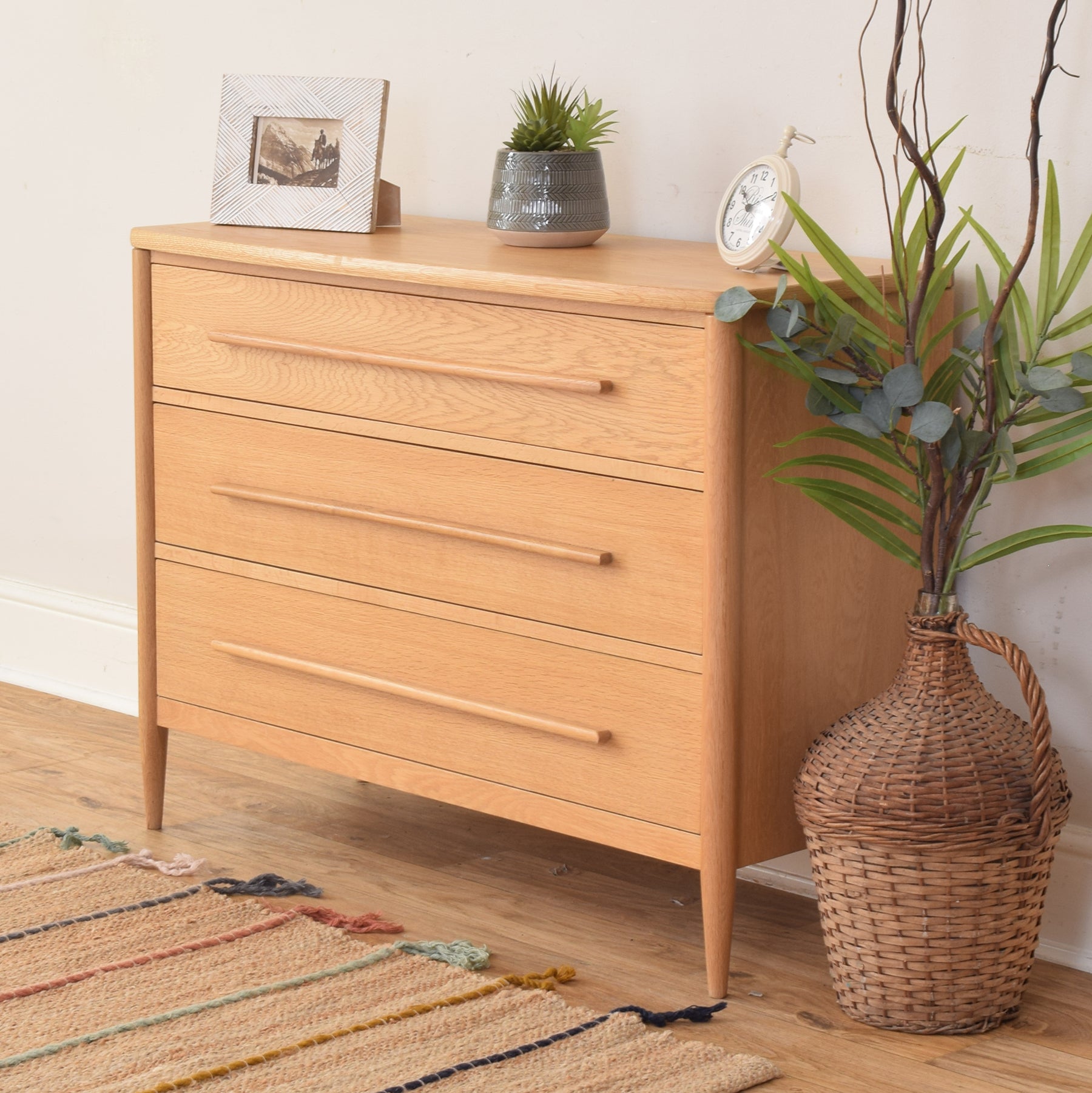 This is an Ercol chest of drawers featuring three spacious drawers, each fitted with integrated solid wood handles that echo its mid-century modern roots. Its slightly rounded edges and tapered legs enhance the overall softness of the design, while the clear, natural finish highlights the grain beautifully. The drawers are generously sized, making it practical for storing clothes, linens, or accessories.