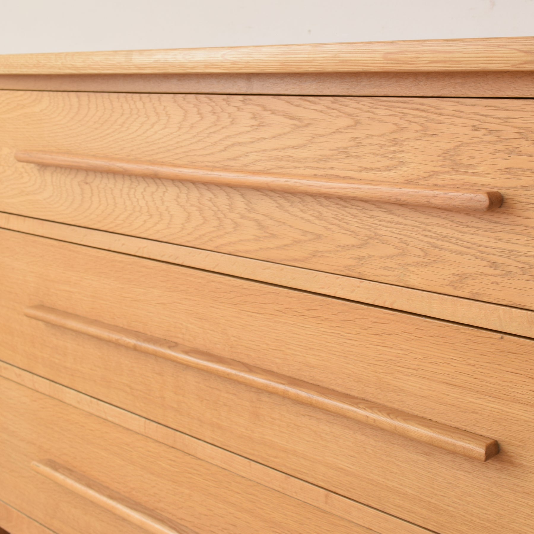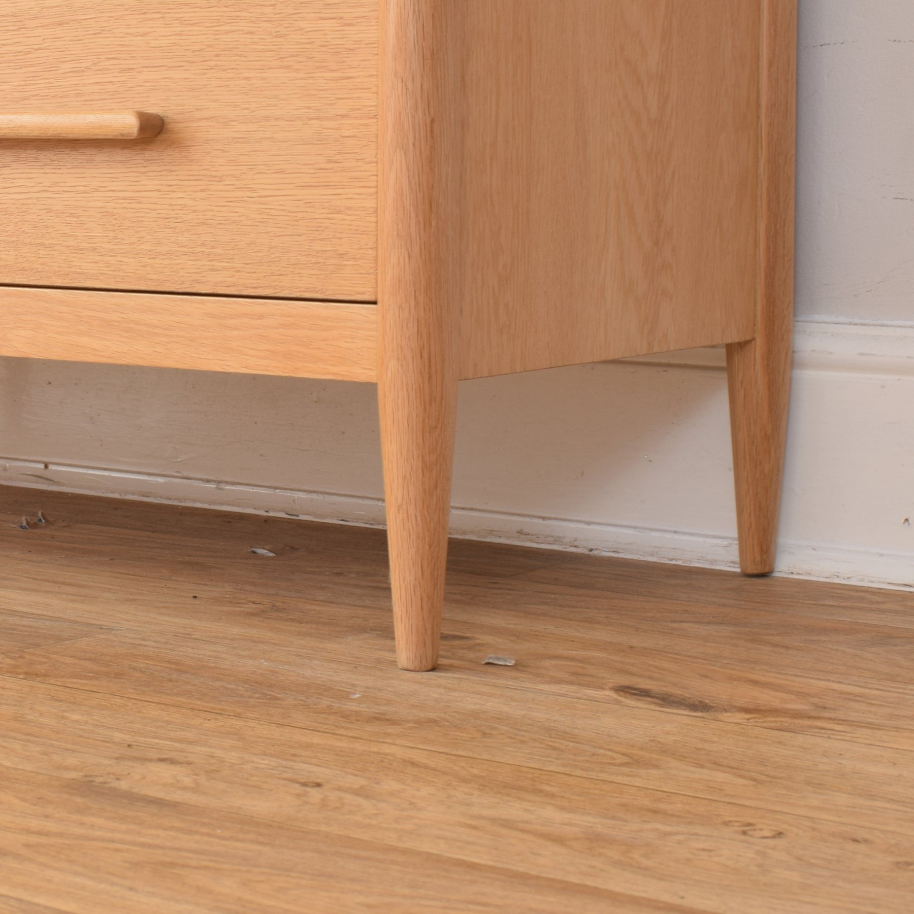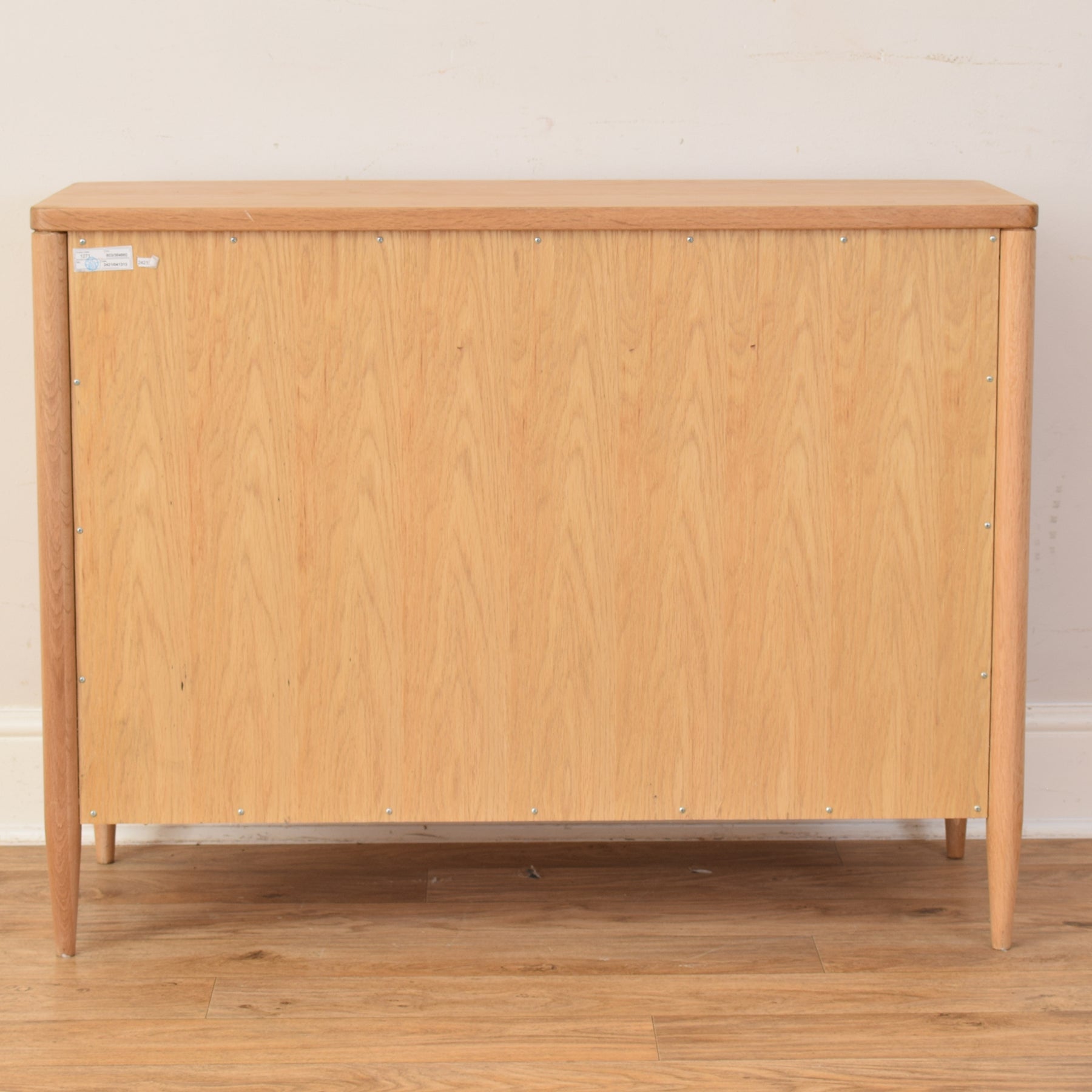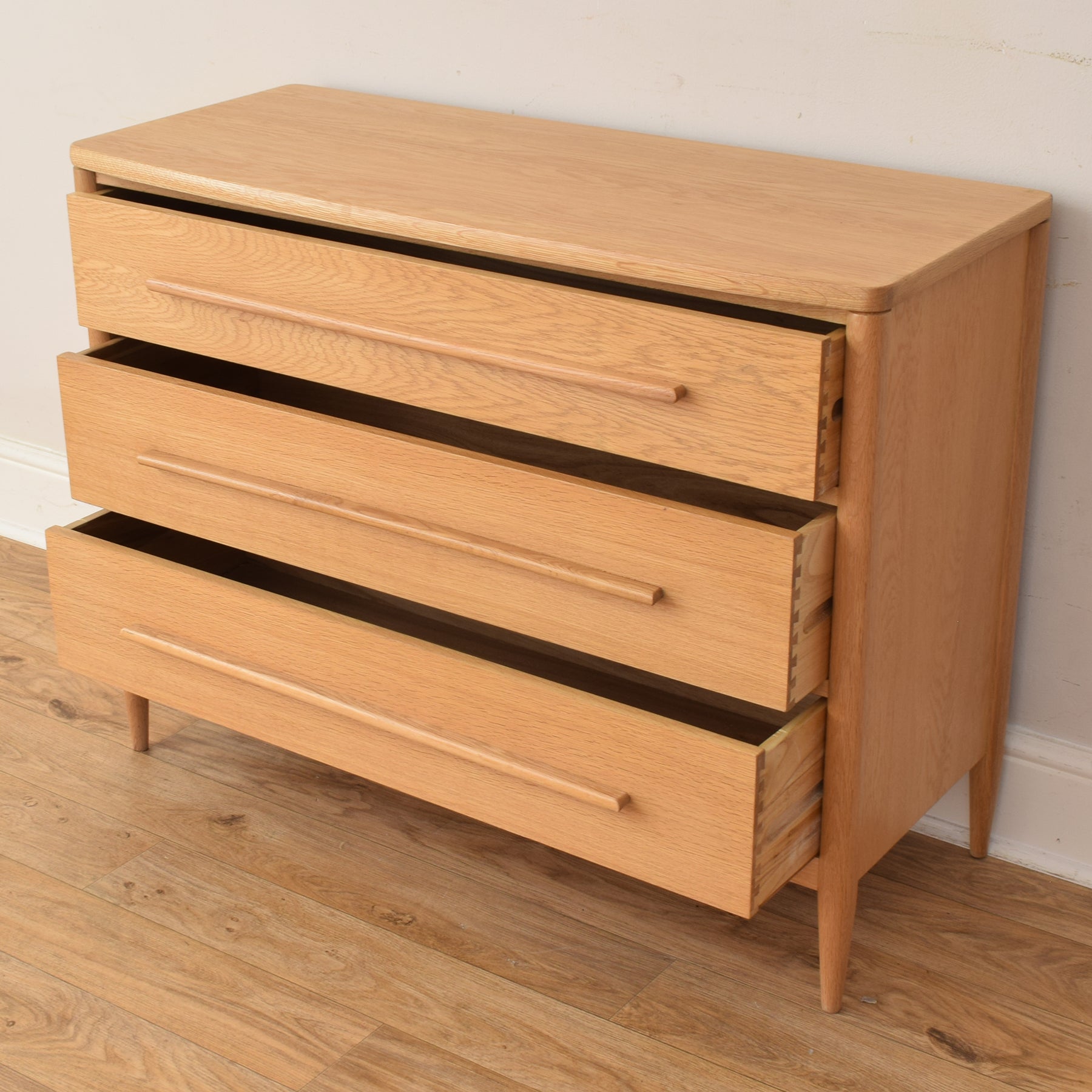 This is an Ercol chest of drawers featuring three spacious drawers, each fitted with integrated solid wood handles that echo its mid-century modern roots. Its slightly rounded edges and tapered legs enhance the overall softness of the design, while the clear, natural finish highlights the grain beautifully. The drawers are generously sized, making it practical for storing clothes, linens, or accessories.