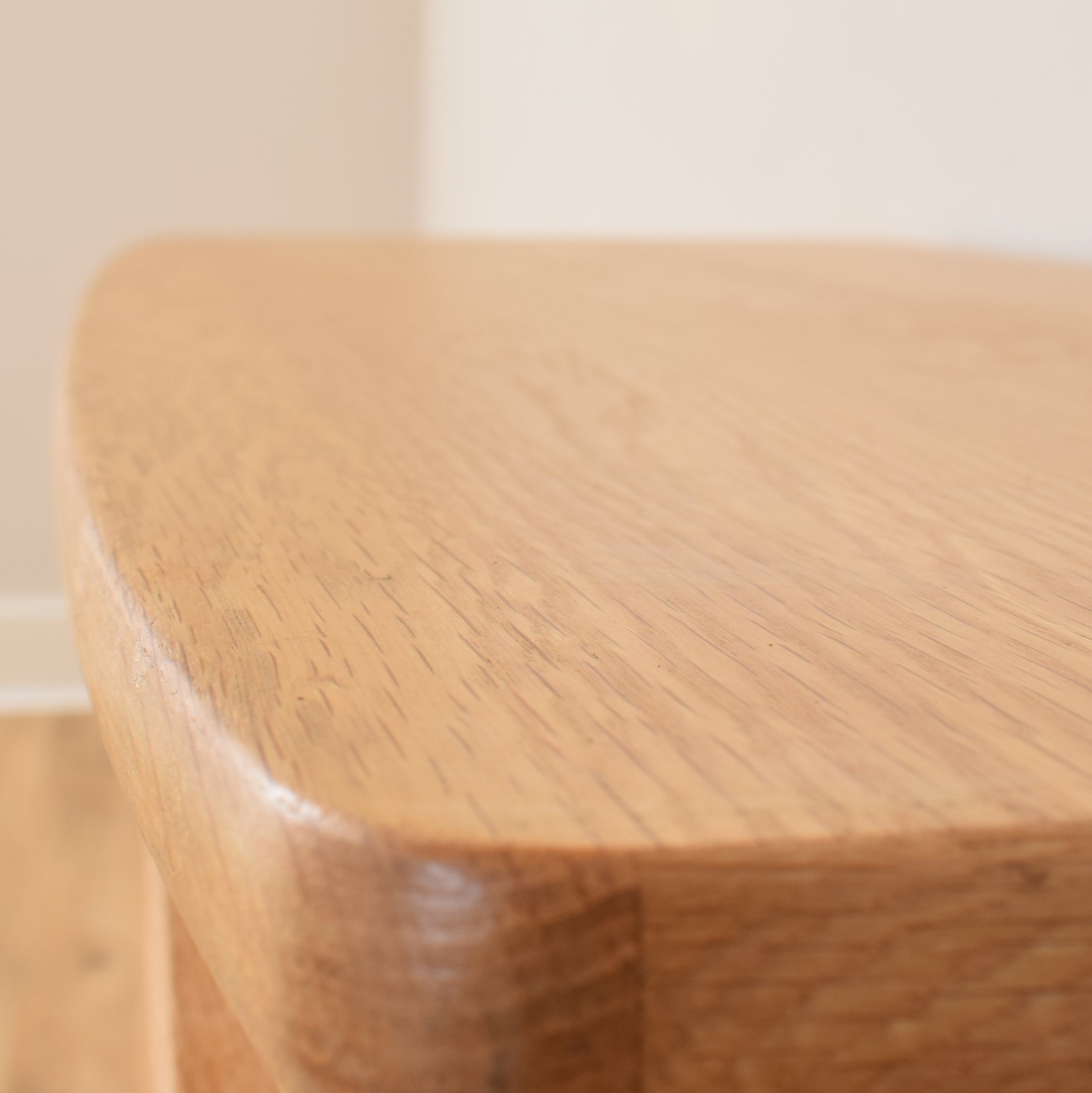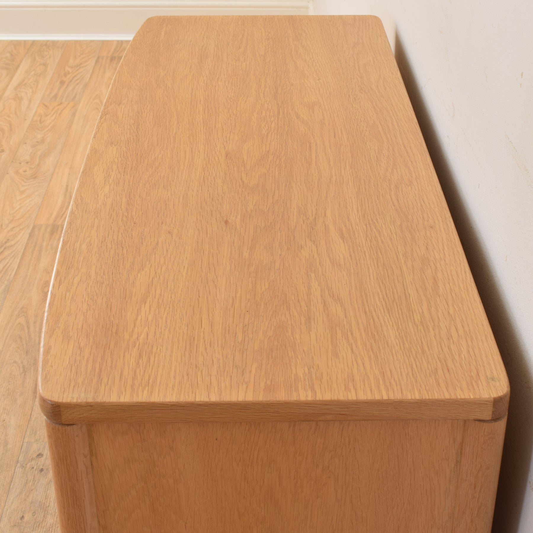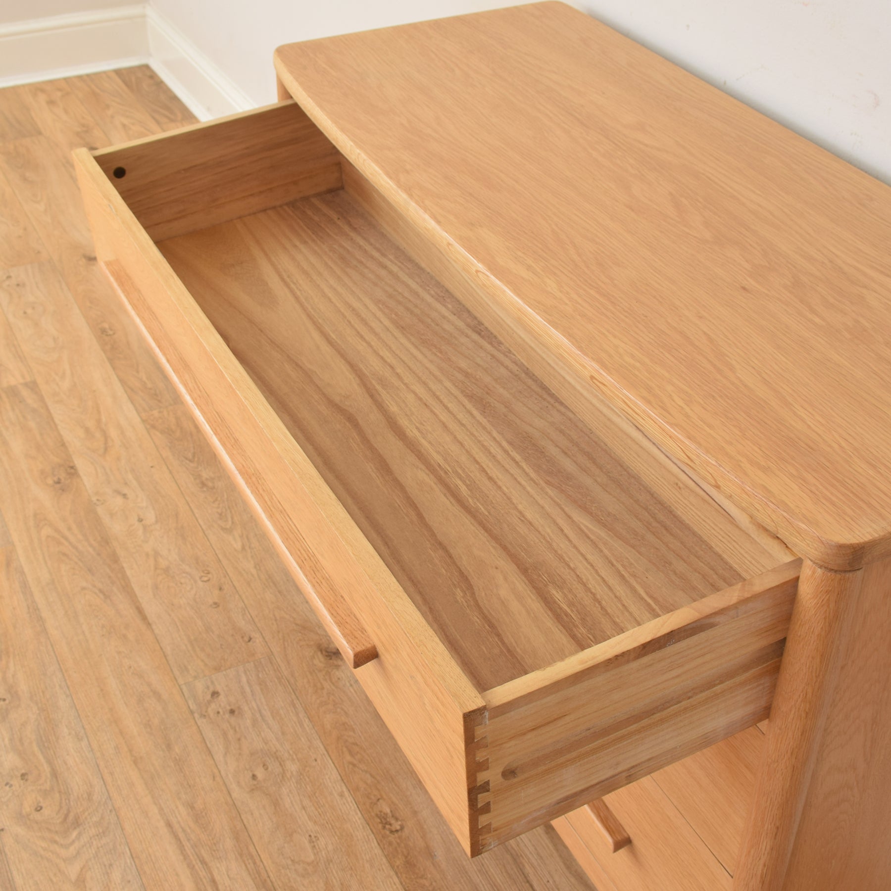 The previous darker stain has been stripped, and then multiple coats of hard-wearing matte lacquer have been applied, providing a durable long-lasting finish, while also accentuating the natural oak grain. This item is made from a mixture of solid oak and oak veneer, while the drawer bases and rear panel are plywood.