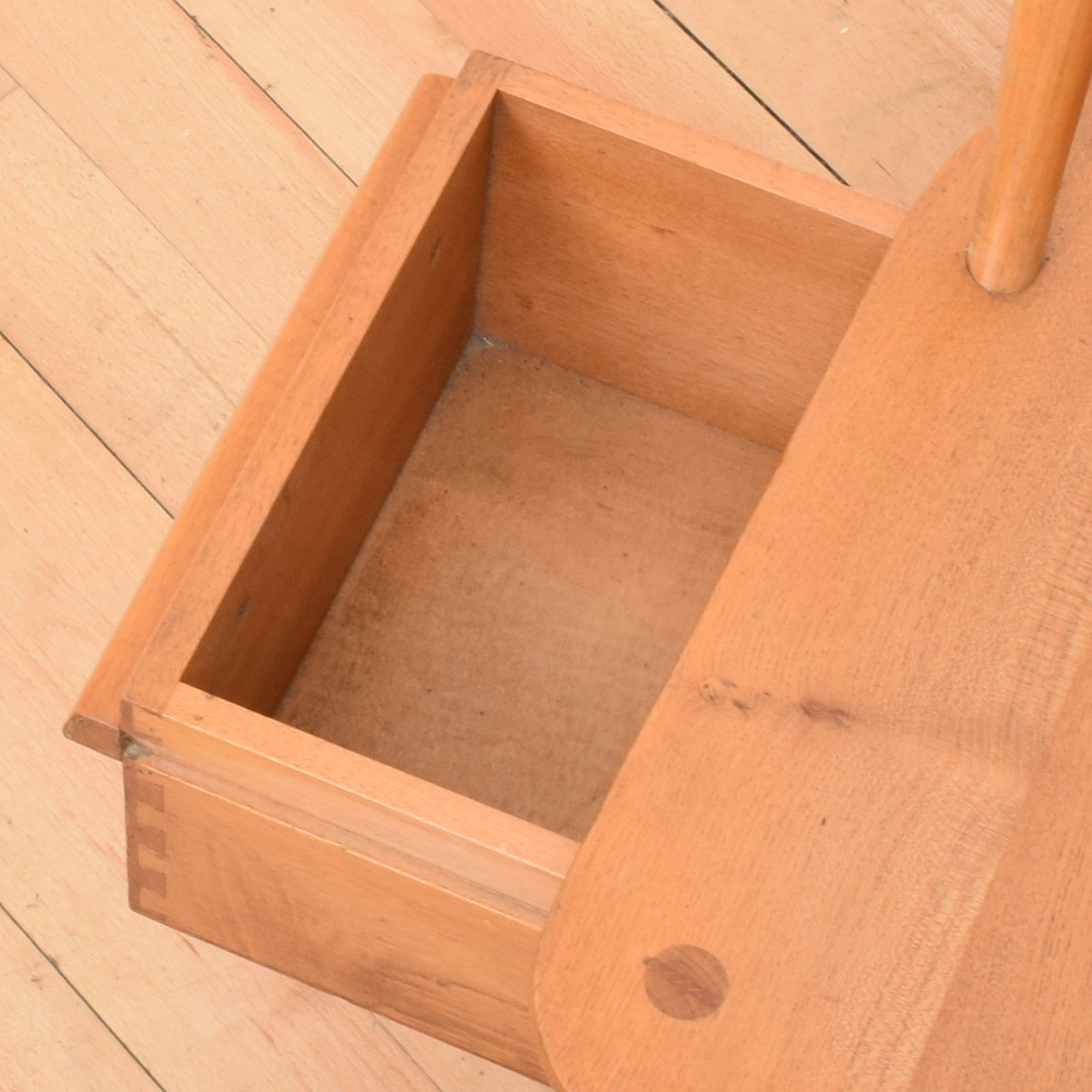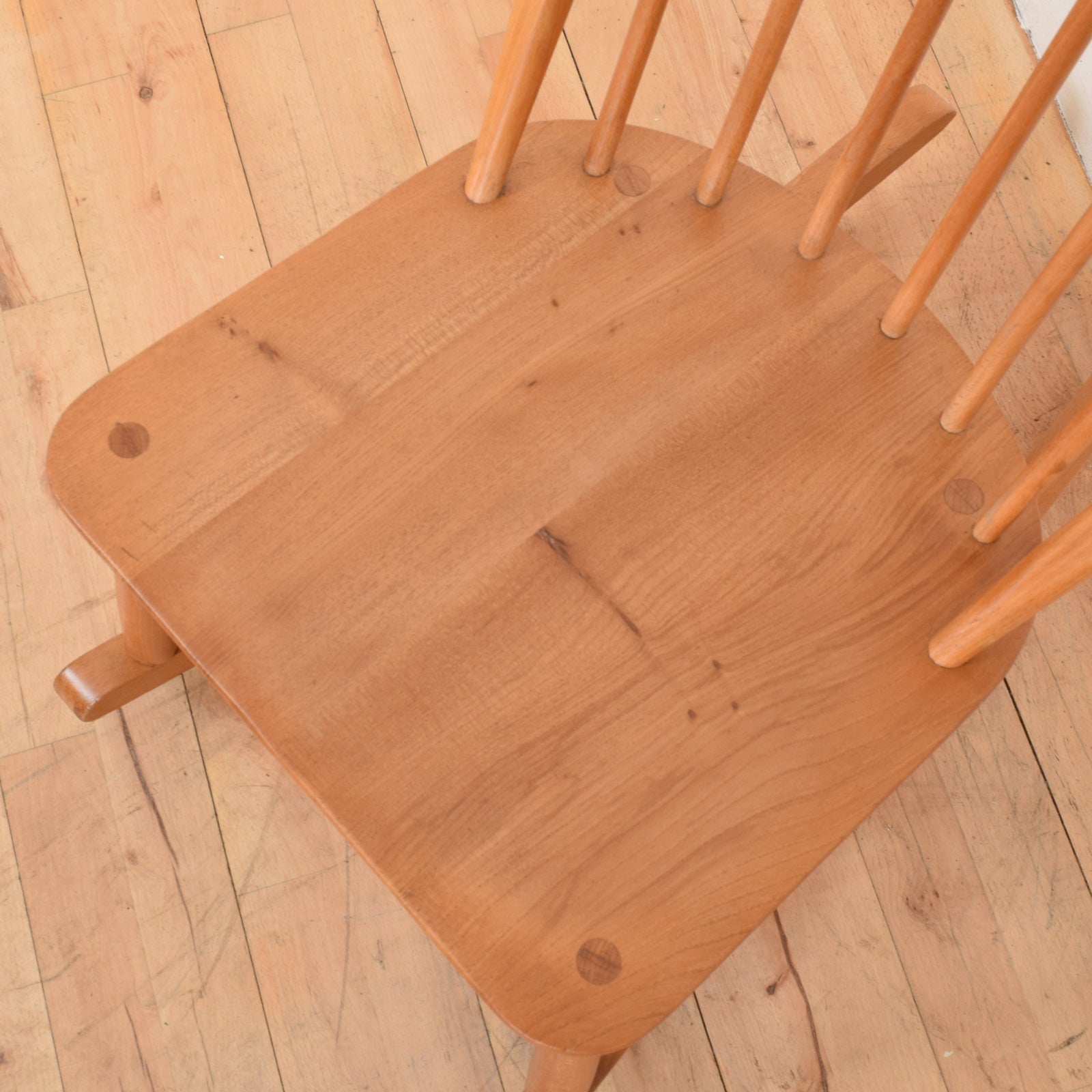 The spindle back is iconic in style and, visually, very attractive. It has a solid seat pad that displays a very attractive wood grain and can be used without cushions if preferred. Below the seat base is a drawer that pulls out of the side that would be ideal for a book or toys. This rocking chair is made entirely from elm.