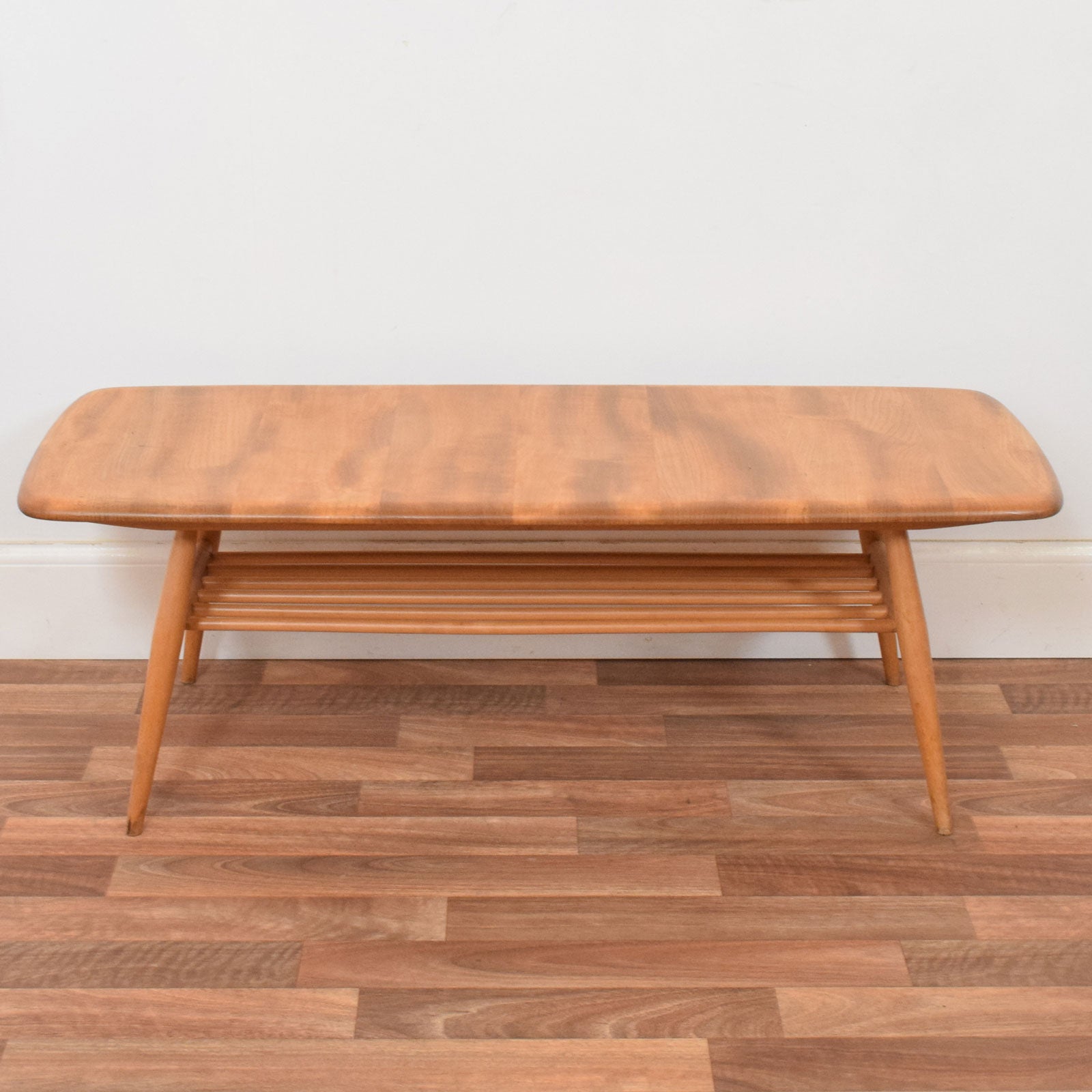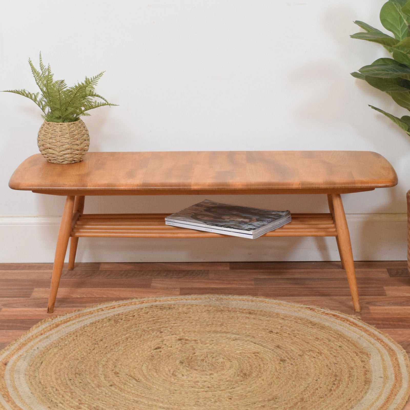 This classic Ercol coffee table features a beautifully shaped solid elm top with rounded corners and smooth, flowing edges. Below, a slatted magazine rack adds function without compromising the minimalist form. Tapered beech legs, angled for stability and style, give the piece its signature Ercol lightness and sculptural quality.
