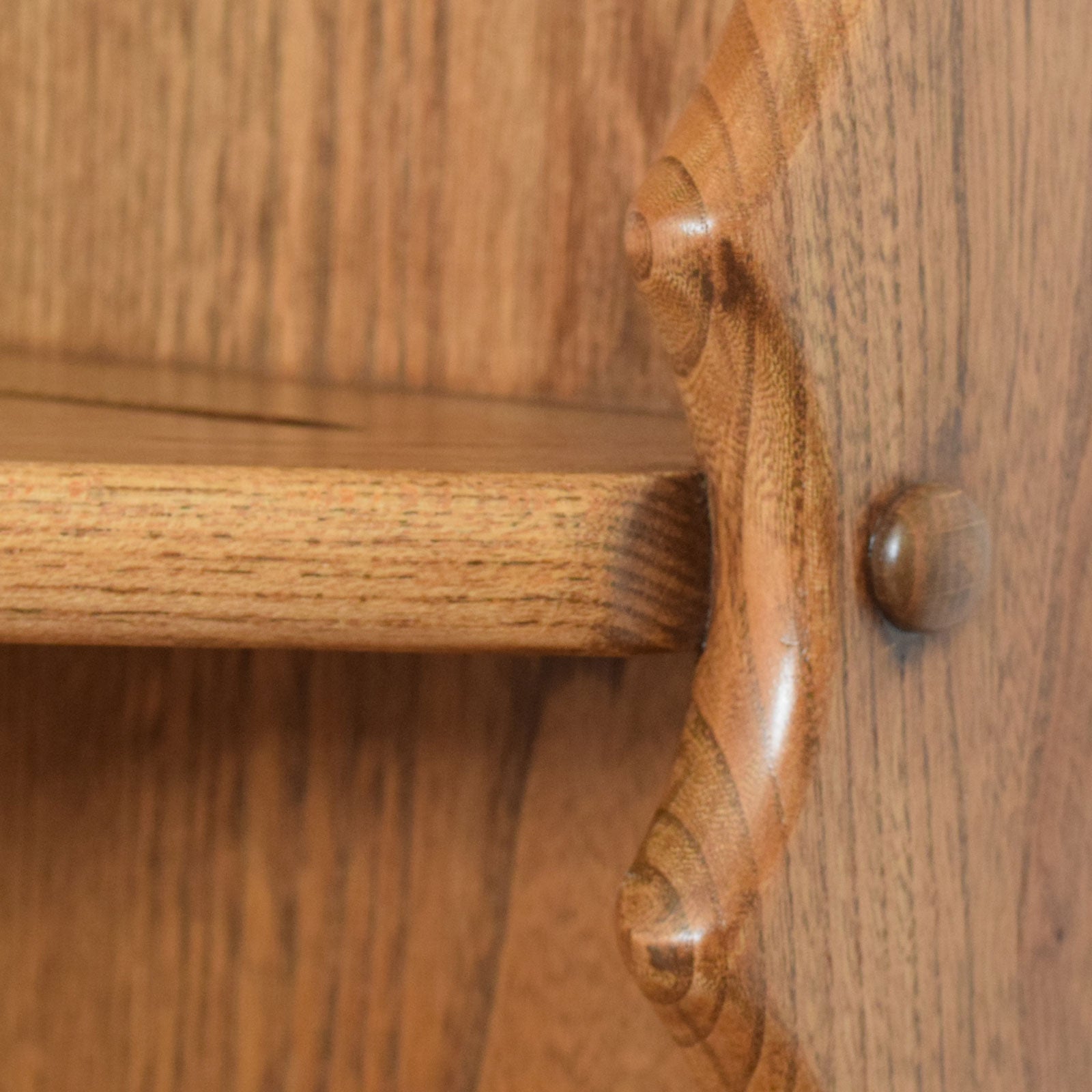 This vintage piece by Ercol features three open corner shelves above a lower cupboard with a panelled door. The solid elm shelves and sides showcase Ercol’s trademark craftsmanship, with beautifully grained timber and subtle detailing, including sculpted supports and rounded corners. The cupboard below offers useful concealed storage, while the open shelves above are ideal for displaying books, glassware, or decorative items. The original Ercol badge is still present inside the cabinet.