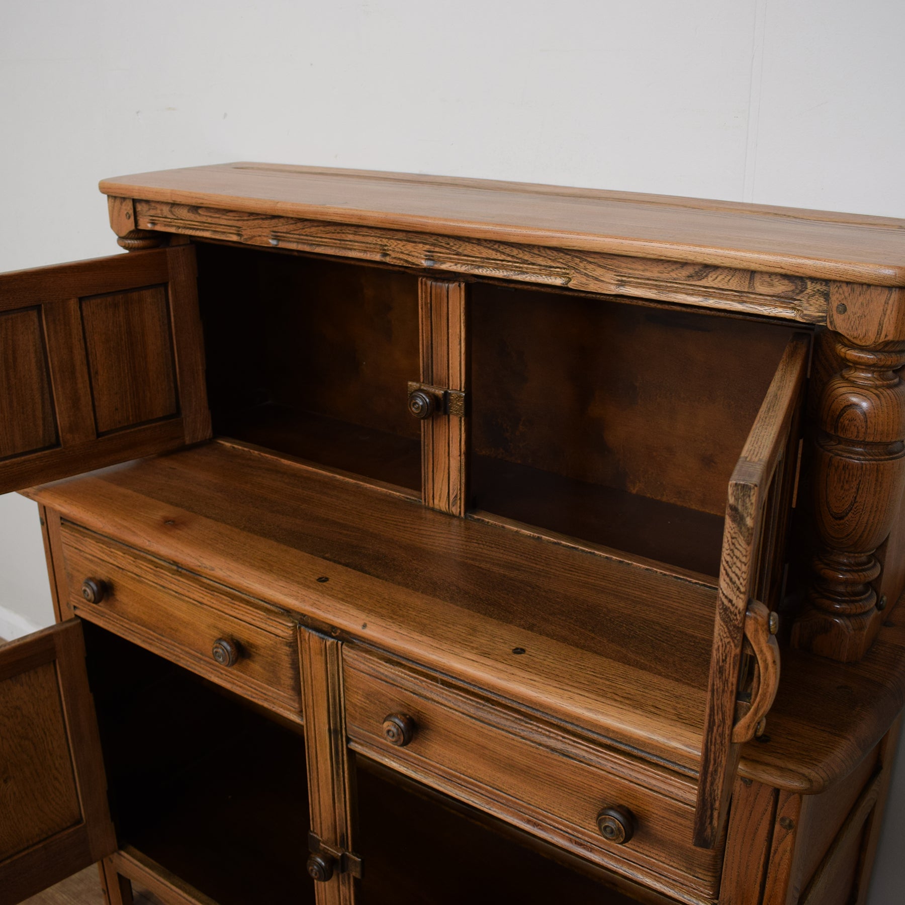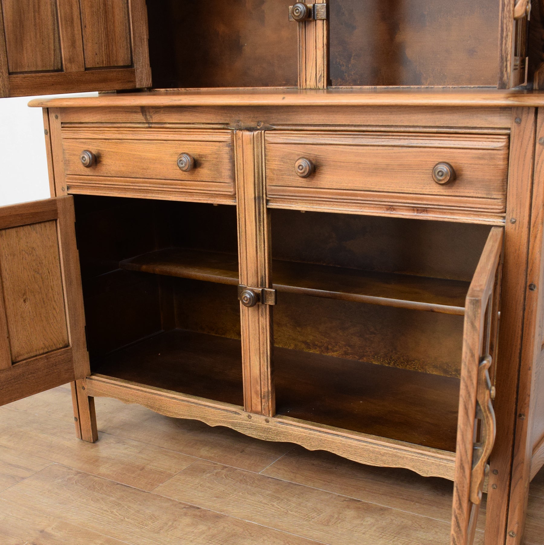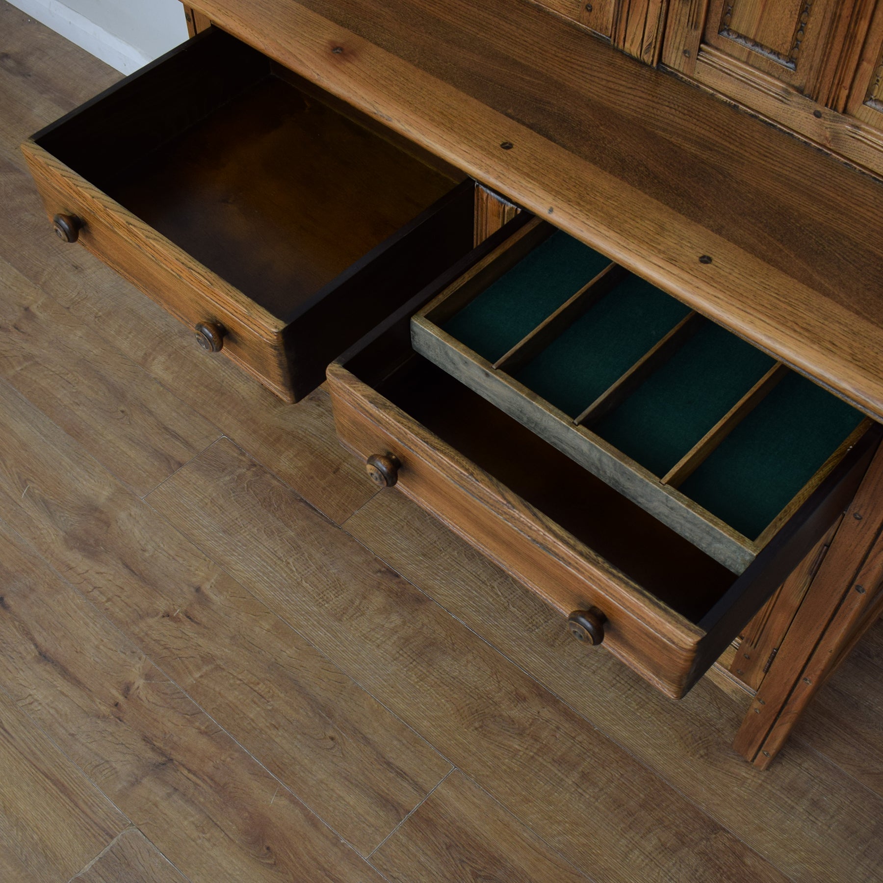 The base has a large double cupboard and two robust ample drawers above, ideal for storing pots, pans, plate ware, and cutlery. The top section is traditionally used as a drinks cabinet and provides plenty of space for bottles and glasses.