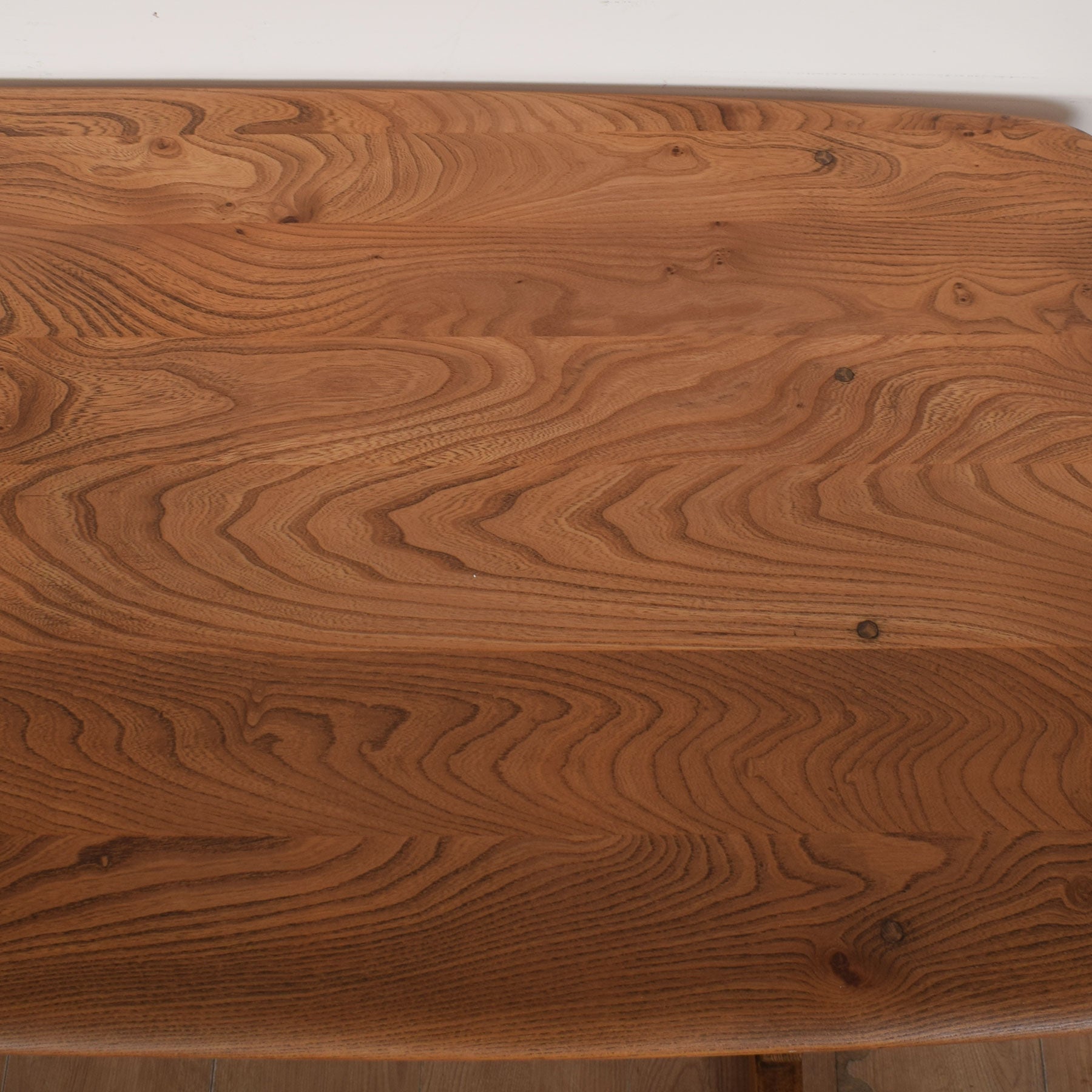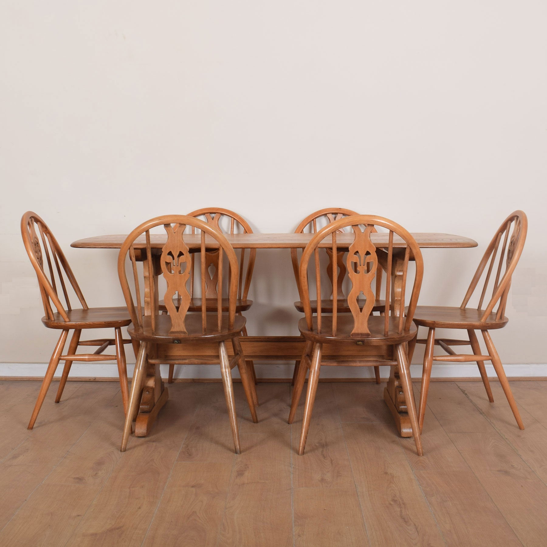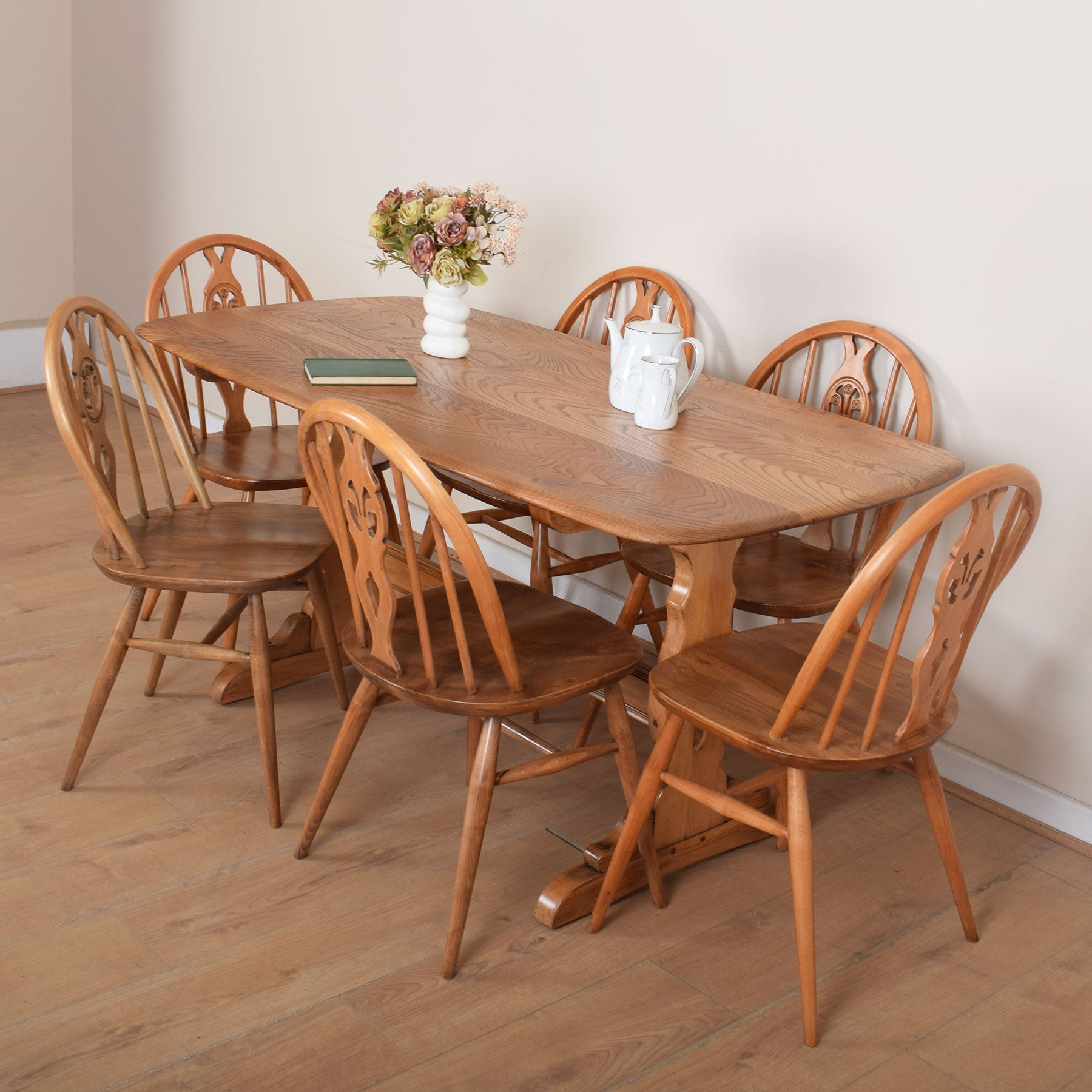 The large refectory-style dining table comfortably accommodates a family of six, with potential space for a couple of additional guests as required. The six accompanying 'fleur-de-lys' chairs feature the same characteristic Ercol style and quality.  The frames of the table and the chairs are constructed from beech. The seat pads and tabletop are made from elm.