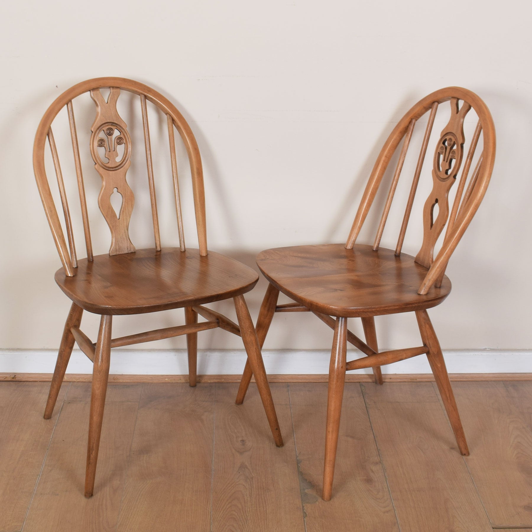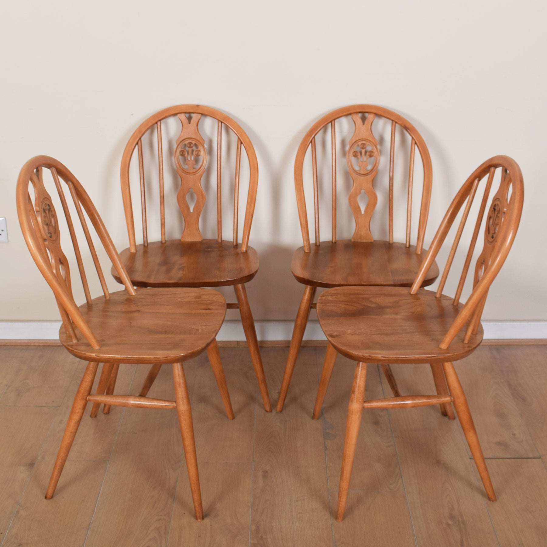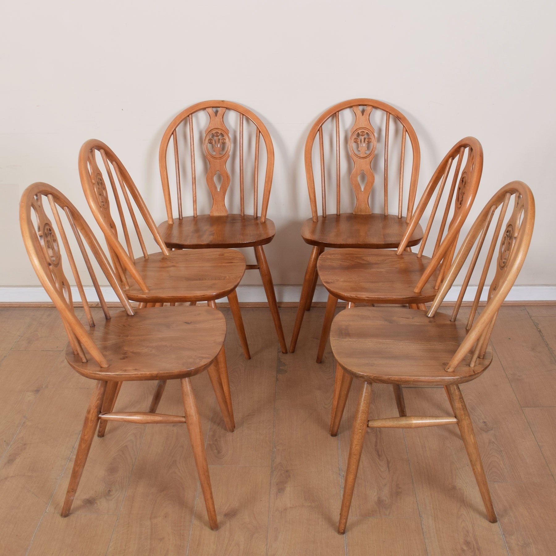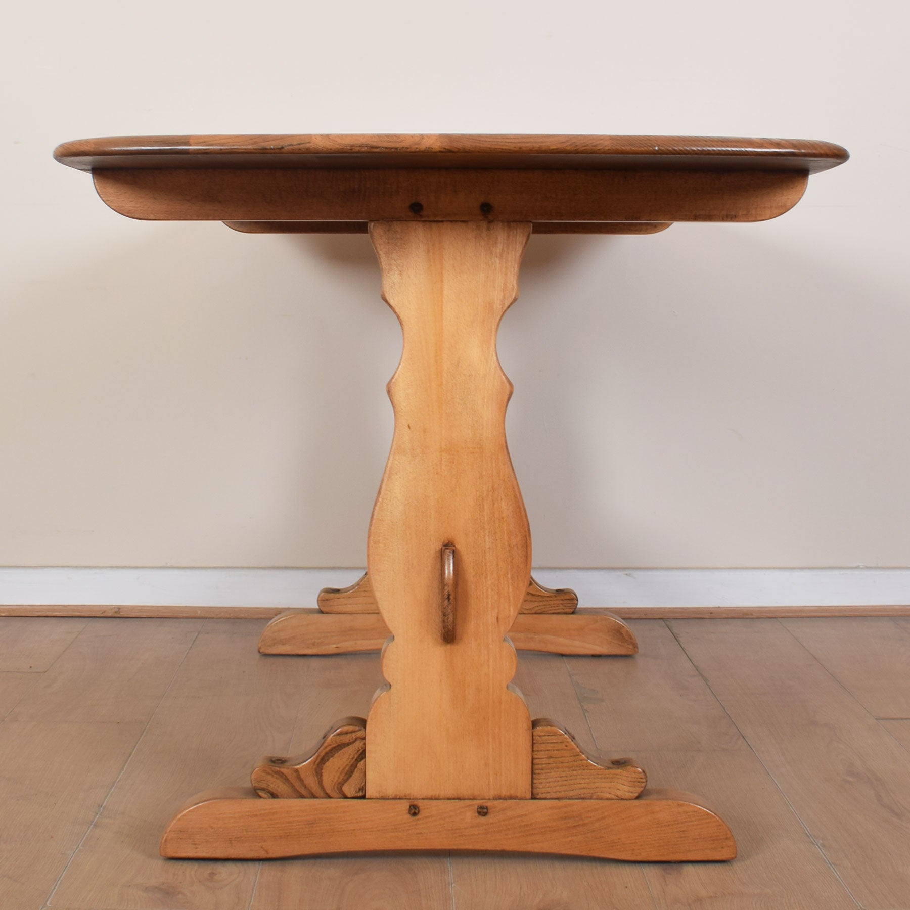 The large refectory-style dining table comfortably accommodates a family of six, with potential space for a couple of additional guests as required. The six accompanying 'fleur-de-lys' chairs feature the same characteristic Ercol style and quality.  The frames of the table and the chairs are constructed from beech. The seat pads and tabletop are made from elm.