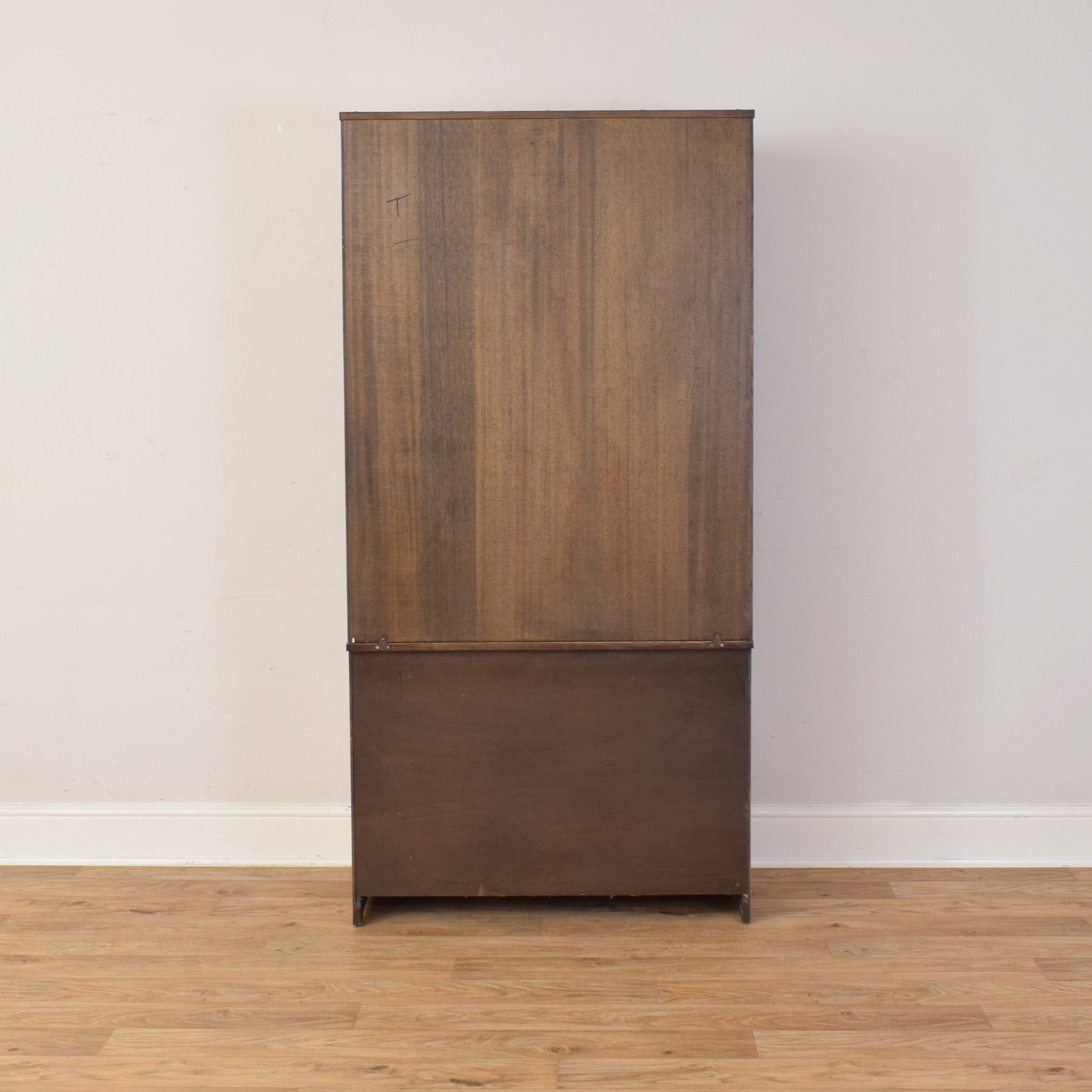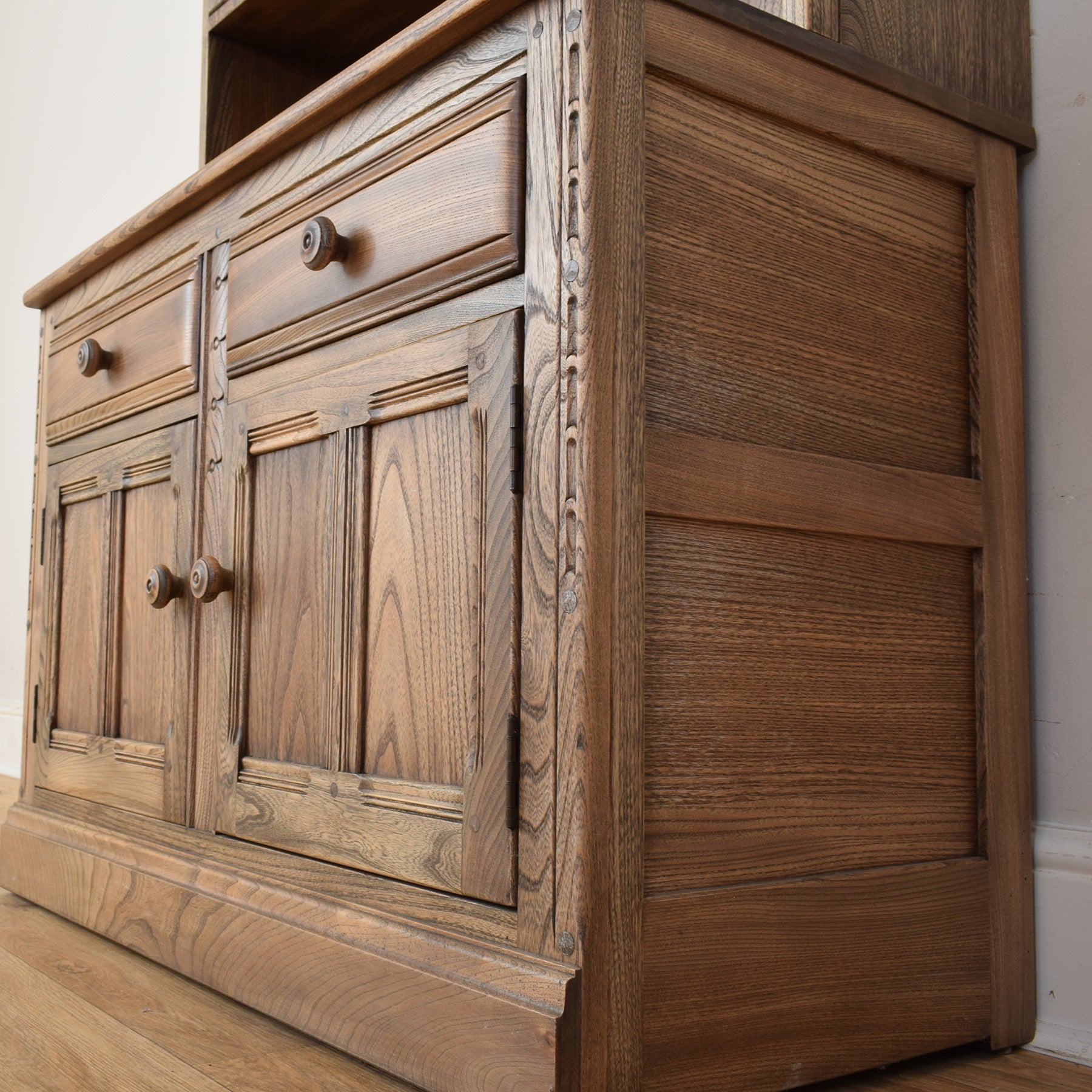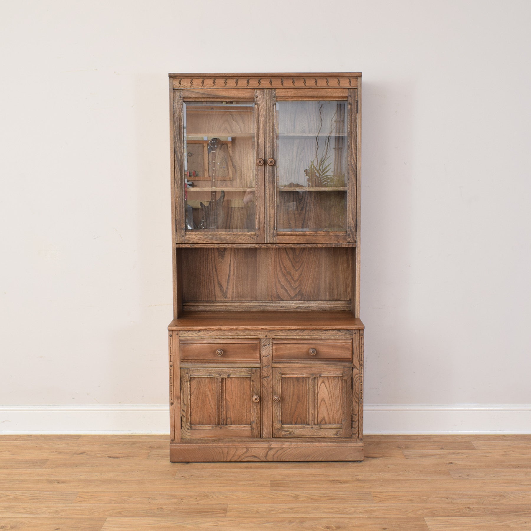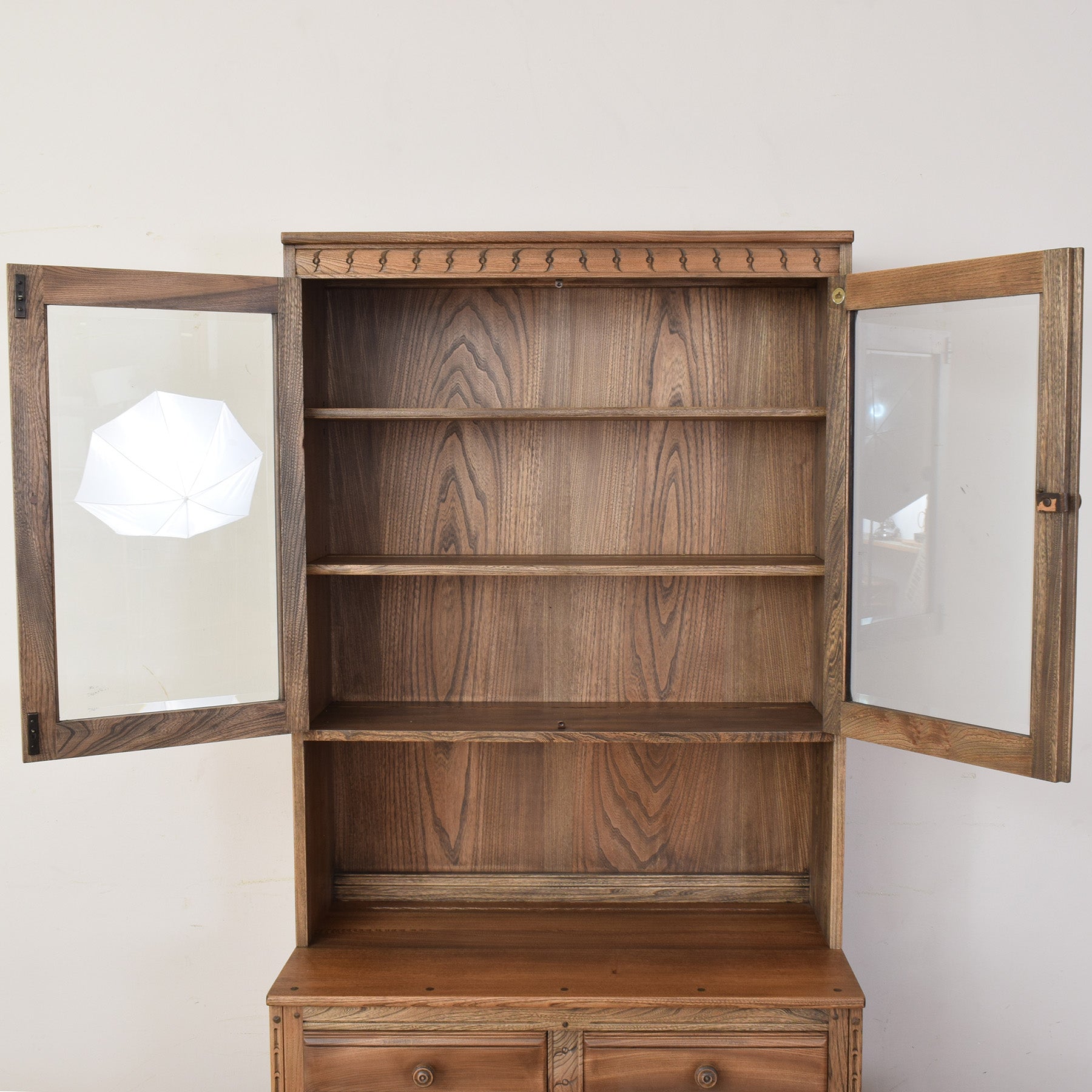 The piece features a glazed upper cabinet with shelving, ideal for displaying crockery, glassware, or books, while the open middle section provides a useful serving or preparation surface. Below, two drawers and a double-door cupboard offer generous concealed storage. The distinctive Ercol detailing, including the clean lines and solid wood framing, gives the piece a timeless character that suits both traditional and more contemporary interiors.