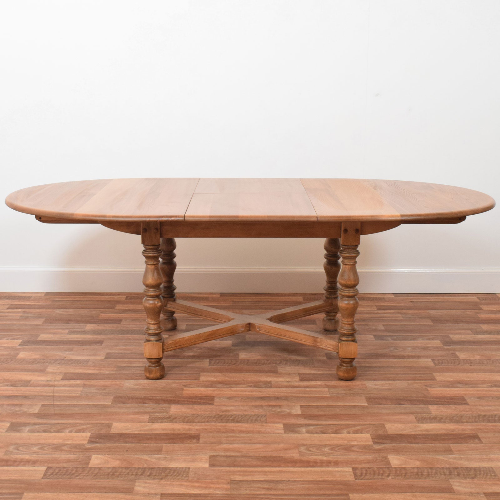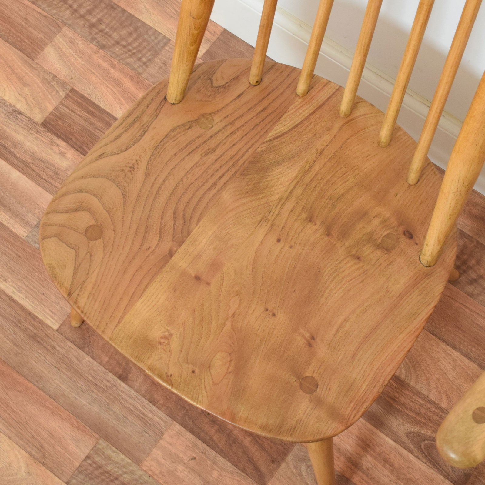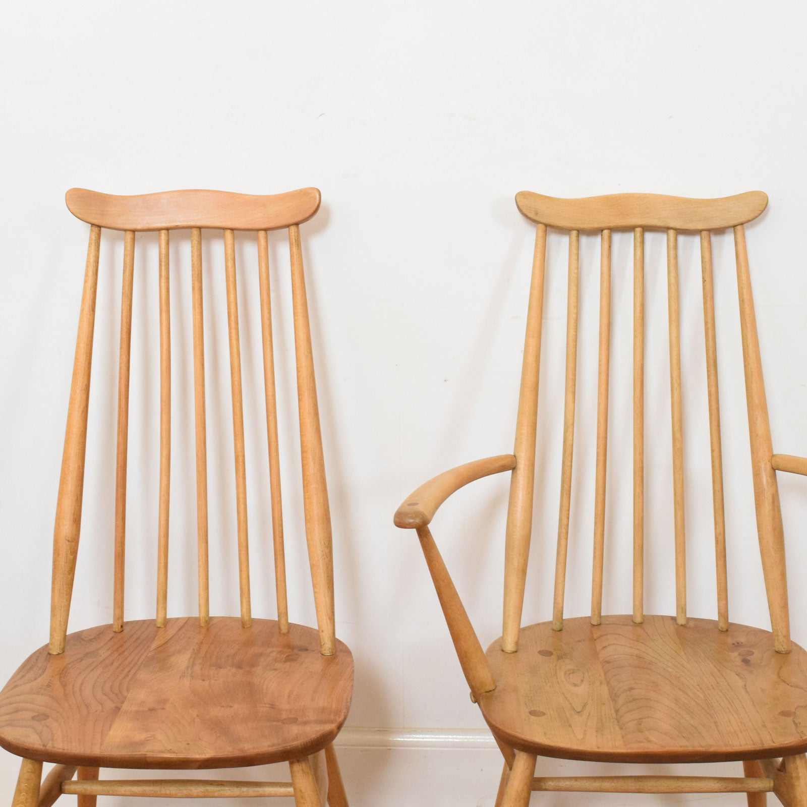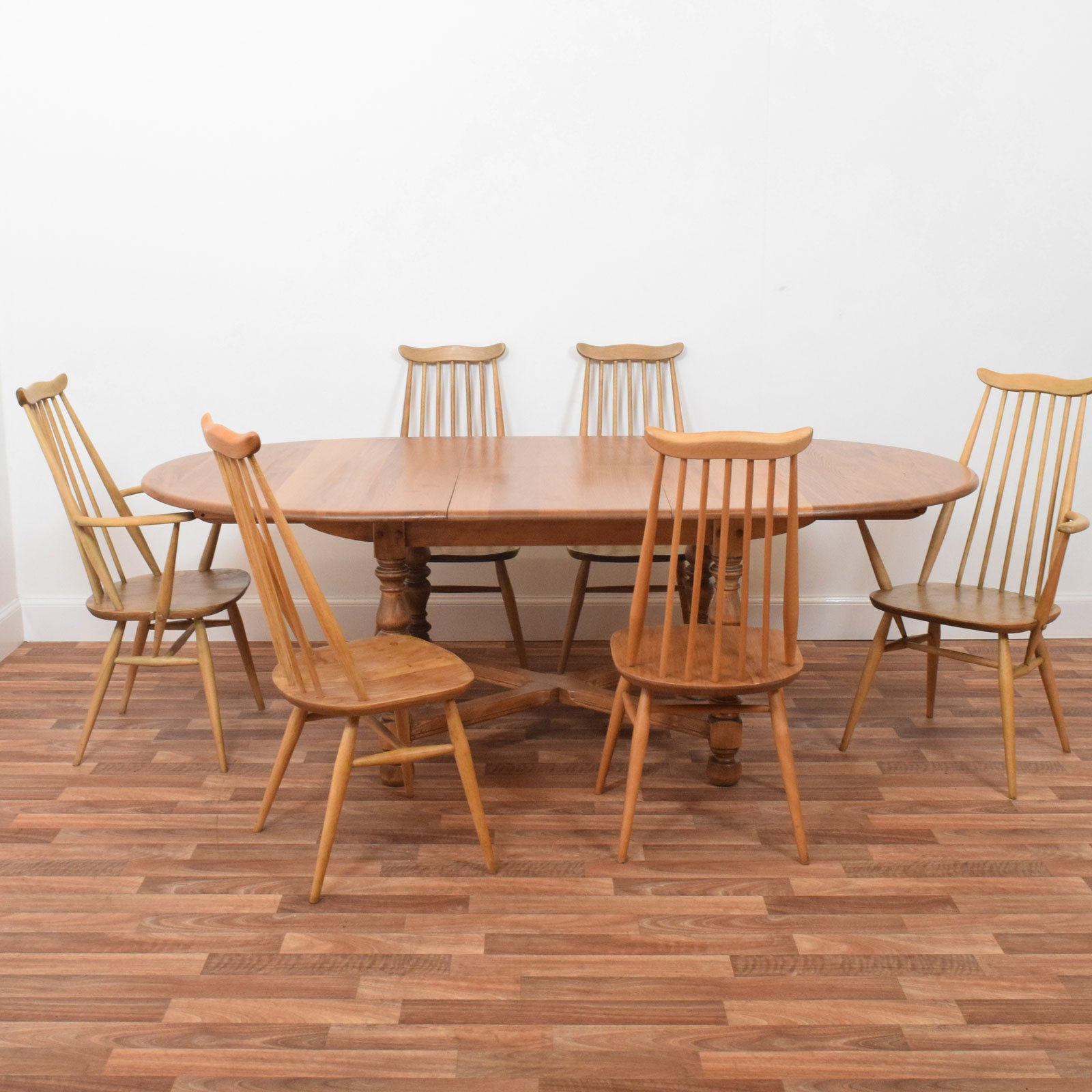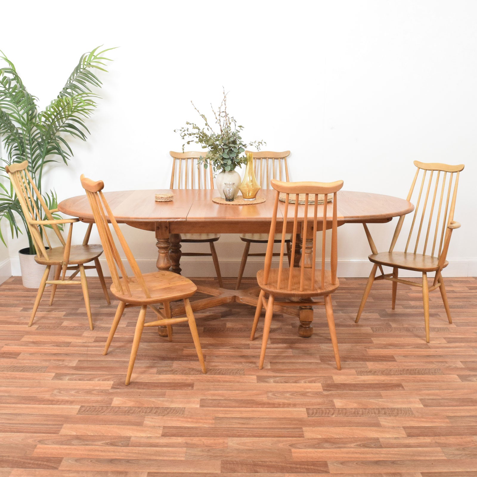 The set includes a spacious oval dining table with a central folding leaf, and six classic Ercol Windsor chairs—two with arms and four without. The table features softly rounded edges and attractive wood grain, while the chairs are crafted with slender spindles and sculpted seats, offering both comfort and support. The central leaf folds away neatly beneath the table, allowing the top to contract easily for more compact use. The complete tabletop and base—including the folding leaf—is made from elm. The chairs themselves are constructed from a combination of solid elm and beech.