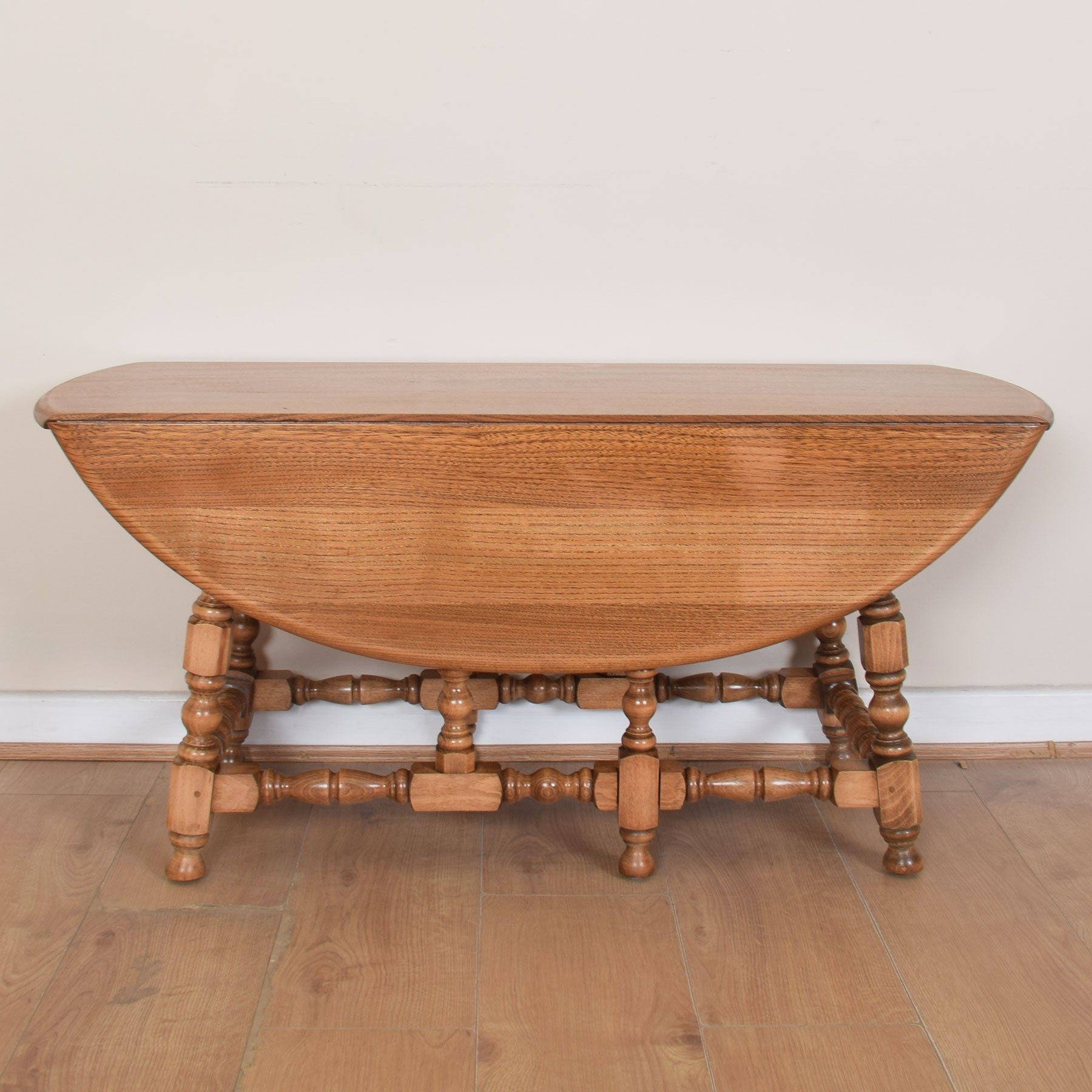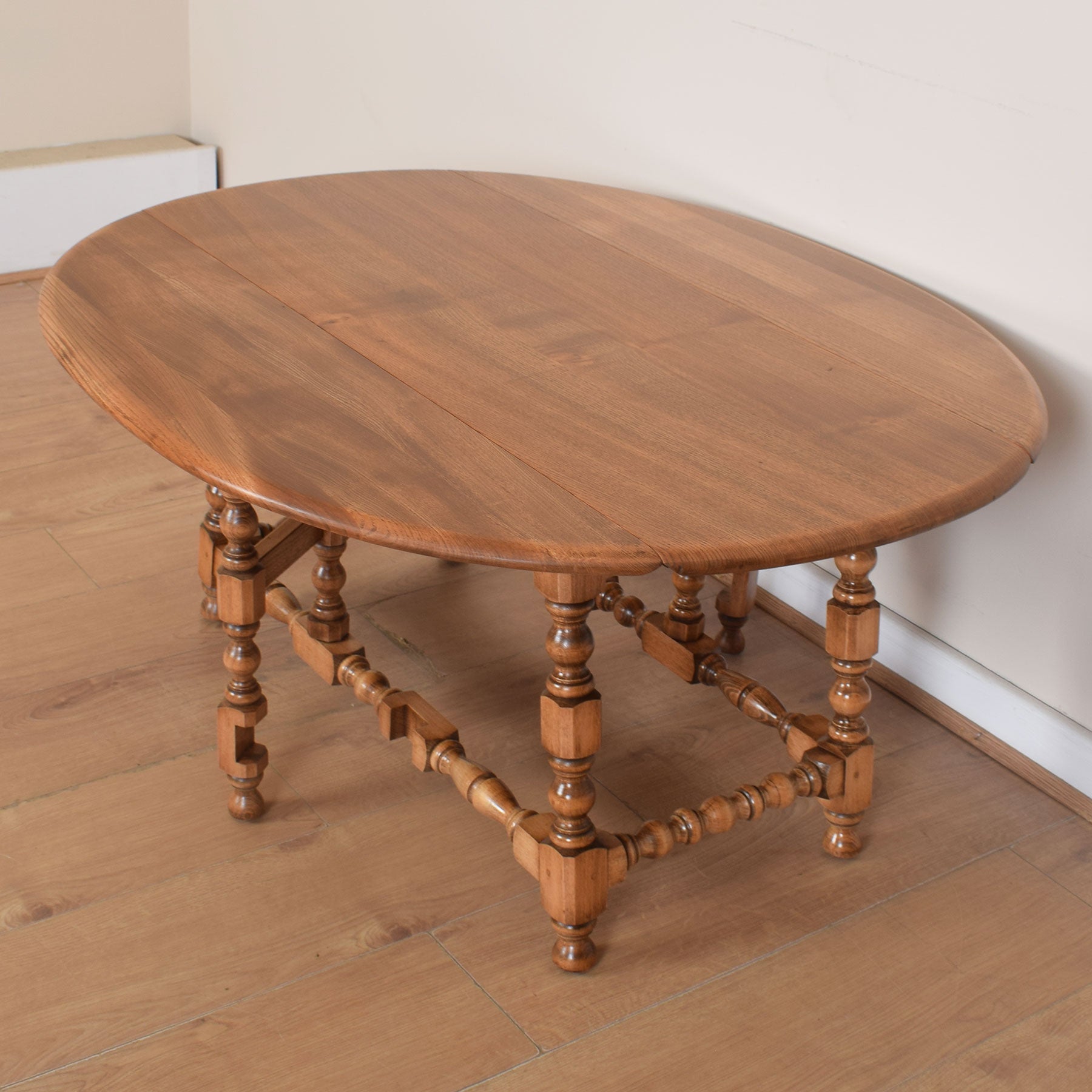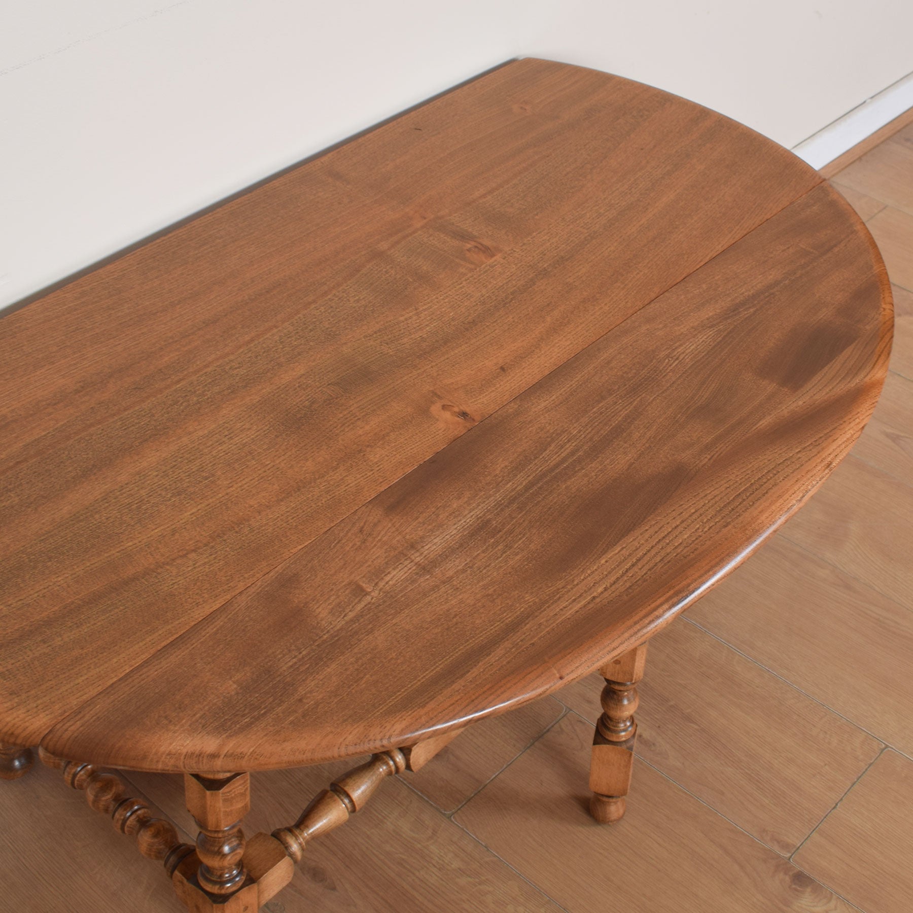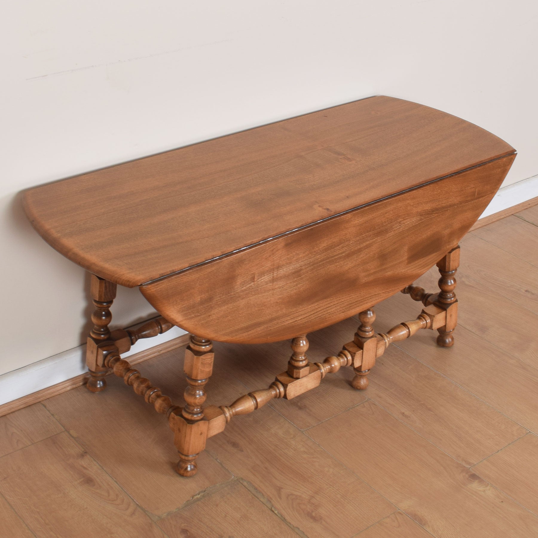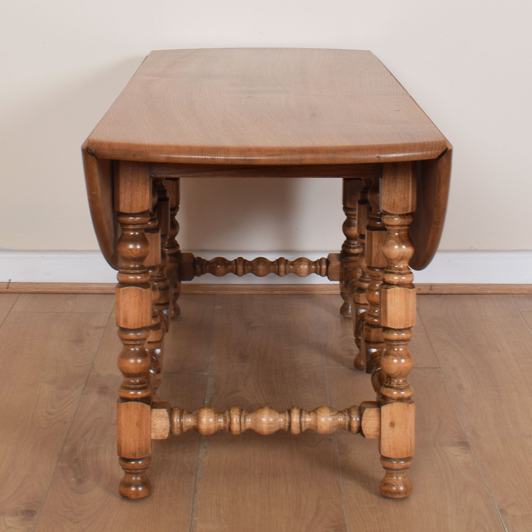 The richly grained drop-leaf tabletop offers ample space to serve tea or coffee, along with a variety of light refreshments. Each extending leaf can be raised or lowered independently as required, supported securely in place by the traditional gate-leg frame. This quality-made Ercol piece is solid elm throughout.