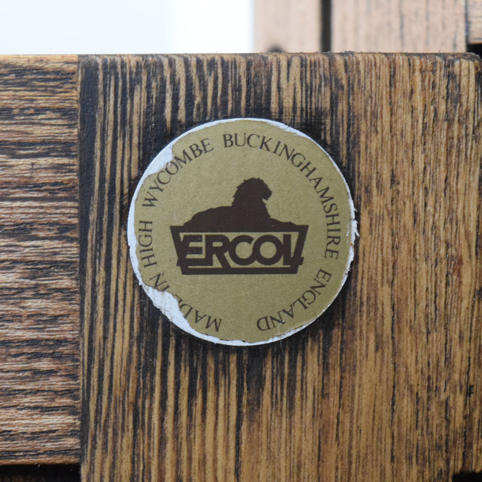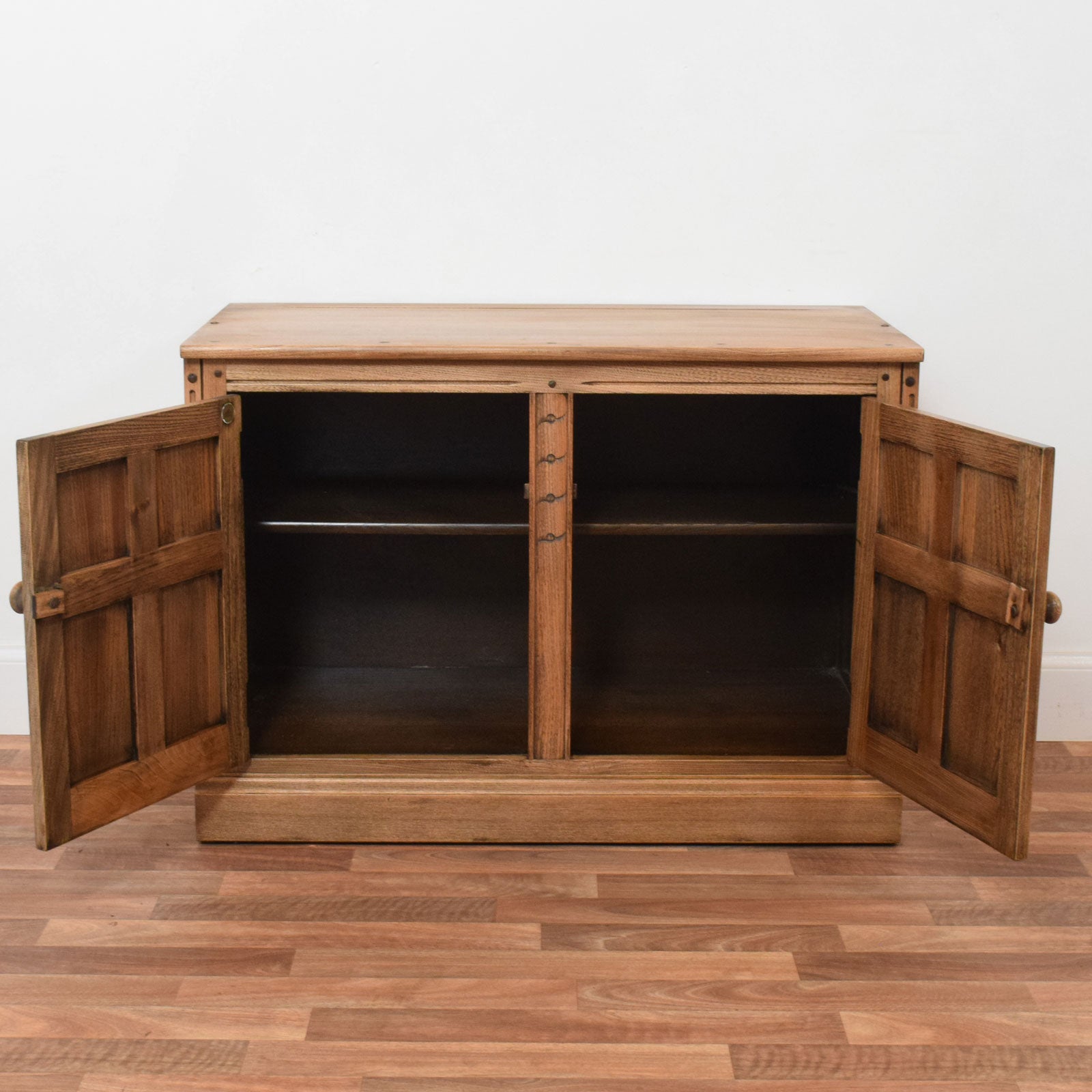 This Ercol low sideboard features the brand’s distinctive craftsmanship and decorative detailing. The front is fitted with two cupboard doors, each with carved panel detailing and round wooden handles, opening to reveal a spacious interior fitted with a shelf for organised storage. Decorative carved accents along the centre panel and door frames add character, while the solid top with gently rounded edges highlights the attractive natural grain. The original Ercol badge is also present, confirming its manufacture in High Wycombe, England.