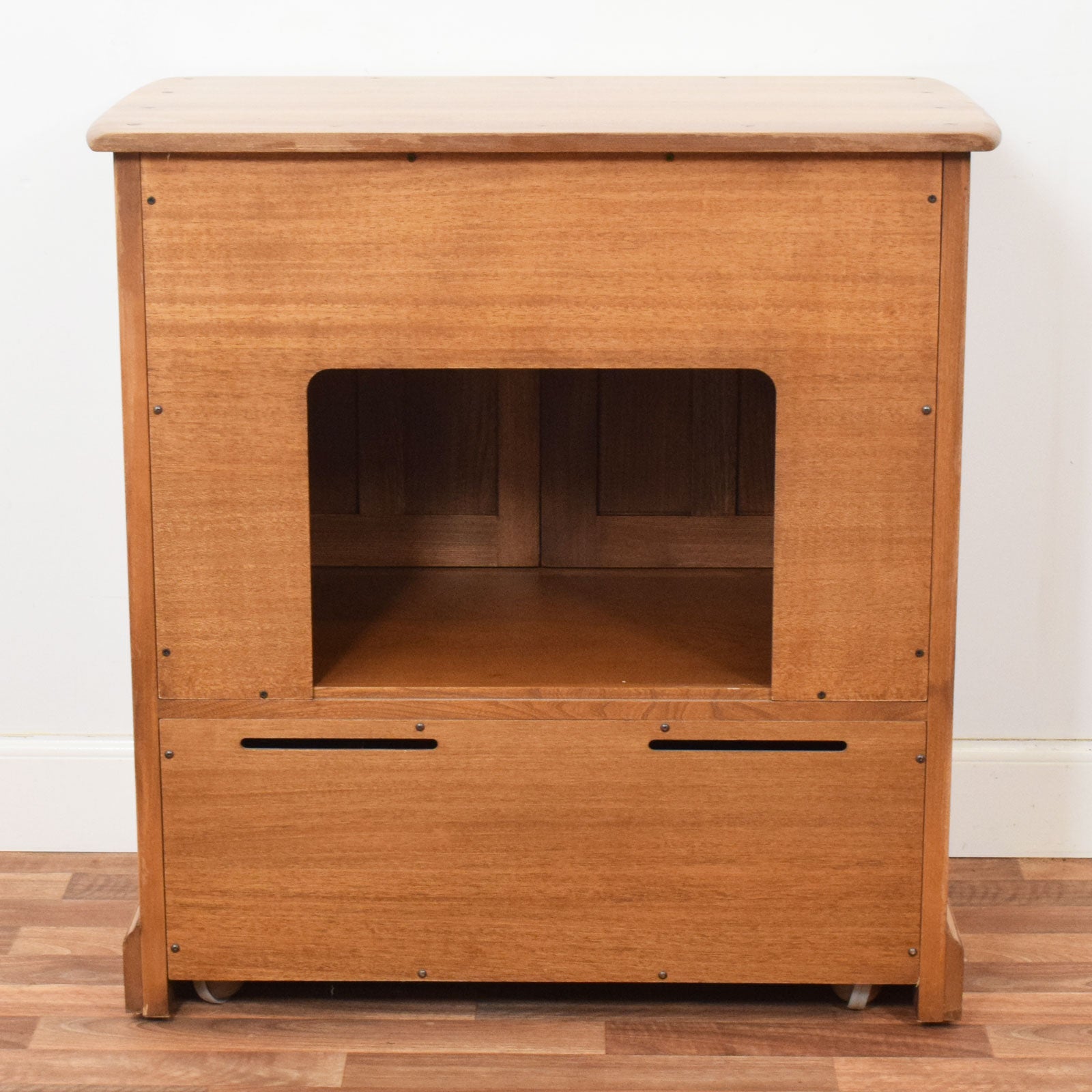 Crafted from solid elm, the cabinet features a pair of panelled doors that open and retract smoothly into the body of the unit, allowing full access to the internal compartment without taking up additional space. Below, a drop-down front panel reveals a lower section ideal for storing a DVD player, games console, or other accessories. The open back ensures proper ventilation and easy cable management. The original turned wooden handles remain in place, and the piece is set on robust metal casters, making it easy to move as needed while remaining stable in use.